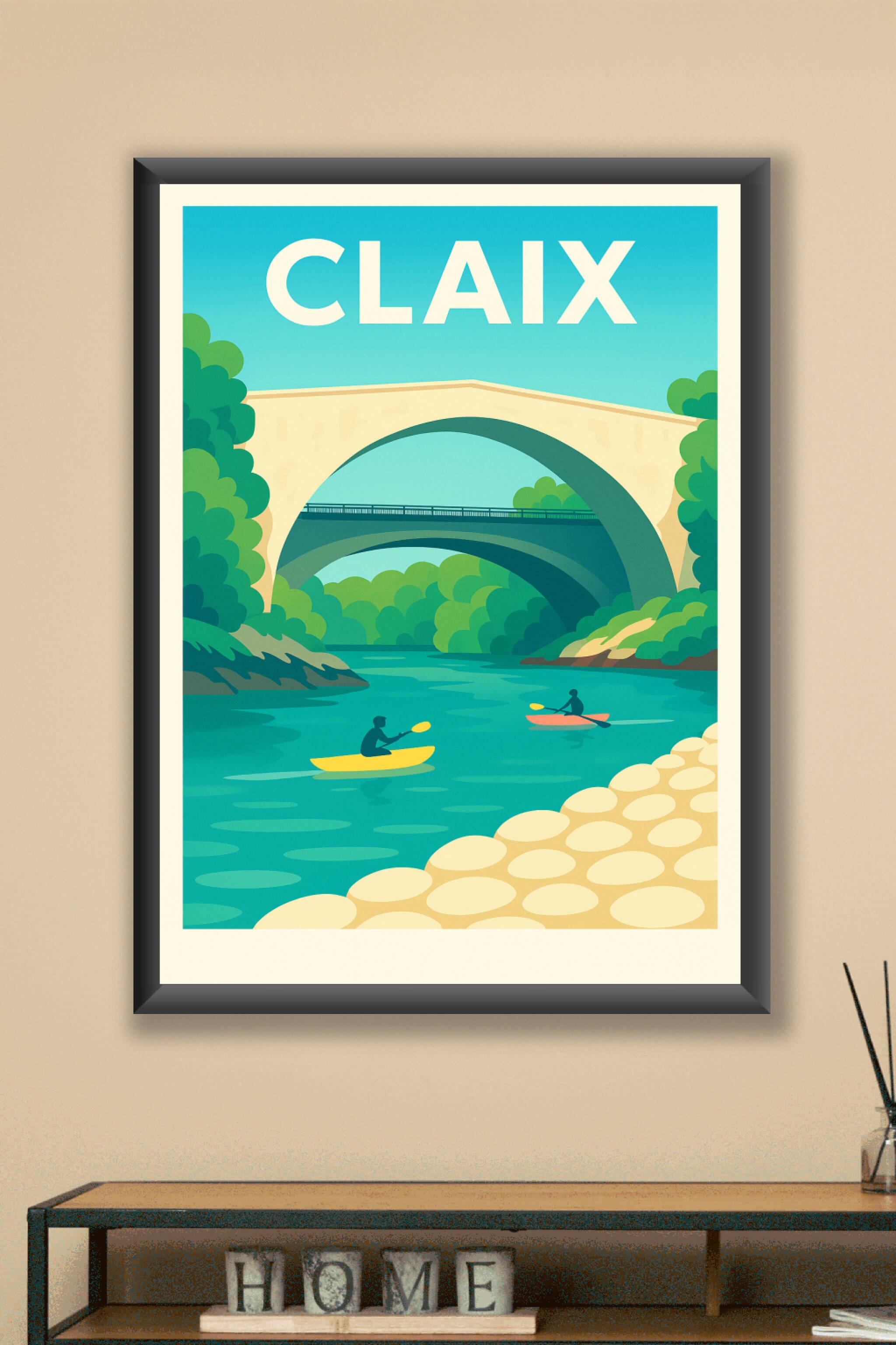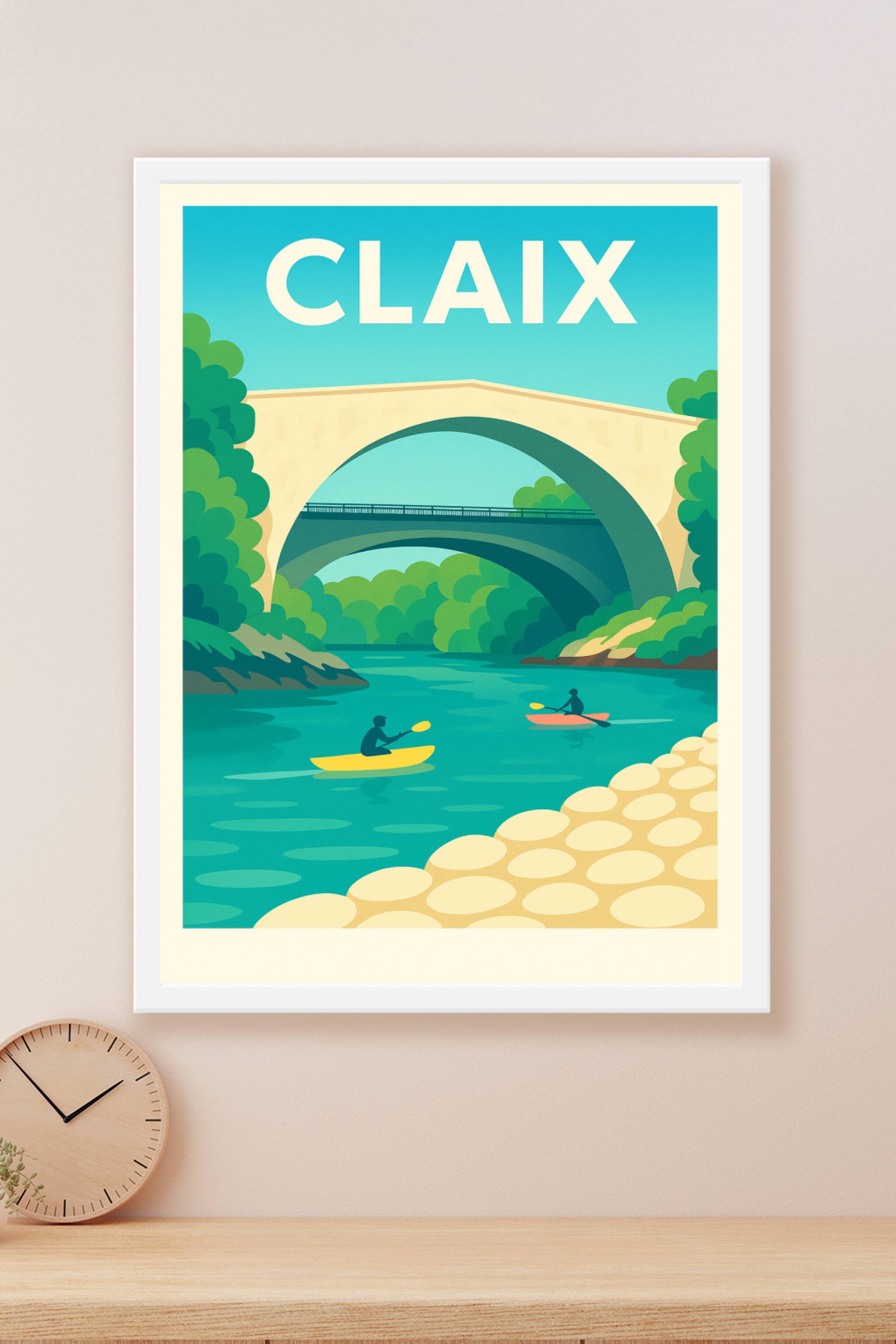 Découvrez la sérénité de Claix avec cette affiche illustrée mettant en scène deux kayakistes glissant doucement sous les arches harmonieuses d'un p...