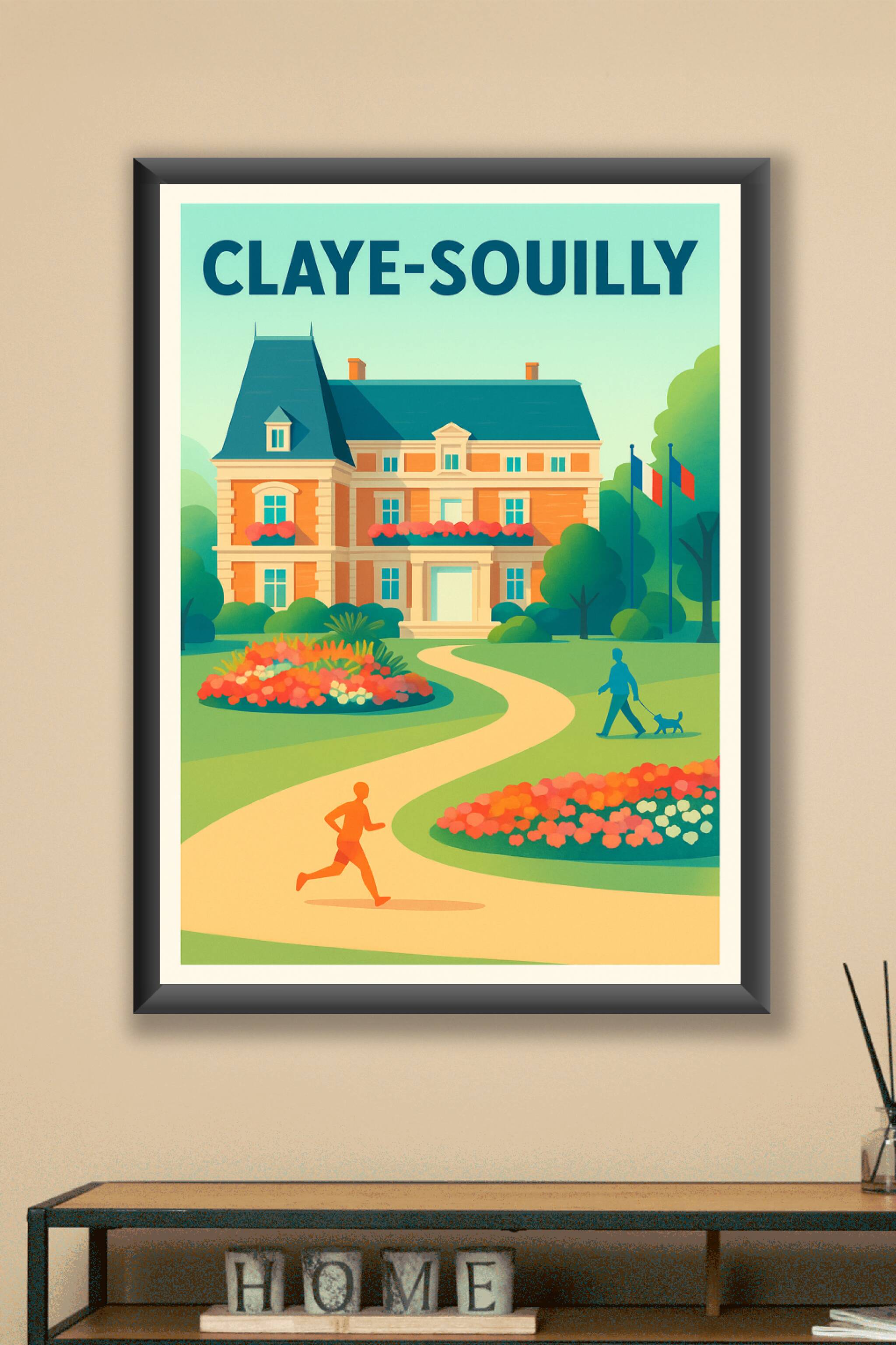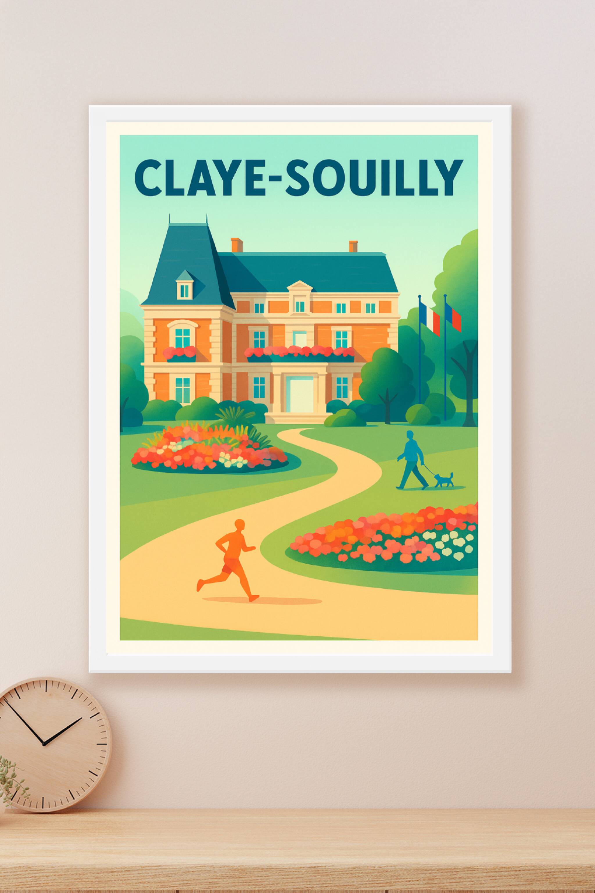 Découvrez l'élégance et la sérénité de Claye-Souilly avec cette affiche illustrée éclatante mettant en scène ses espaces verts soignés et son archi...