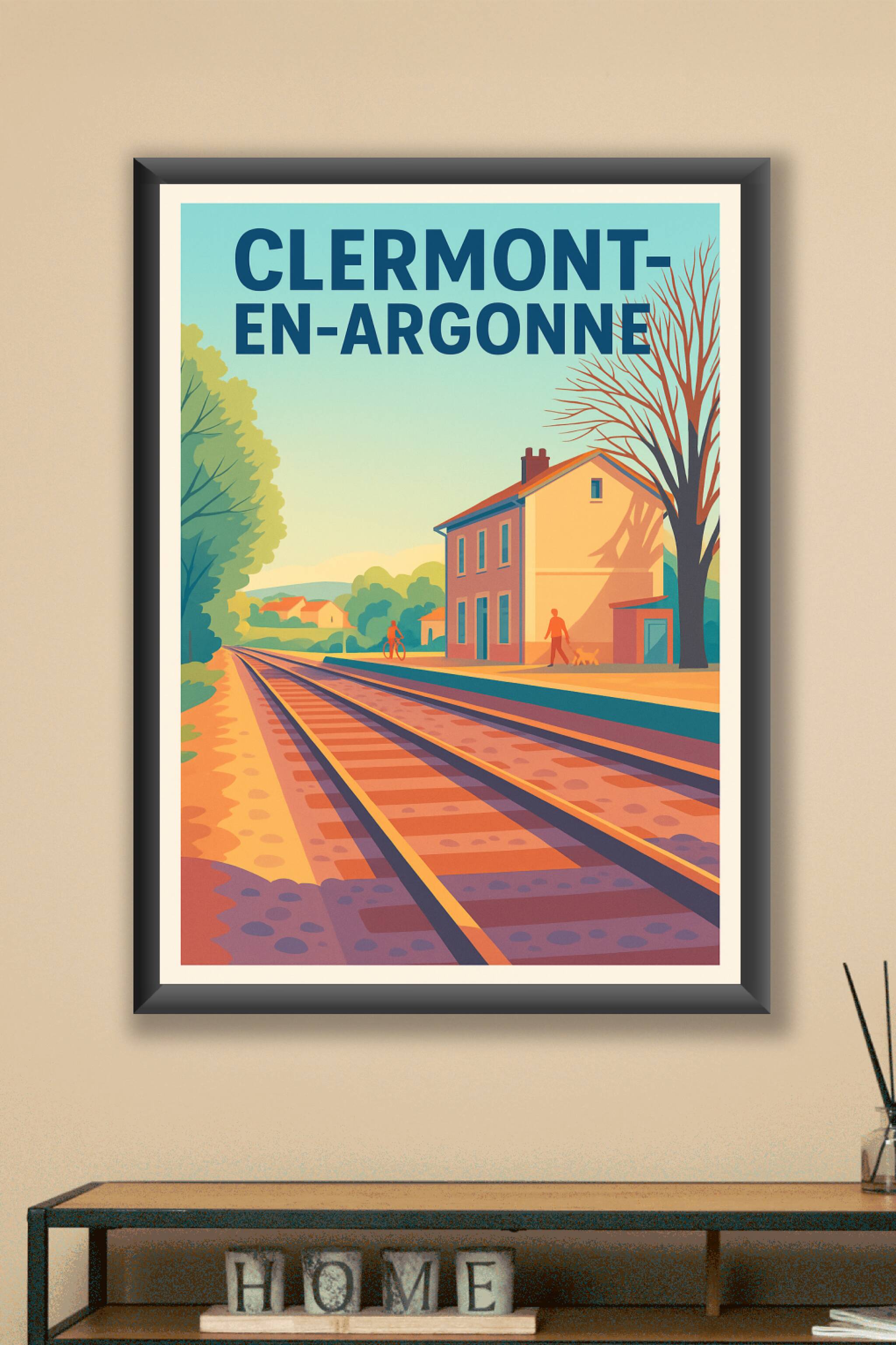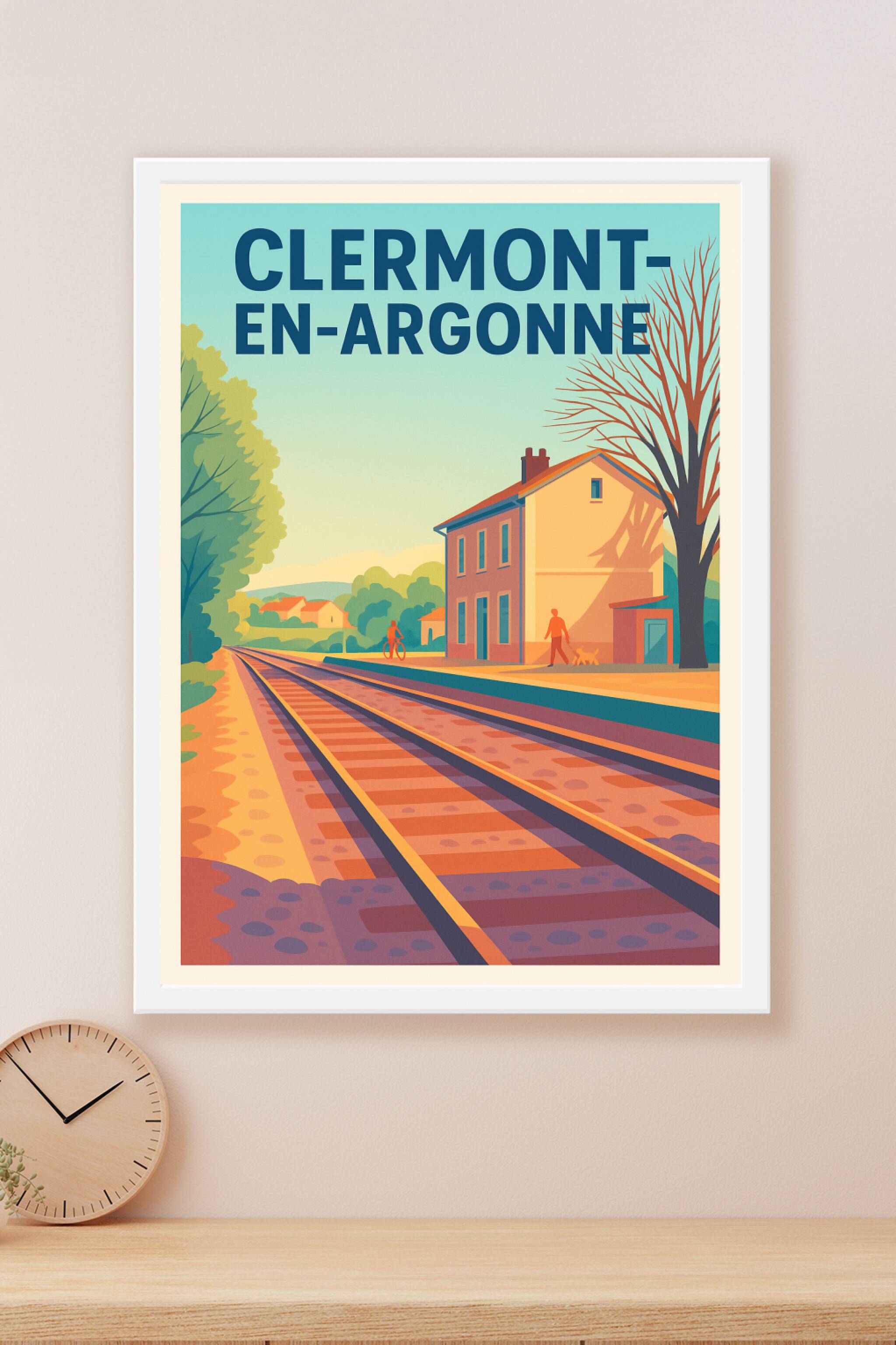 Découvrez l'atmosphère paisible de Clermont-en-Argonne avec cette affiche élégante illustrant la gare et ses environs baignés d'une lumière douce e...