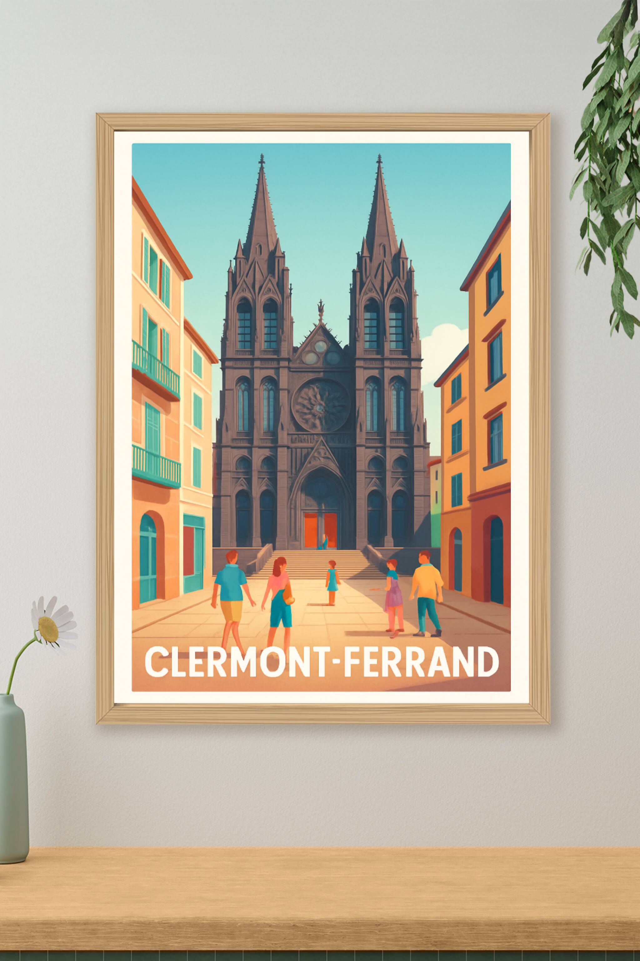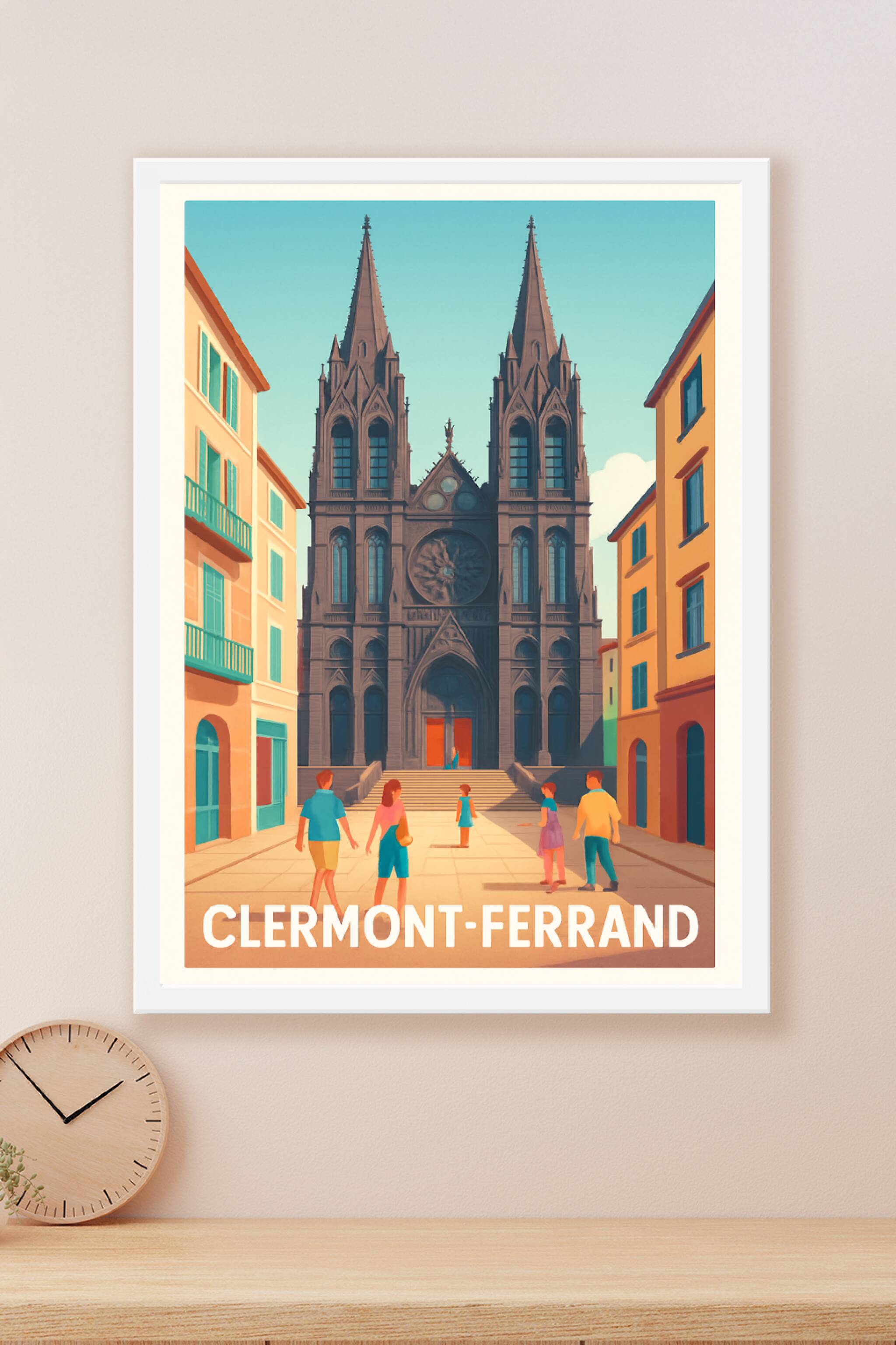 Découvrez l'élégance de Clermont-Ferrand à travers cette affiche illustrée représentant la majestueuse cathédrale Saint-Pierre, emblème architectur...