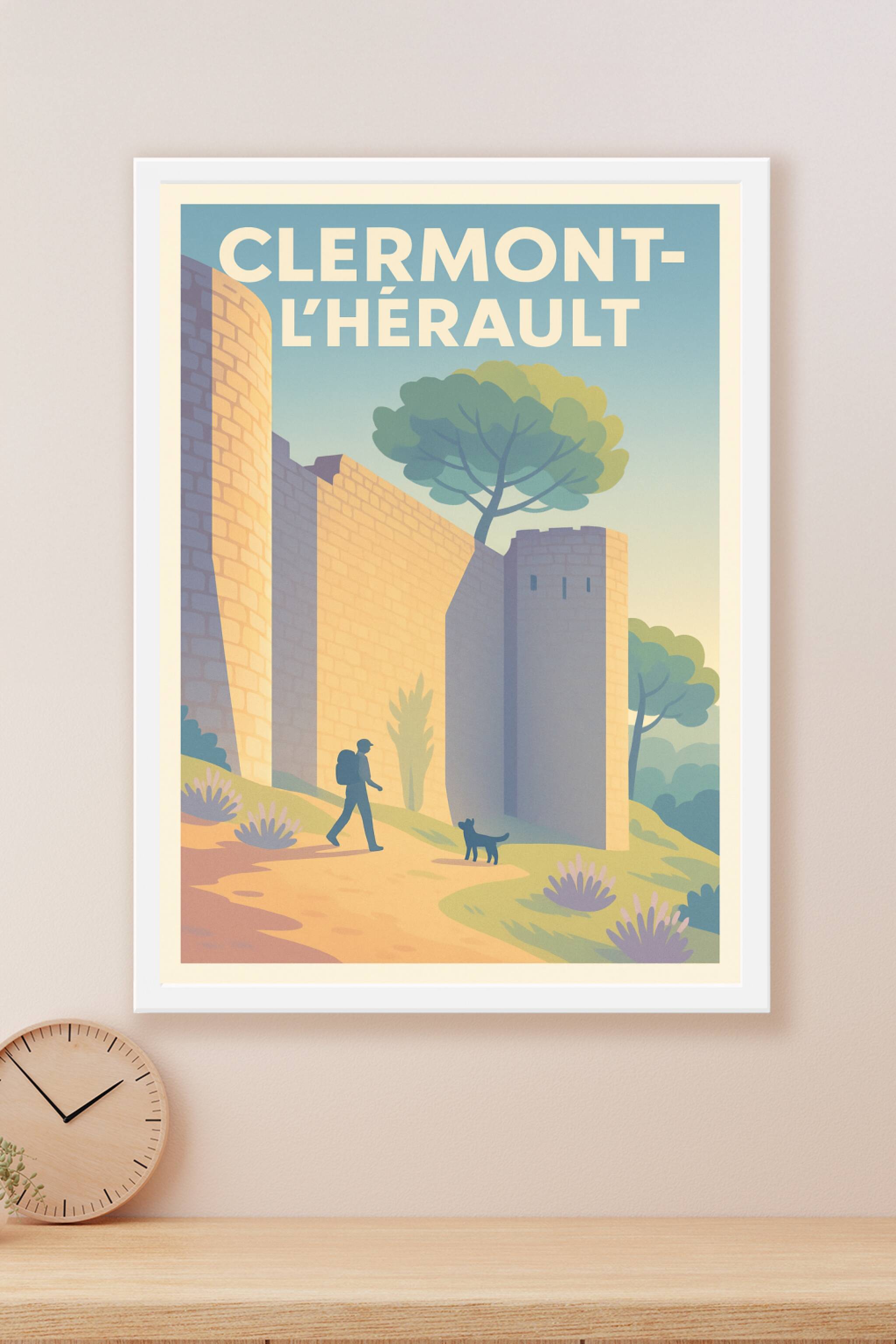Découvrez l'atmosphère sereine et pittoresque de Clermont-l'Hérault grâce à cette affiche illustrée mettant en scène une promenade au pied des remp...