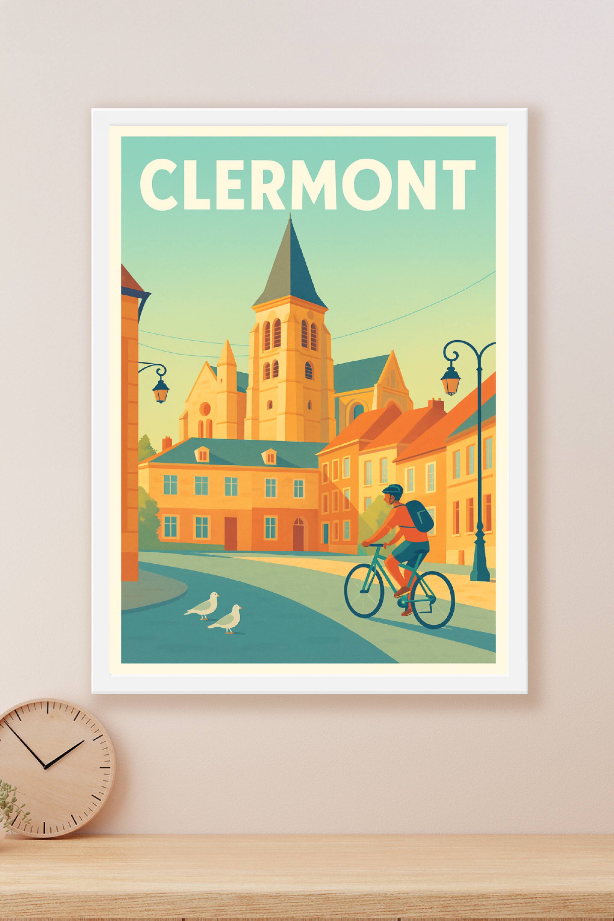 Découvrez Clermont à travers cette affiche chaleureuse et colorée, qui capture l'essence d'une journée ensoleillée dans ses rues pittoresques. Le p...