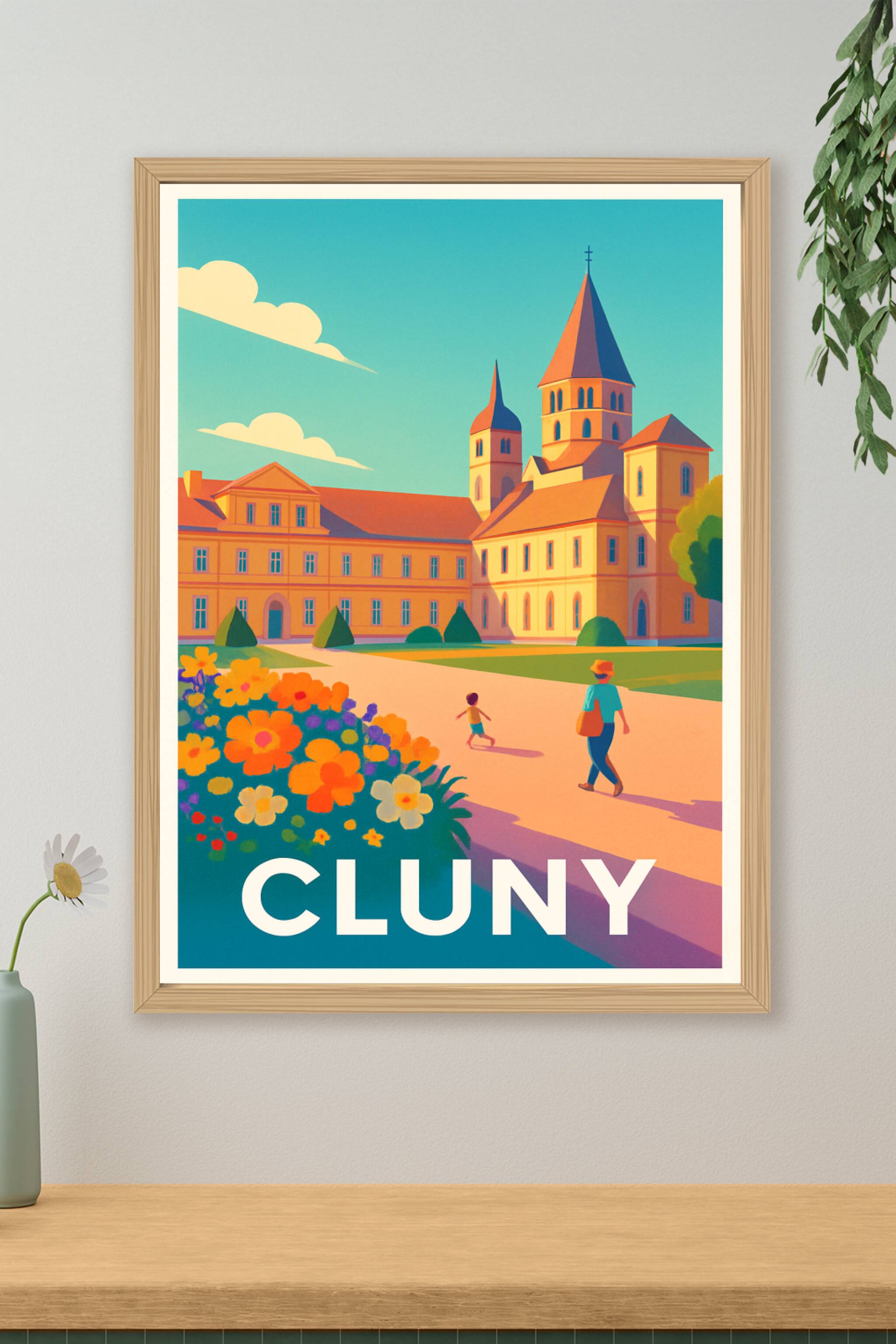 Découvrez le charme historique de Cluny avec cette affiche illustrée qui met en scène l'abbaye emblématique baignée d'une lumière douce et chaleure...
