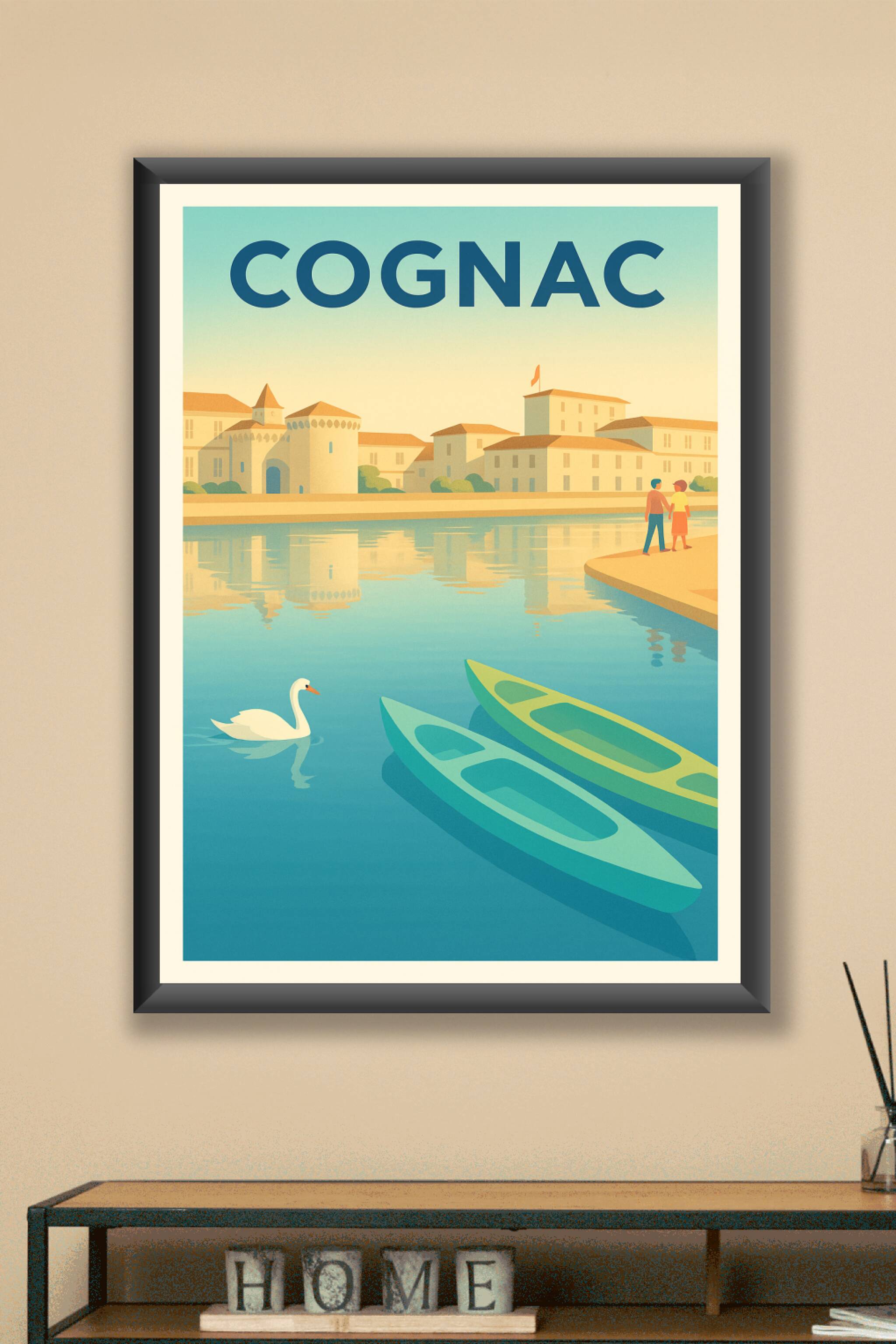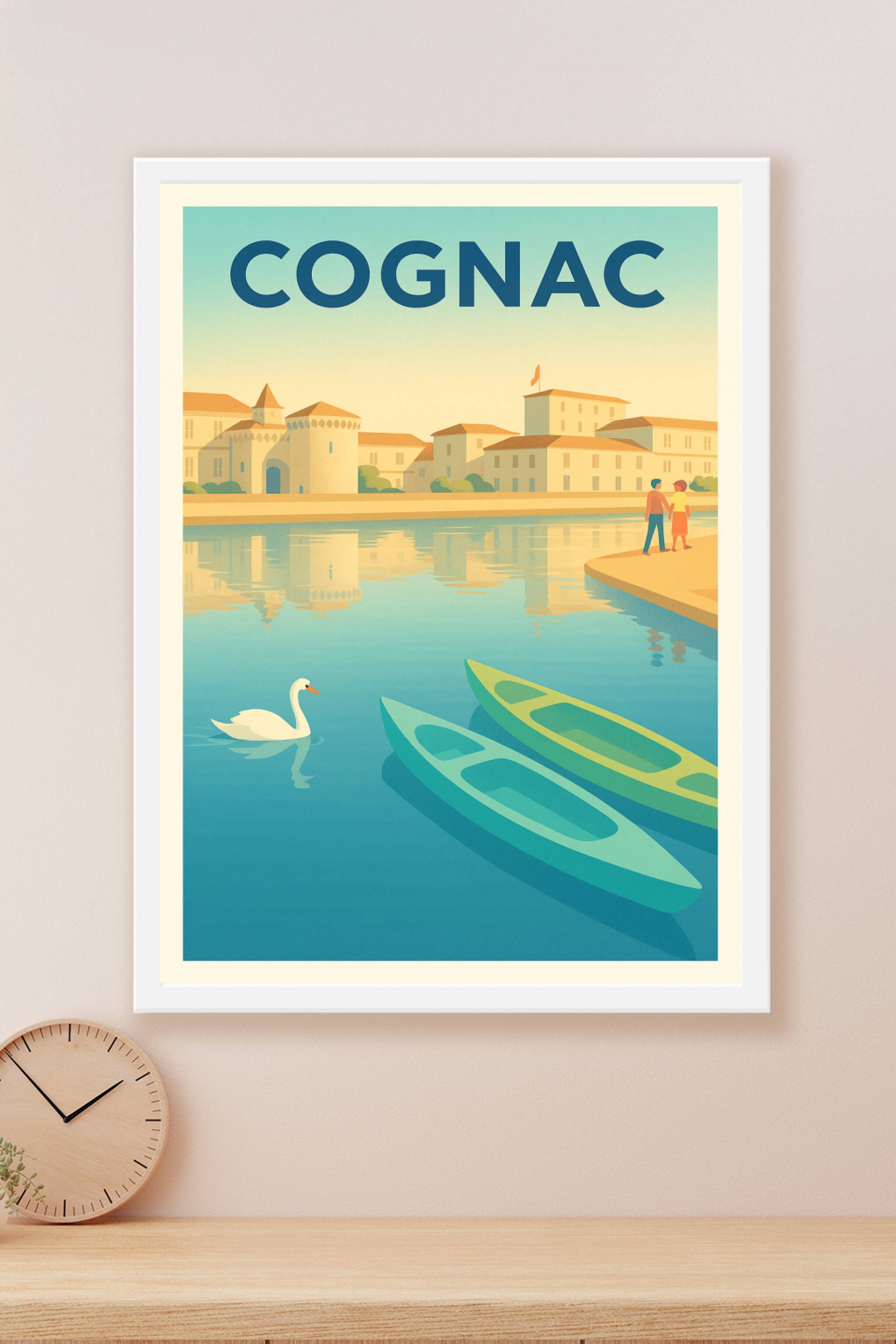 Découvrez la tranquillité et le charme intemporel de Cognac avec cette affiche au design épuré et vintage, mettant en scène une paisible rivière bo...