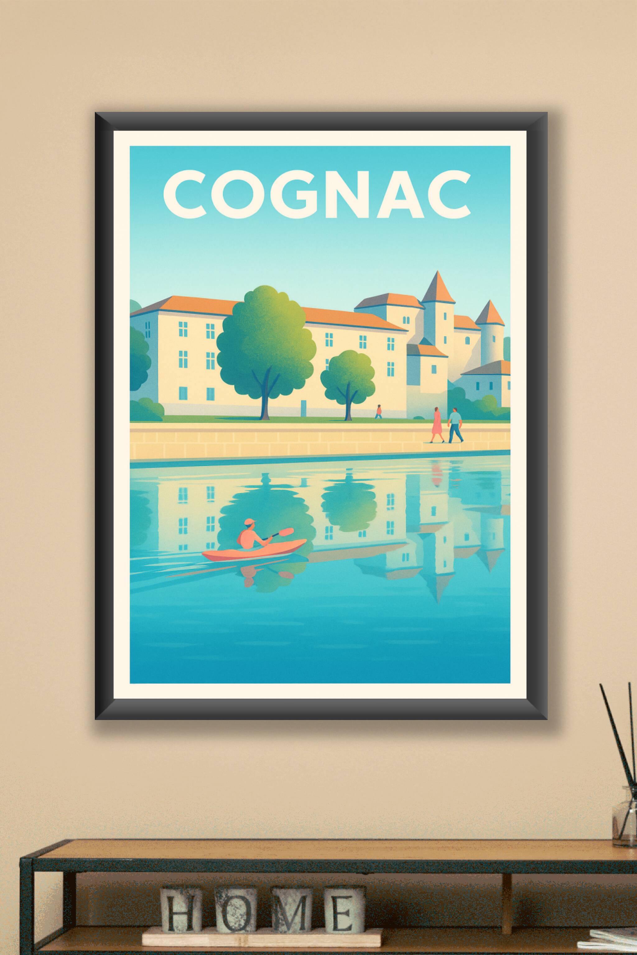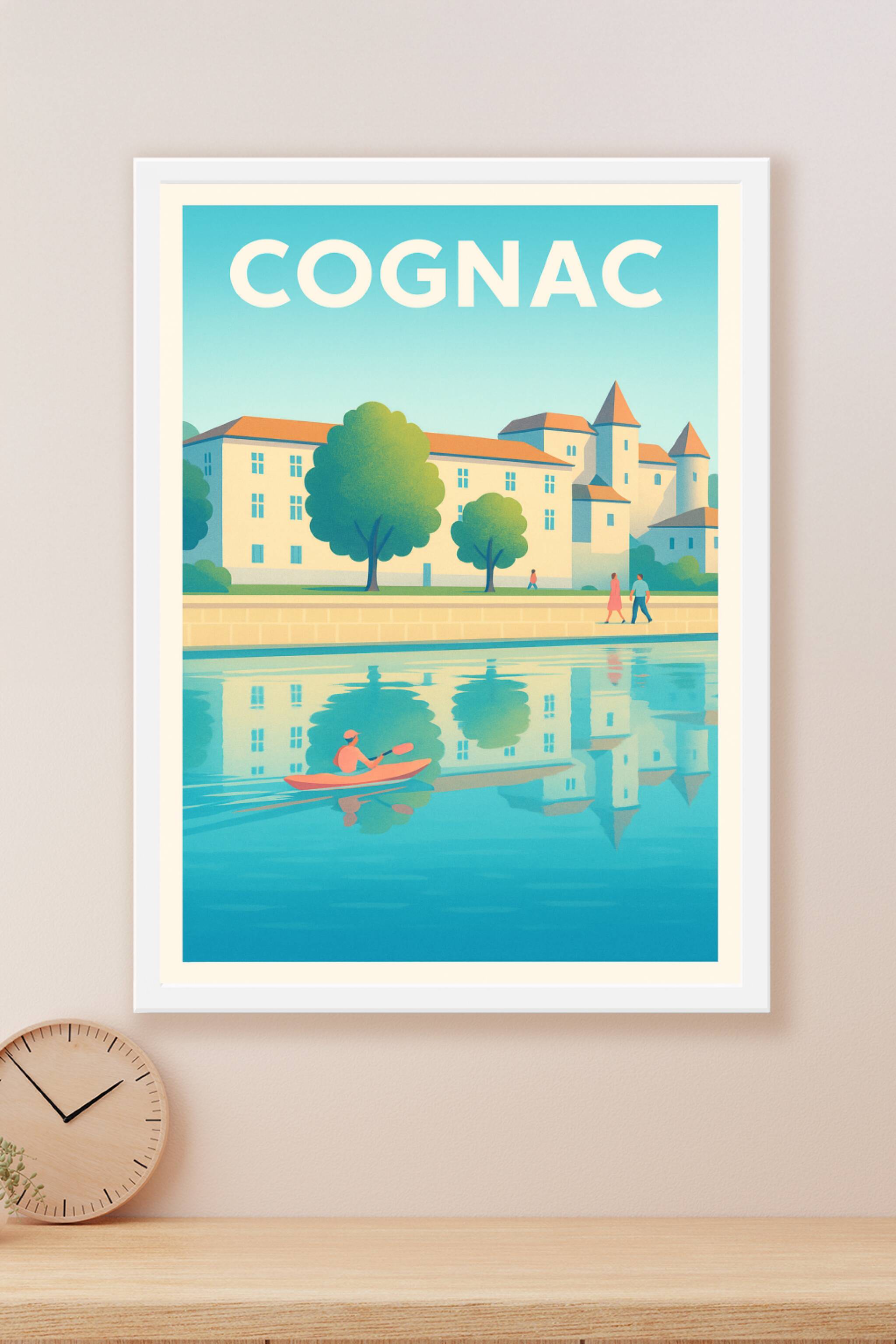 Découvrez l'élégance tranquille de Cognac avec cette affiche illustrée mettant en scène une balade en kayak sur la rivière, reflet parfait des bâti...
