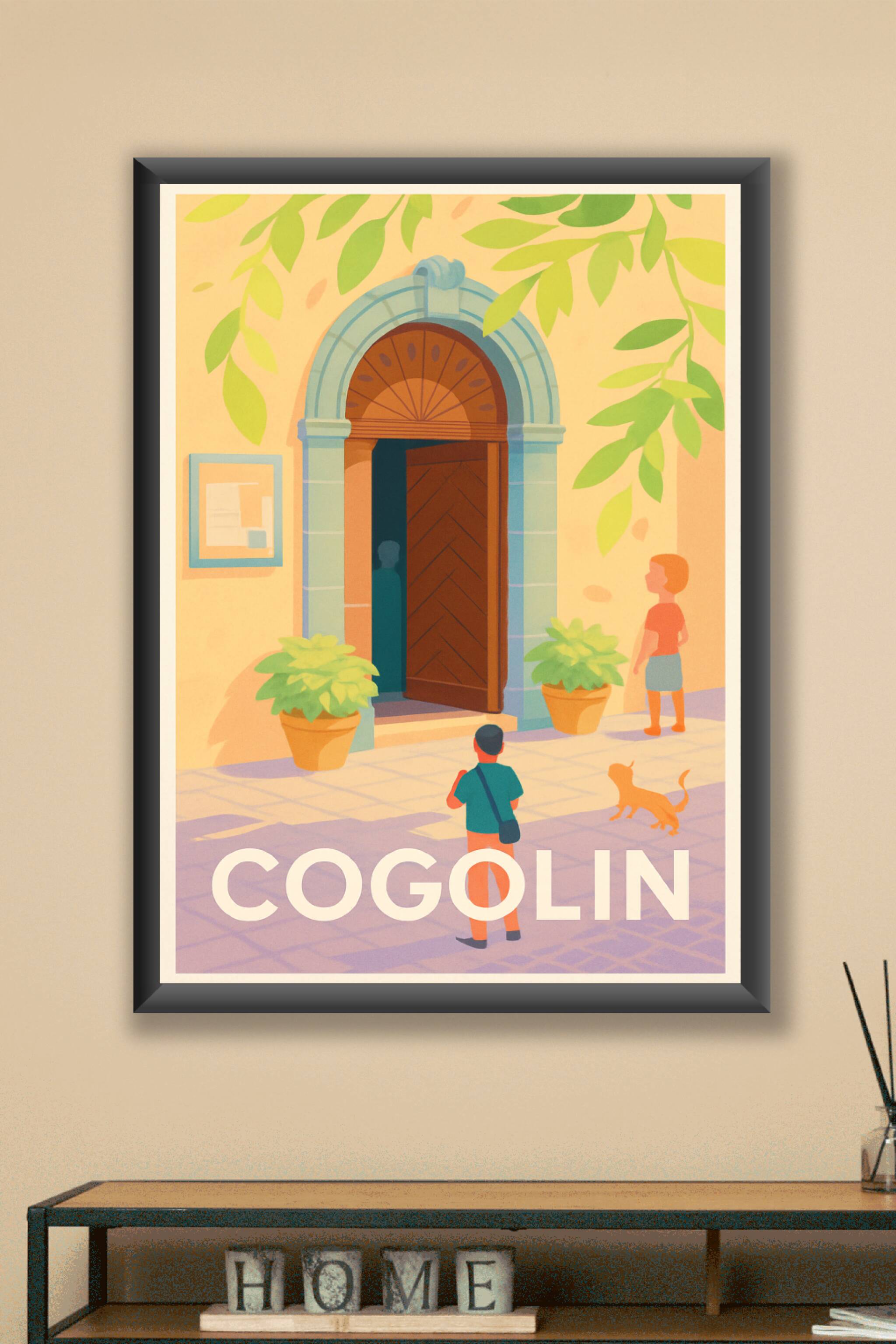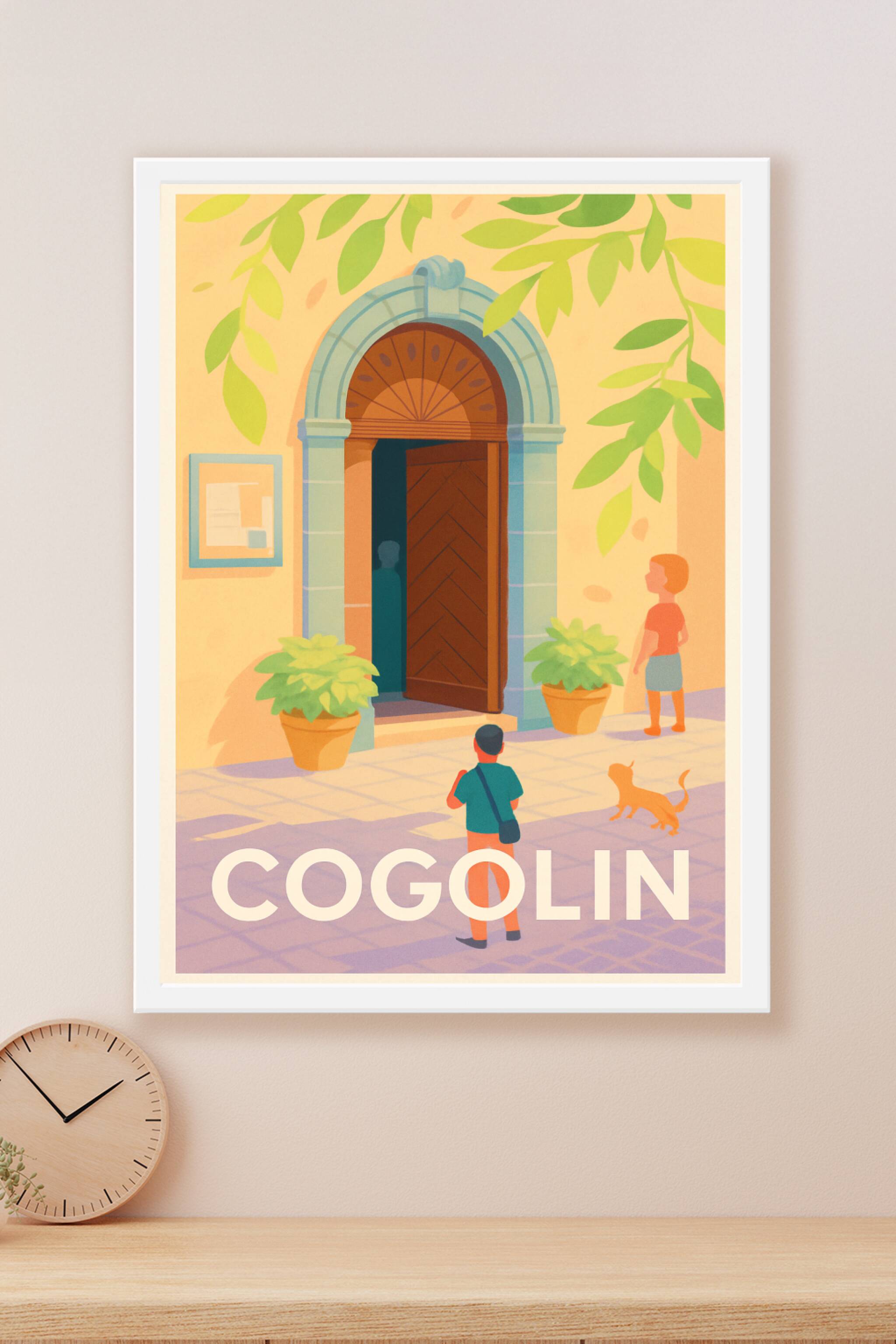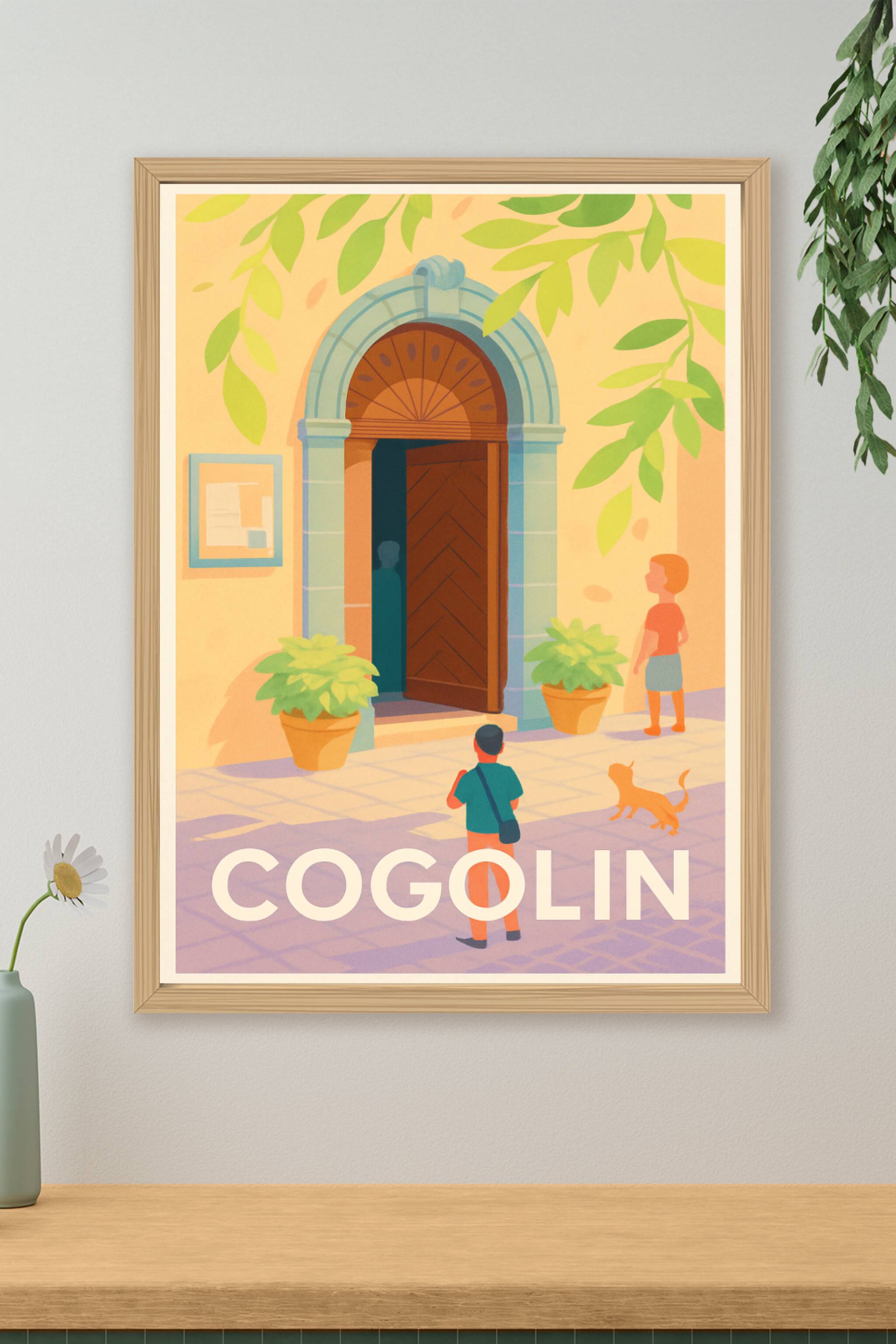 Découvrez l'atmosphère paisible et lumineuse de Cogolin à travers cette affiche au style illustratif doux et chaleureux. Cette scène capture un mom...