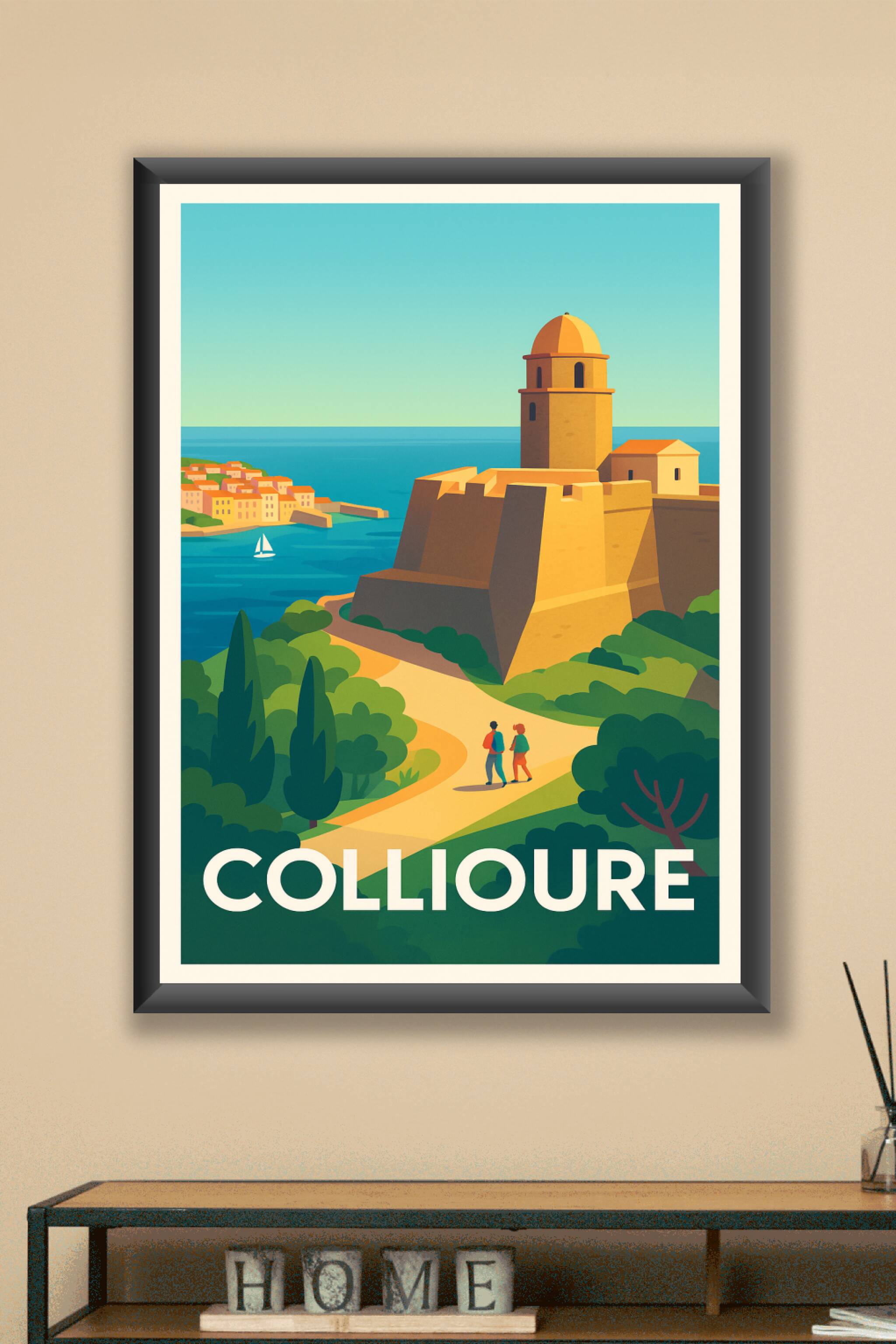 Découvrez l’authenticité du charmant village de Collioure avec cette affiche au style vintage qui met en lumière sa forteresse emblématique surplom...