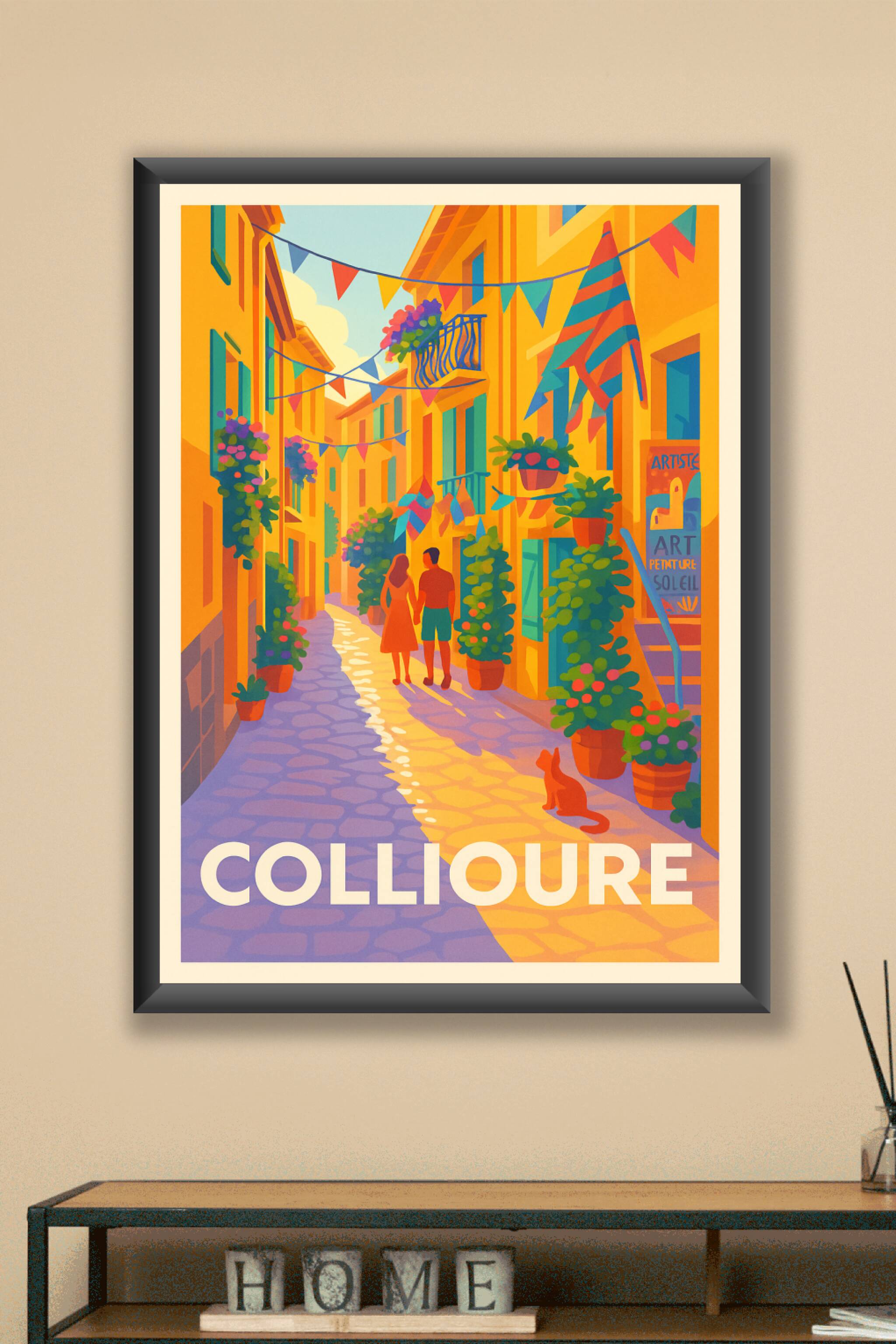 Découvrez la douceur de vivre méditerranéenne avec cette affiche colorée représentant une ruelle typique de Collioure, baignée par la lumière dorée...