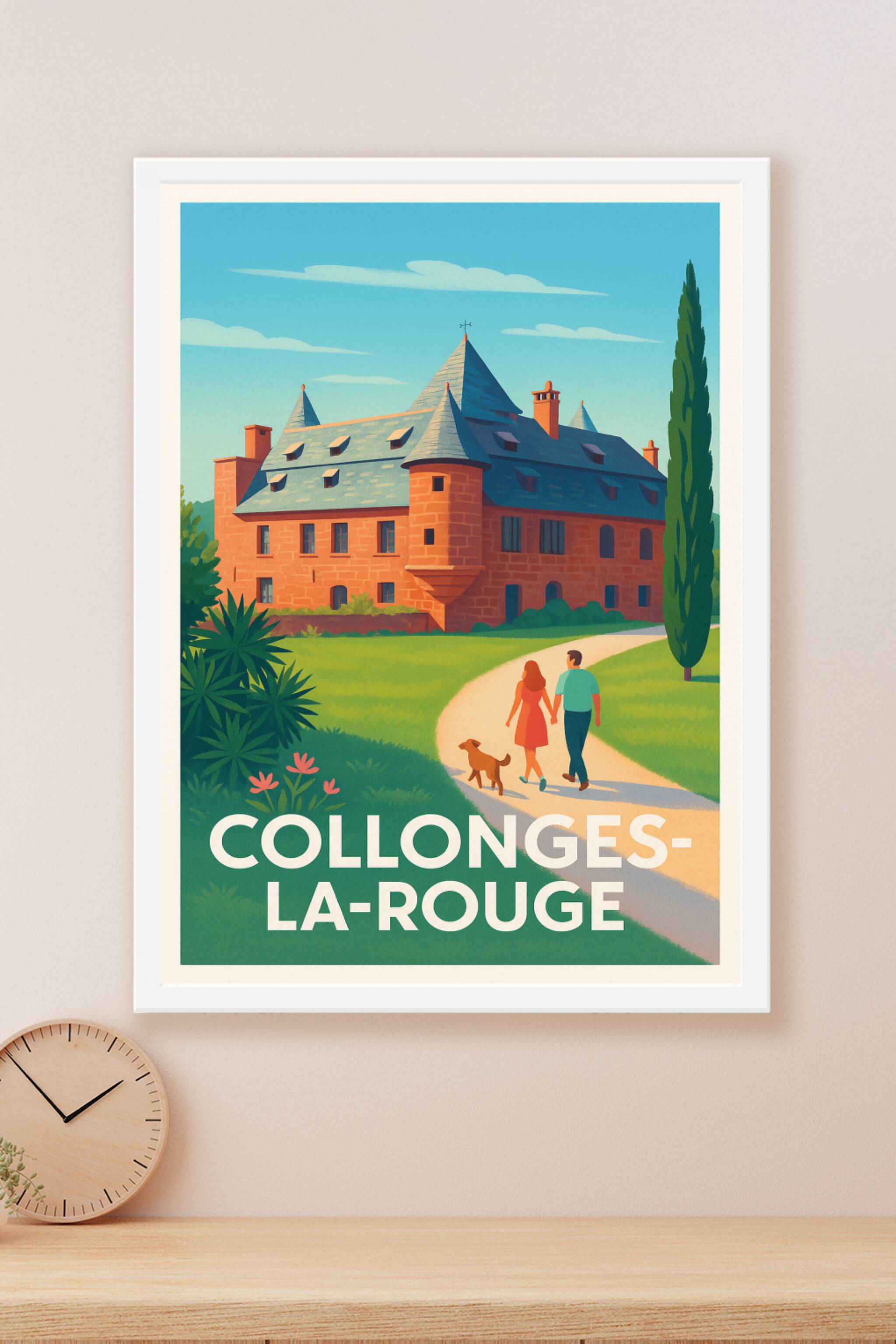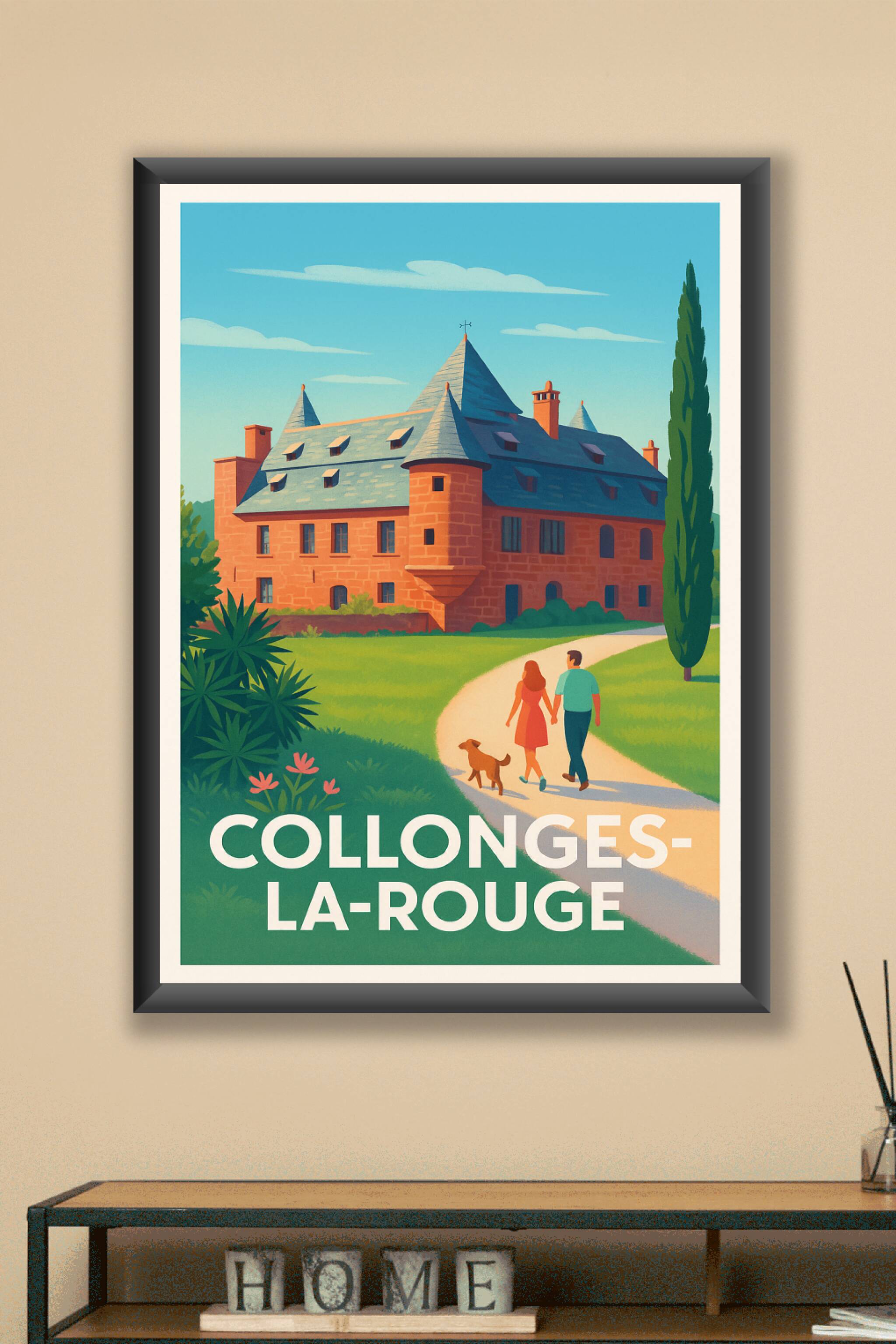 Découvrez la beauté unique de Collonges-la-Rouge à travers cette affiche illustrée, mettant en lumière son architecture typique en pierre rouge et ...
