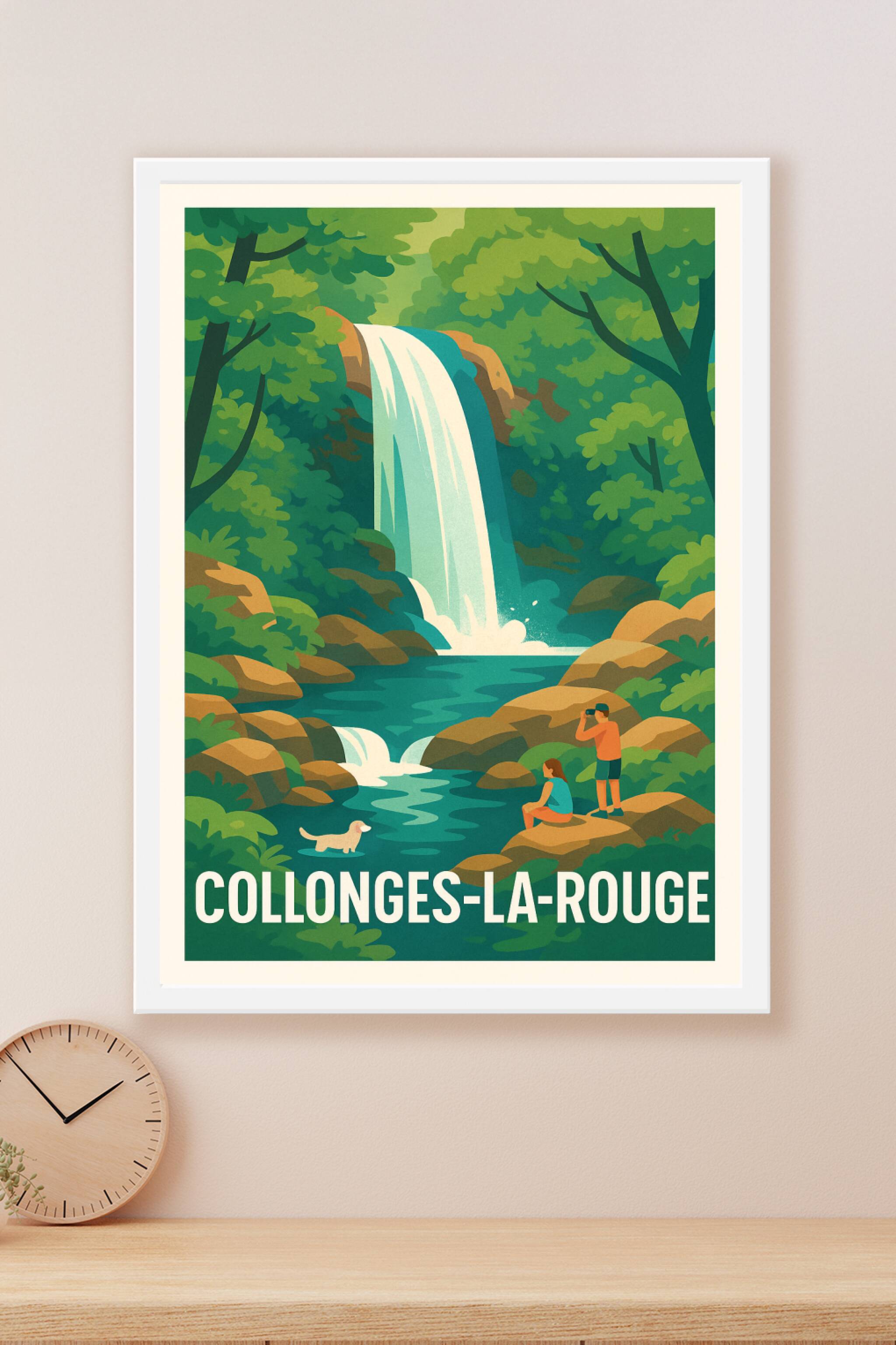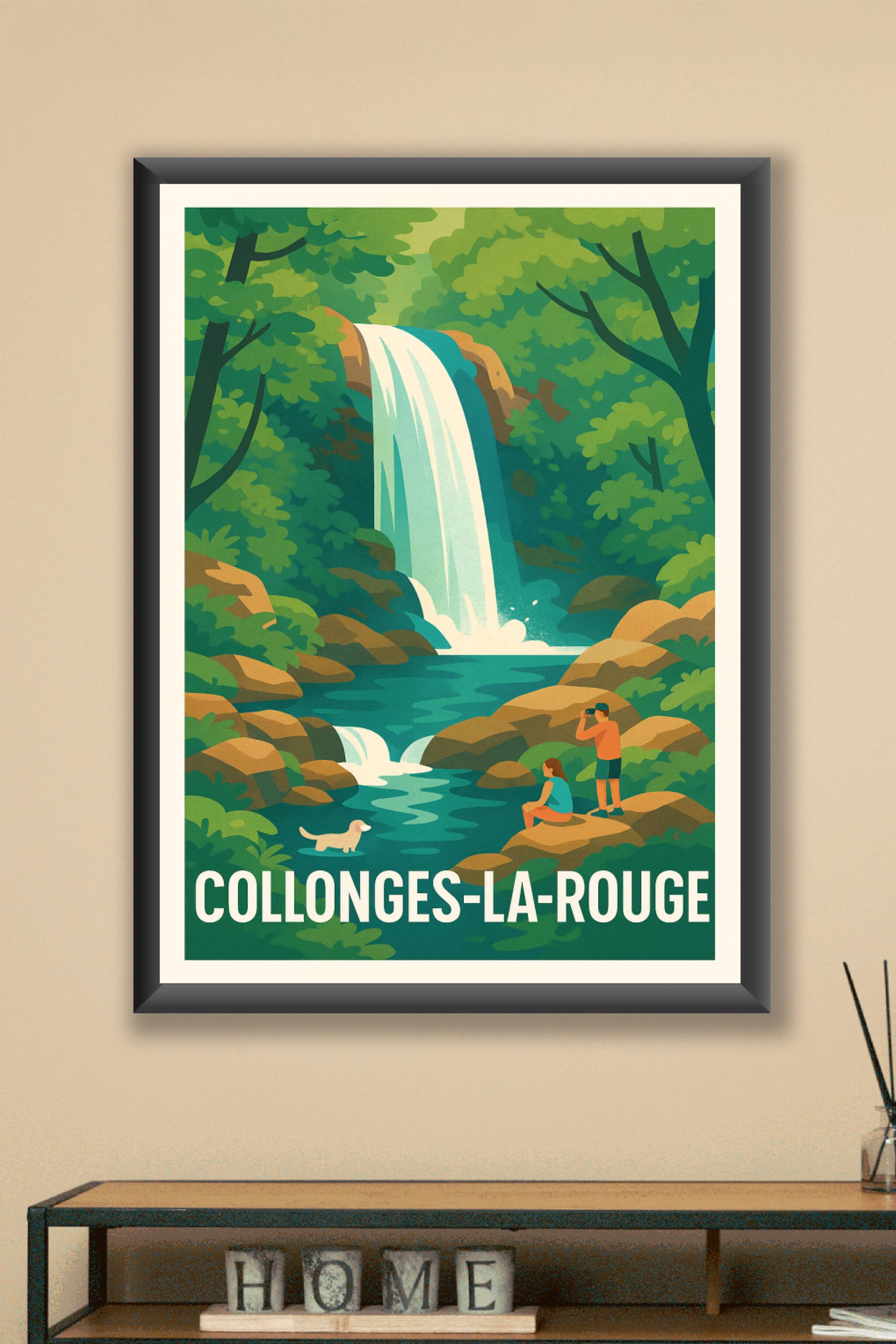 Découvrez la beauté paisible et verdoyante de Collonges-la-Rouge à travers ce poster illustré mettant en scène une cascade cristalline nichée au cœ...