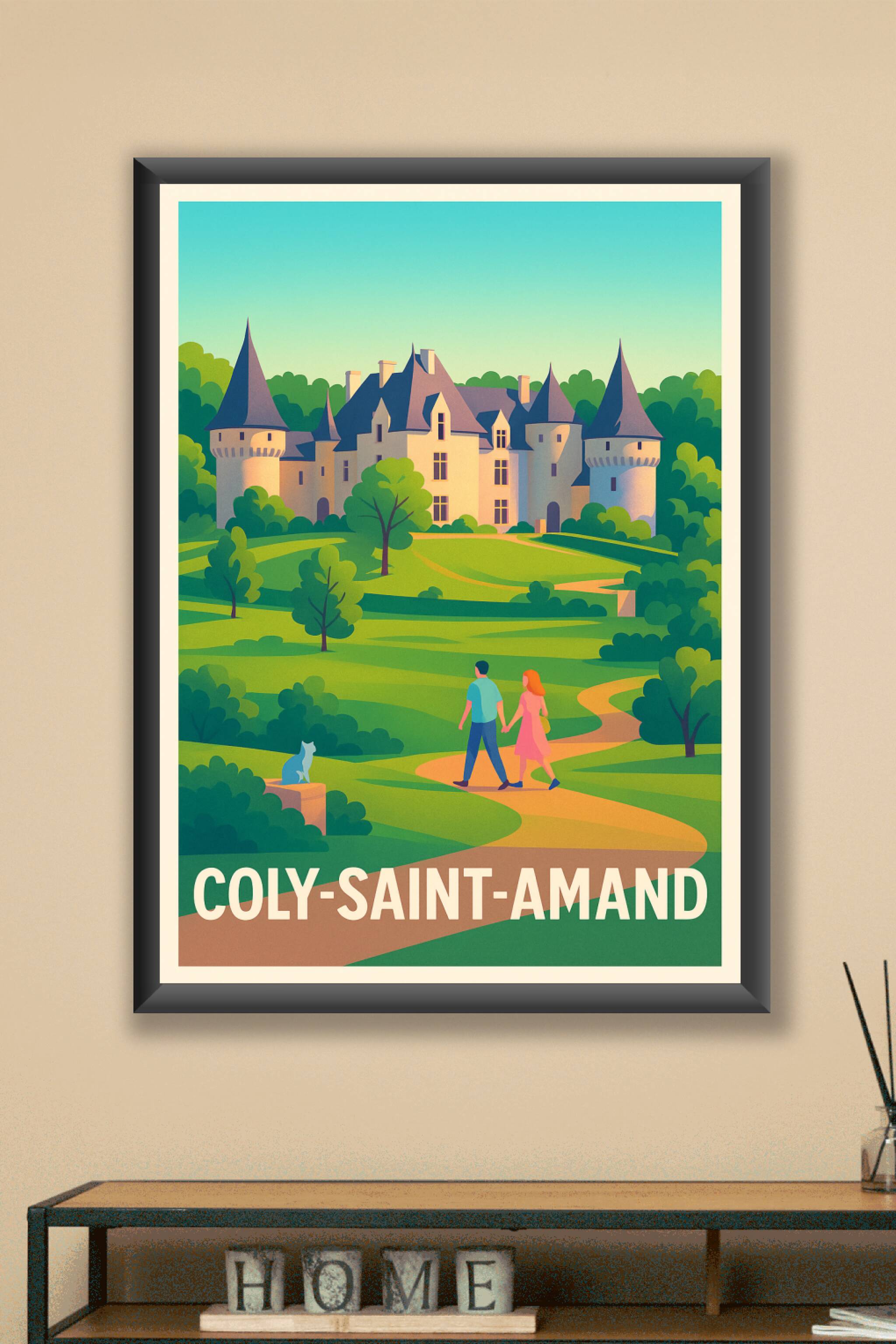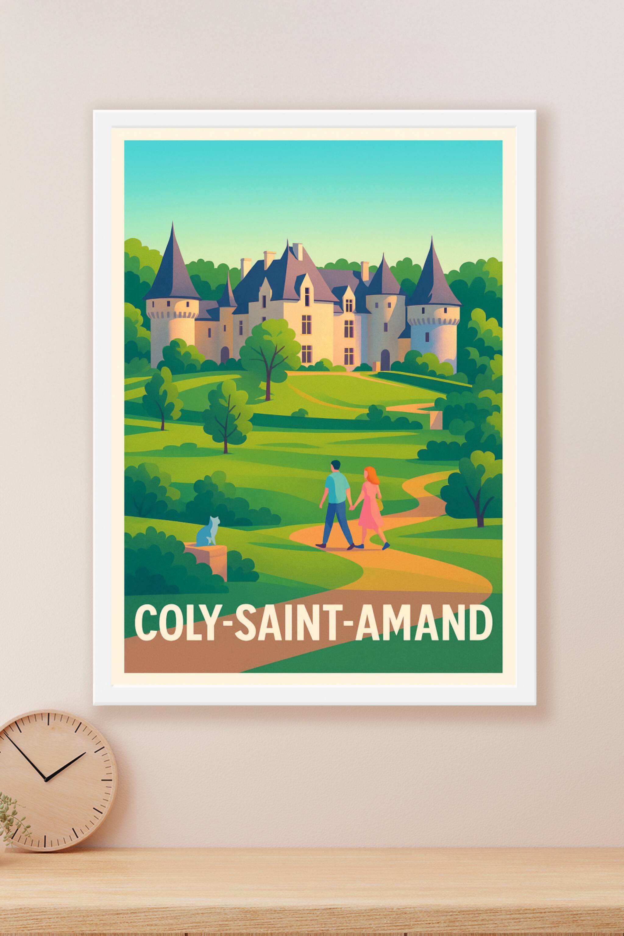 Découvrez la sérénité champêtre de Coly-Saint-Amand avec cette affiche au design vintage mettant en valeur un magnifique château entouré de verdure...