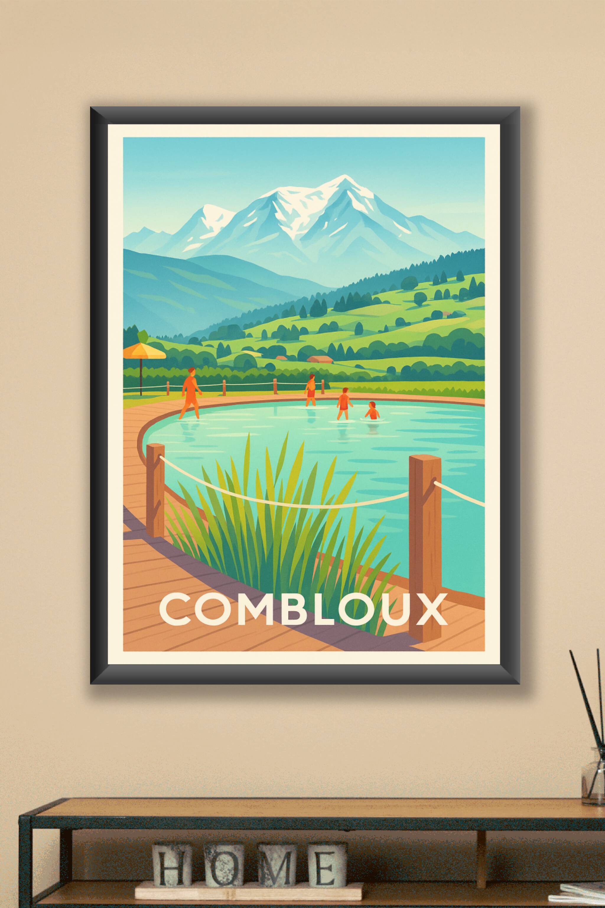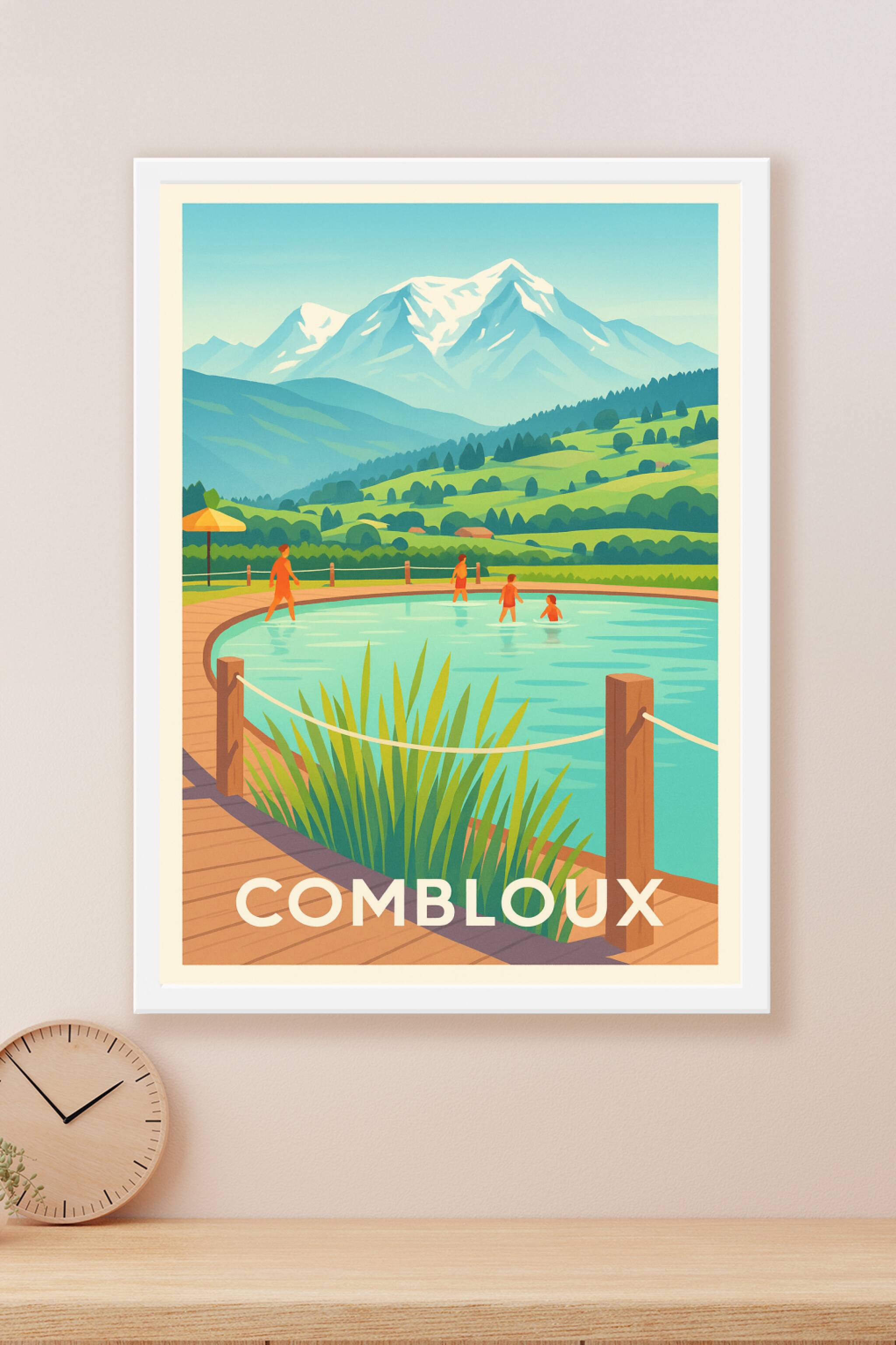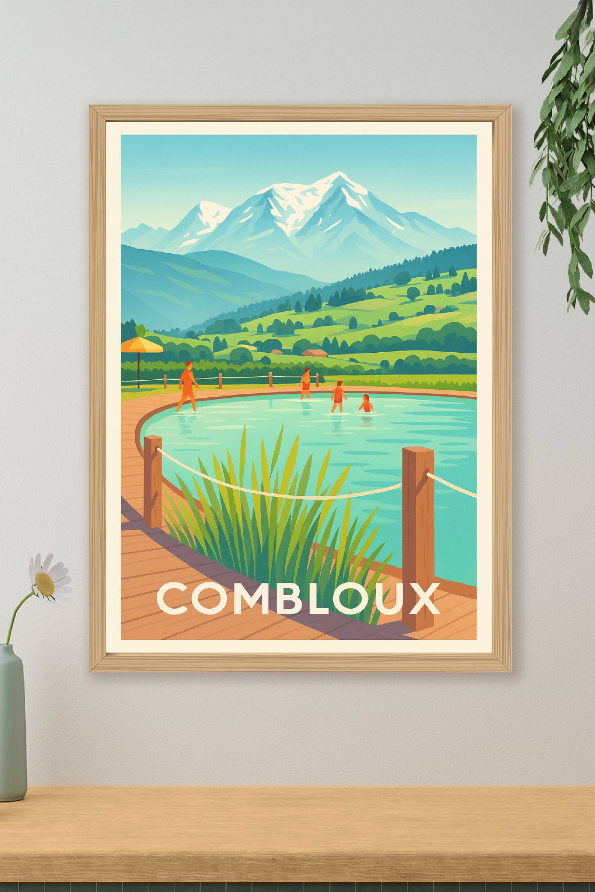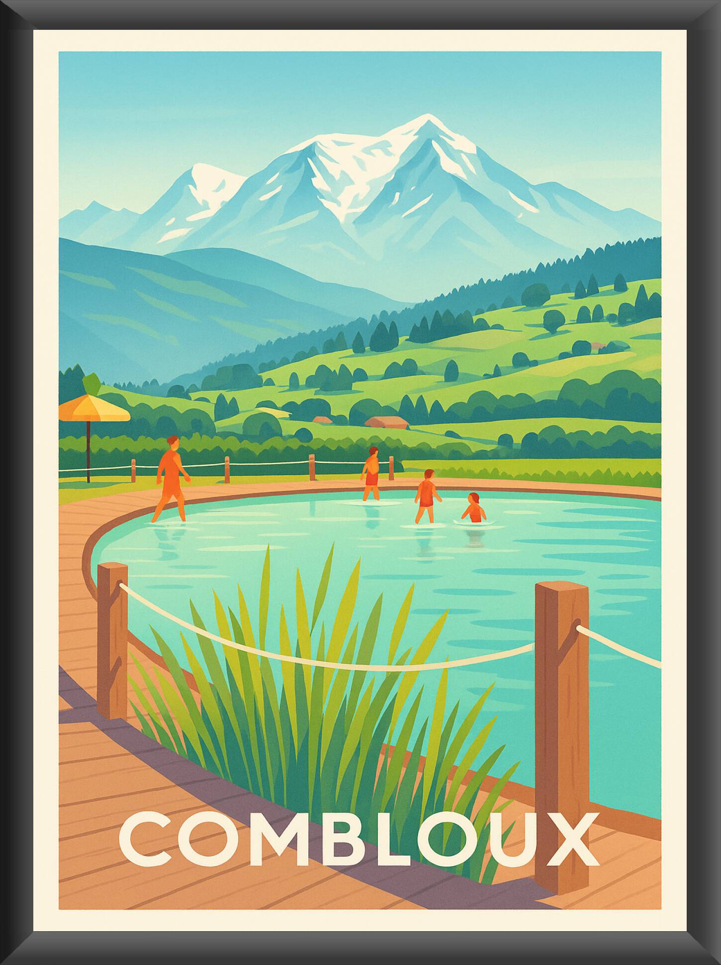 Découvrez la douceur de vivre à Combloux avec cette affiche vintage qui met en scène une piscine naturelle entourée de montagnes majestueuses, domi...