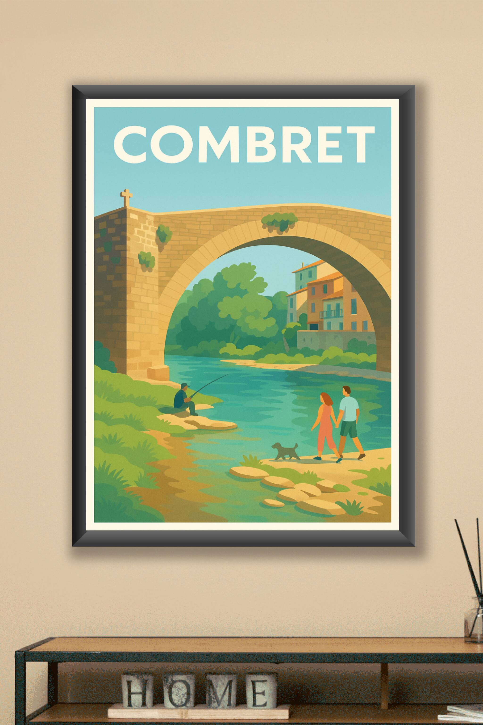 Découvrez la sérénité de Combret avec ce poster illustré mettant en scène le charme authentique d'un pont de pierre surplombant une rivière tranqui...