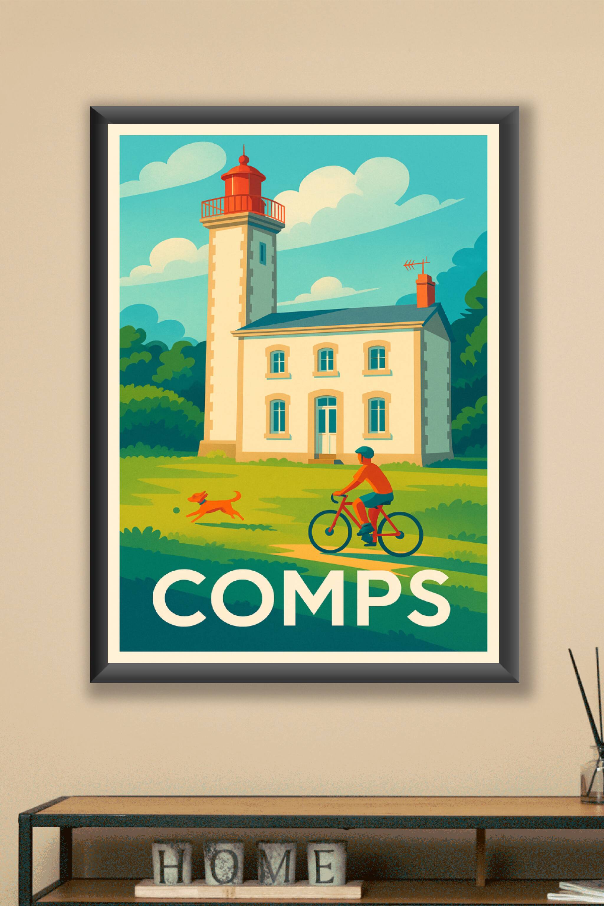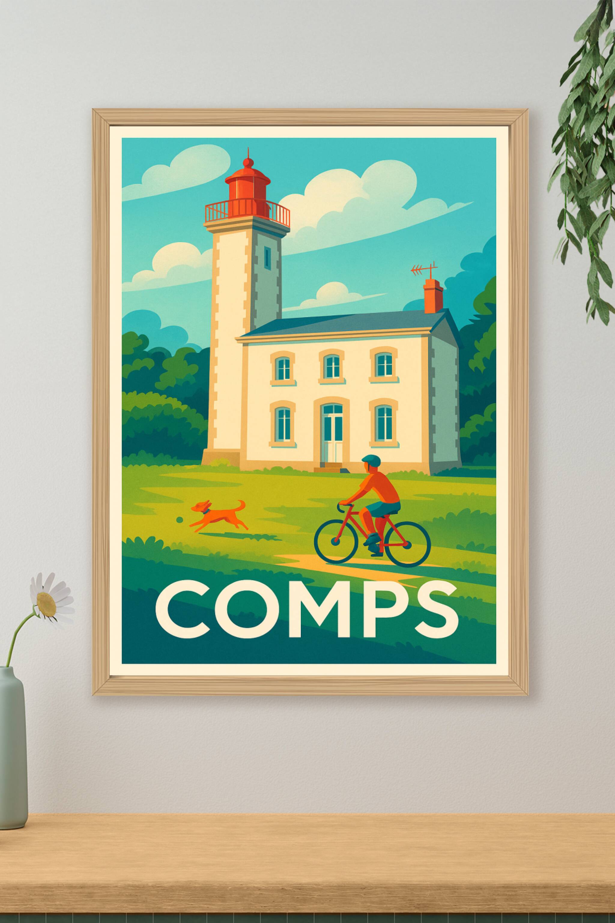 Découvrez la sérénité de Comps avec cette affiche illustrée représentant un phare emblématique, baigné par une lumière douce et un ciel bleu apaisant. La scène invite à la détente, avec un cycliste et son chien profitant de ce cadre bucolique. Ce poster, imprimé en tirage "Fine Art" sur un papier 305g coton de grande qualité, garantit des couleurs vives et un rendu optimal. Disponible en formats A1 à A4, avec ou sans cadre, cette affiche est une pièce idéale pour embellir votre intérieur ou offrir un cadeau unique aux amateurs de paysages authentiques. Profitez d'une impression premium 100 % fabriquée en France pour apporter une touche de nature et de calme à votre décoration.