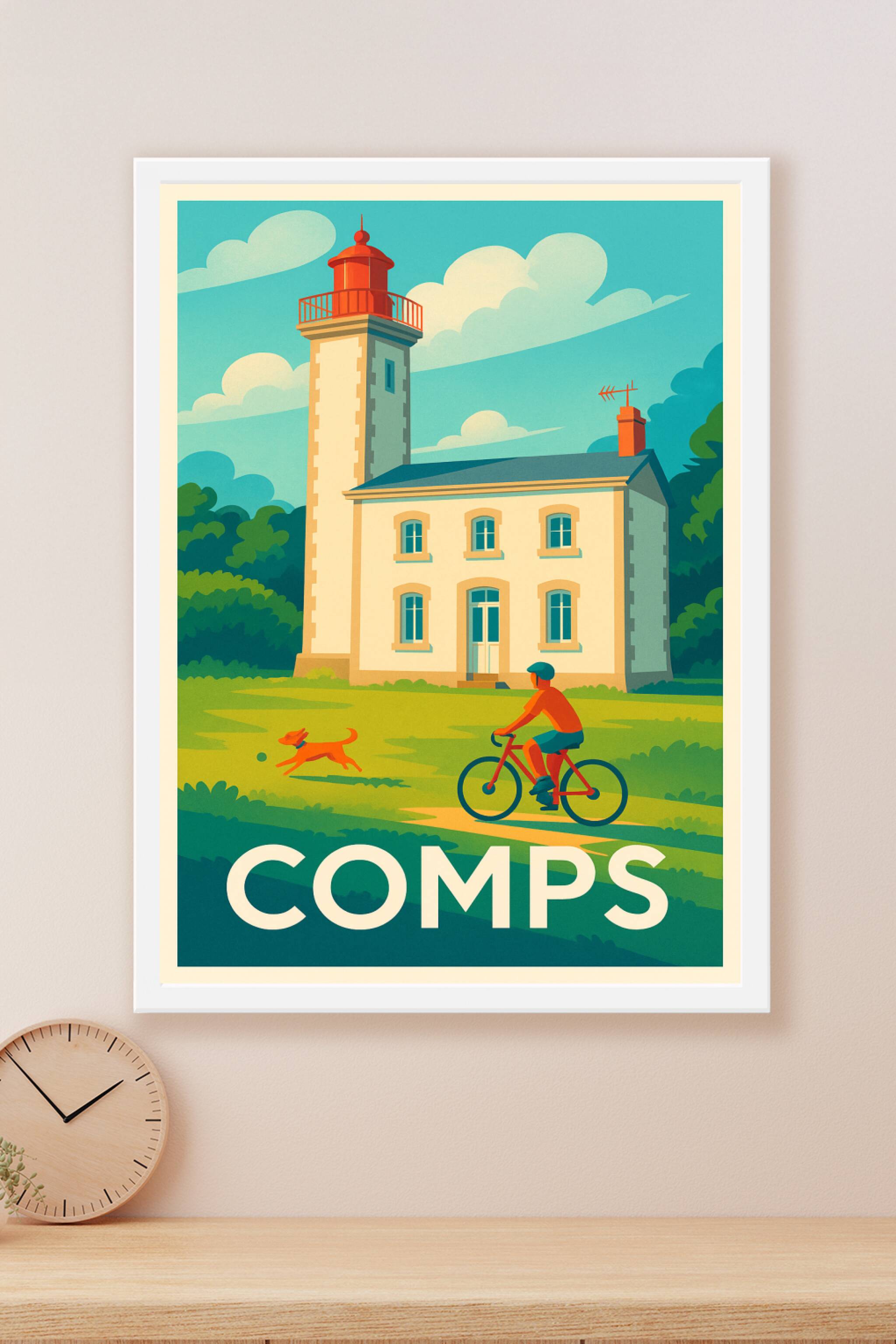 Découvrez la sérénité de Comps avec cette affiche illustrée représentant un phare emblématique, baigné par une lumière douce et un ciel bleu apaisa...