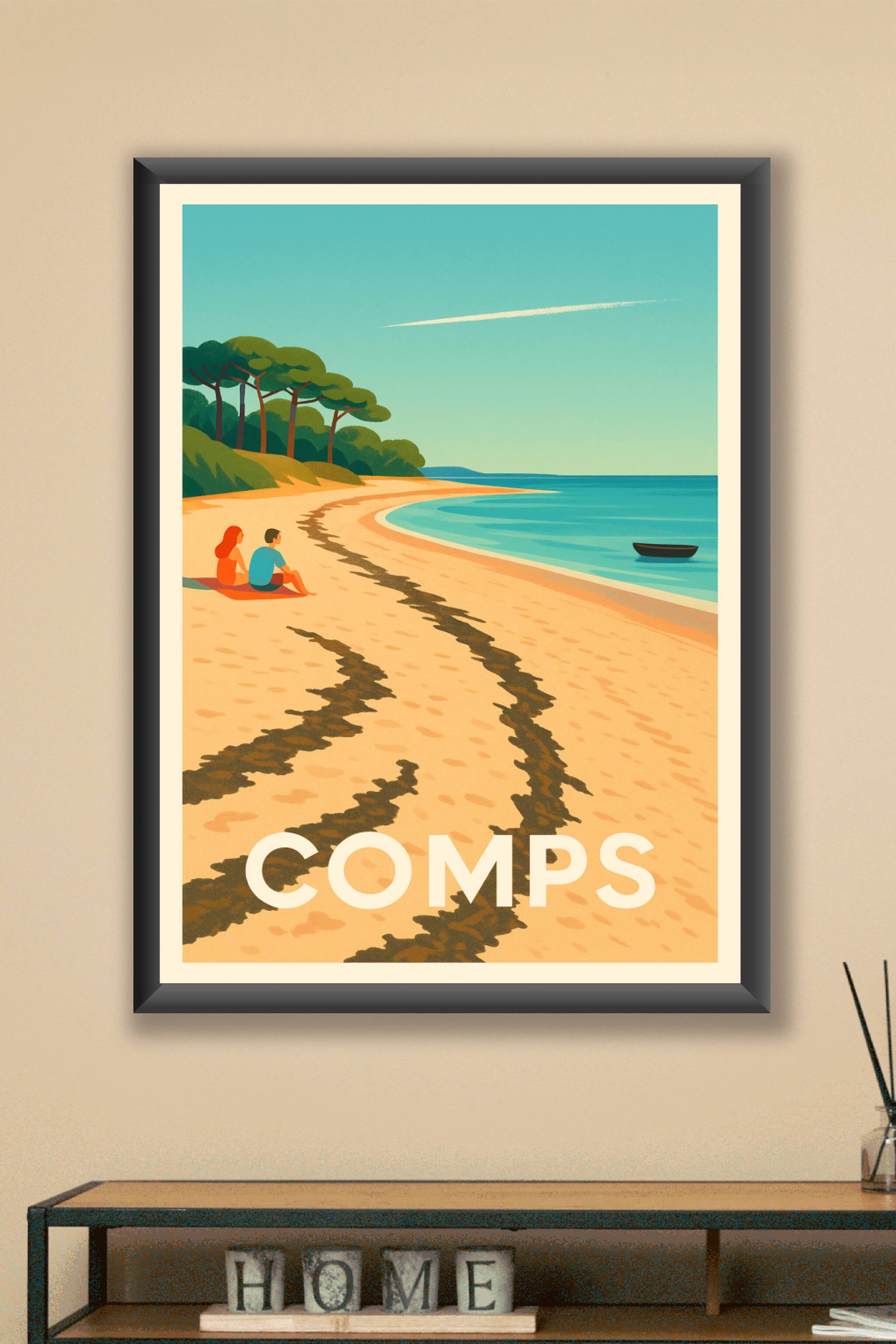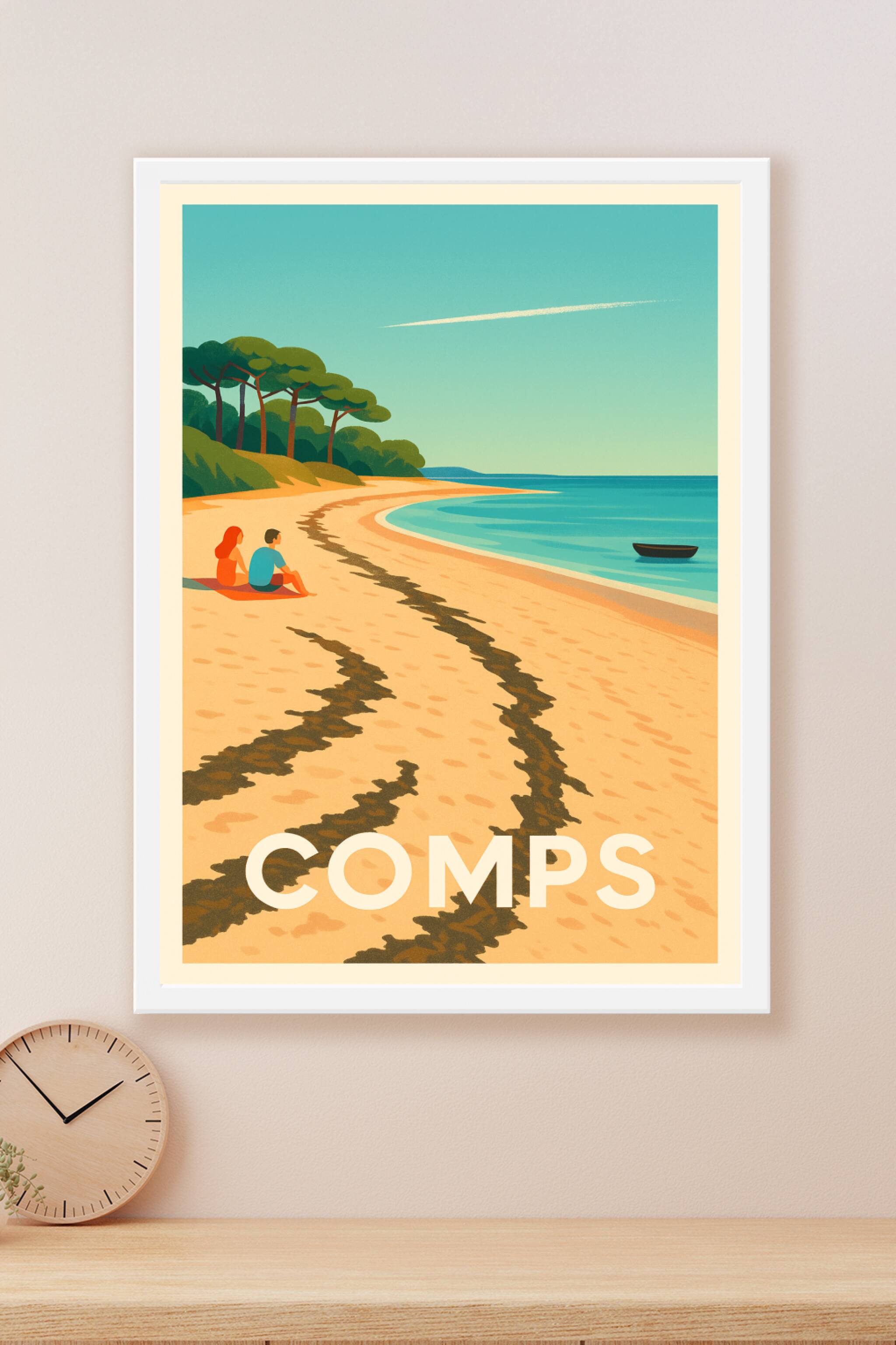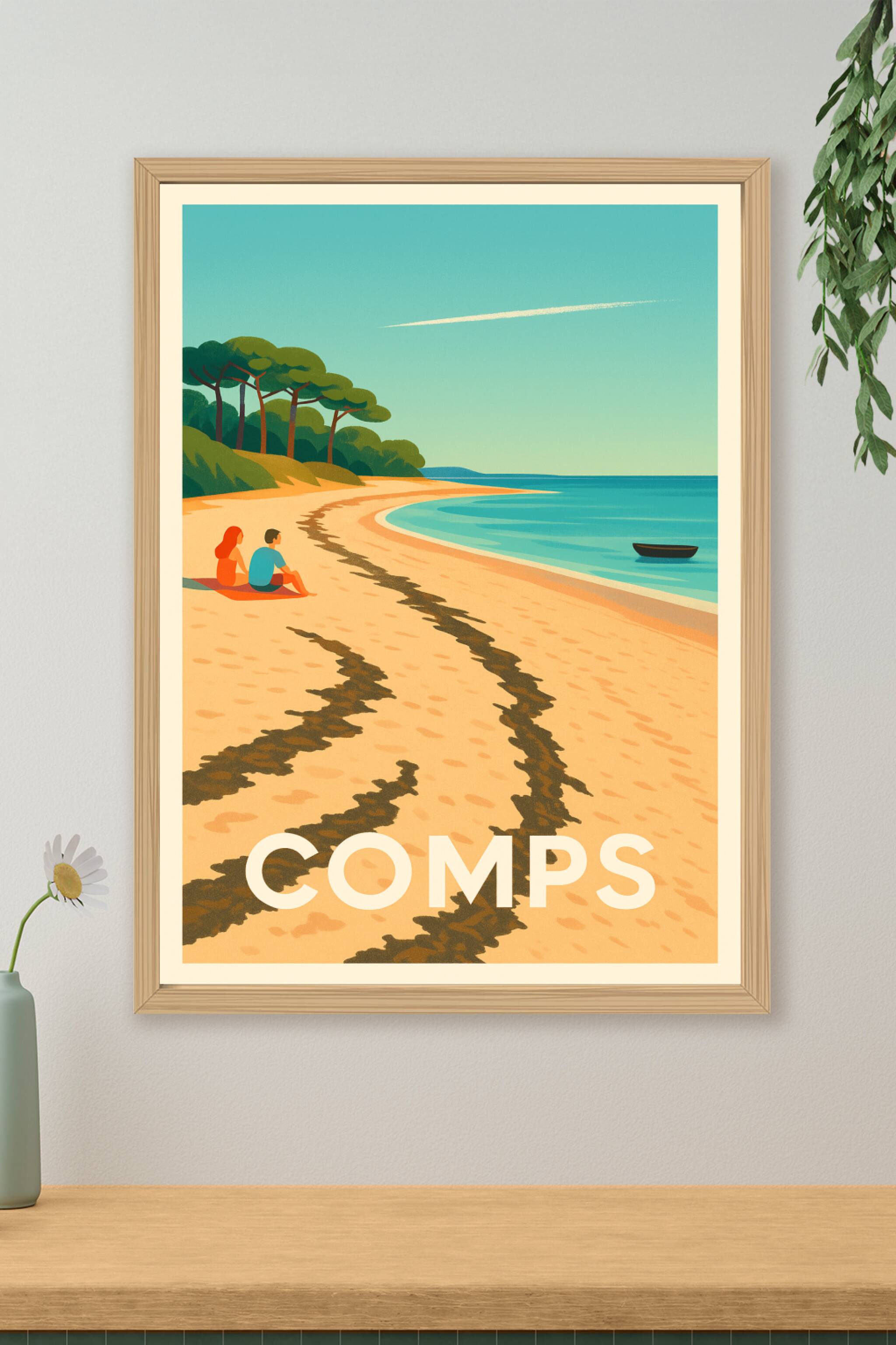 Découvrez la douceur ralentissante d'une journée à la plage avec ce magnifique poster illustré de la côte de Comps. L’affiche dévoile une scène apa...