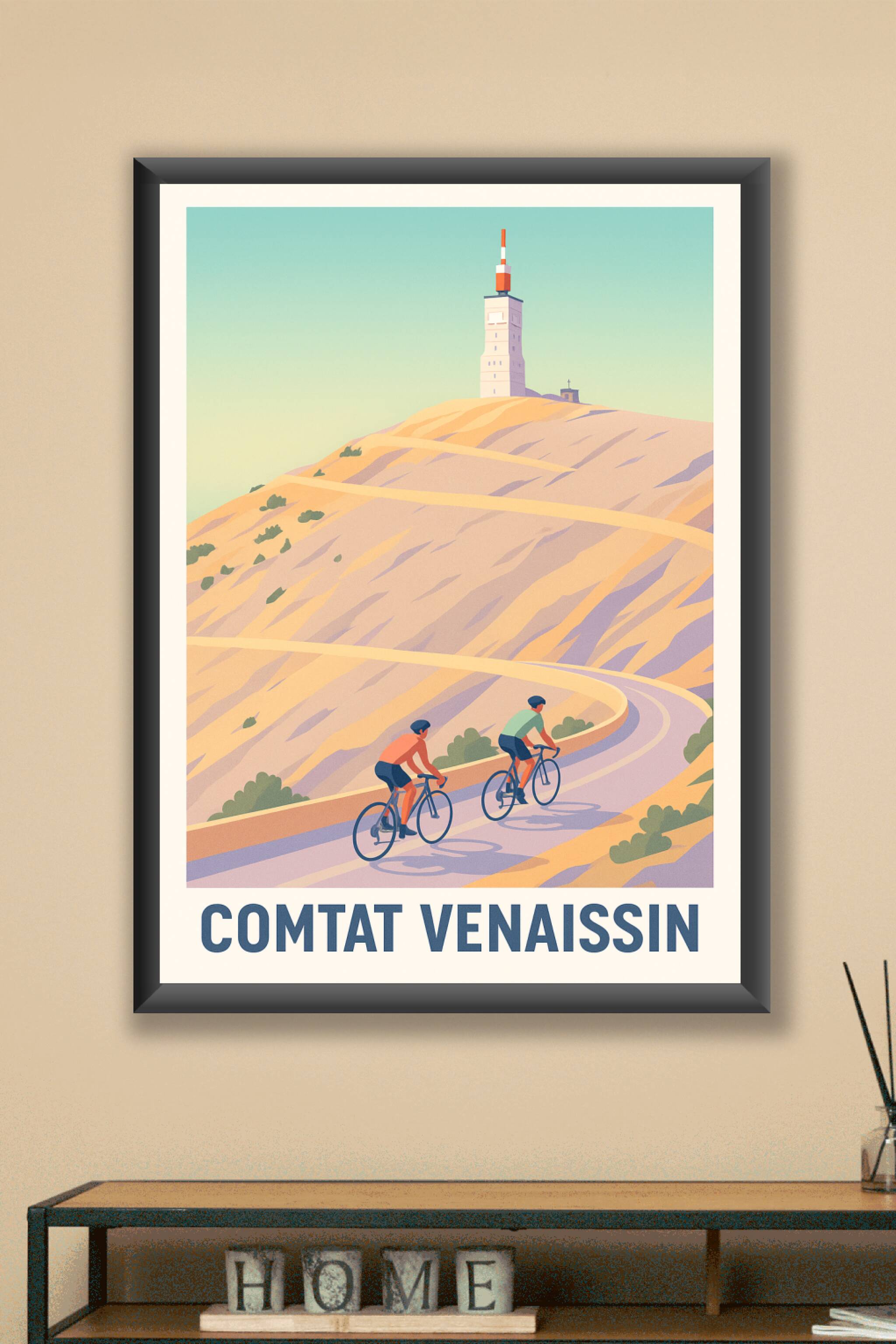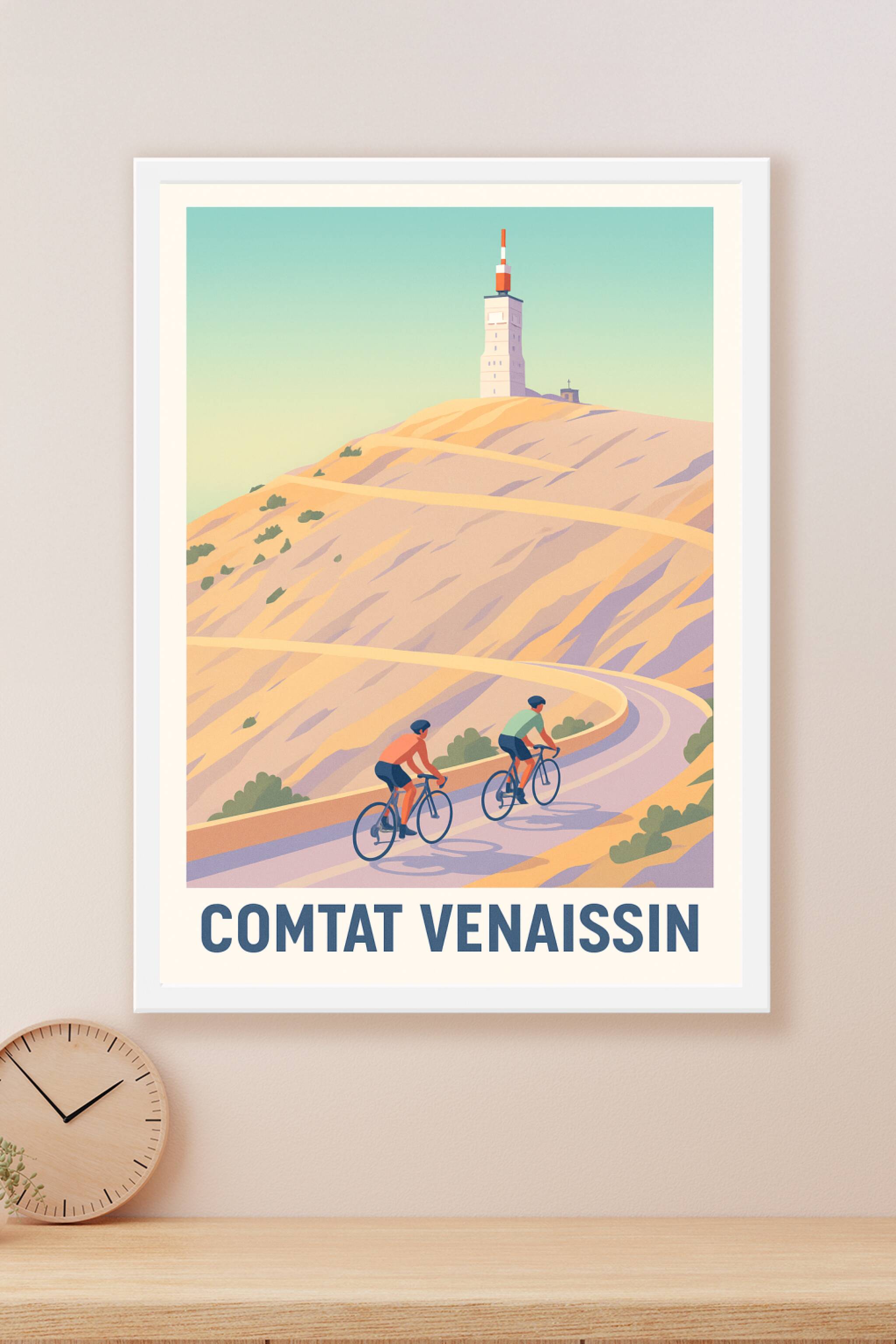 Découvrez l'esprit sportif et naturel du Comtat Venaissin avec cette affiche illustrée mettant en scène deux cyclistes affrontant les courbes sinueuses d'une route de montagne ensoleillée. Ce poster vintage stylisé capture à merveille l'intensité et la beauté des paysages provençaux.L’affiche est imprimée en tirage "Fine Art" sur papier 305g coton, garantissant une qualité d'impression exceptionnelle et des couleurs lumineuses qui sublimeront votre décoration intérieure. Disponible en formats A1 à A4, avec ou sans cadre, ce poster est parfait pour les amateurs de vélo, de nature et d'art rétro.Proposez à votre intérieur ou offrez ce souvenir unique de la région du Comtat Venaissin, 100% fabriqué en France, qui allie esthétisme et passion du plein air.