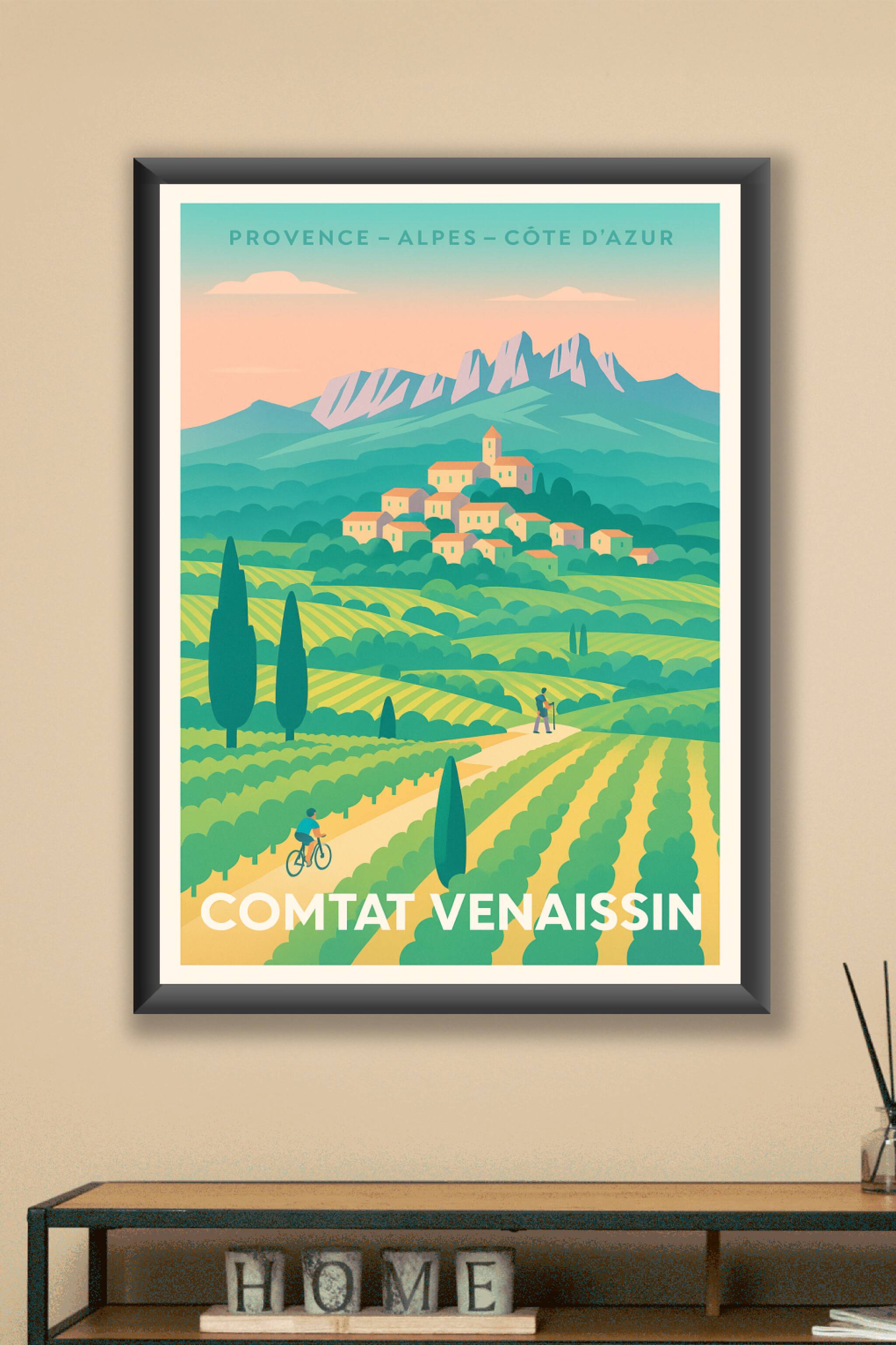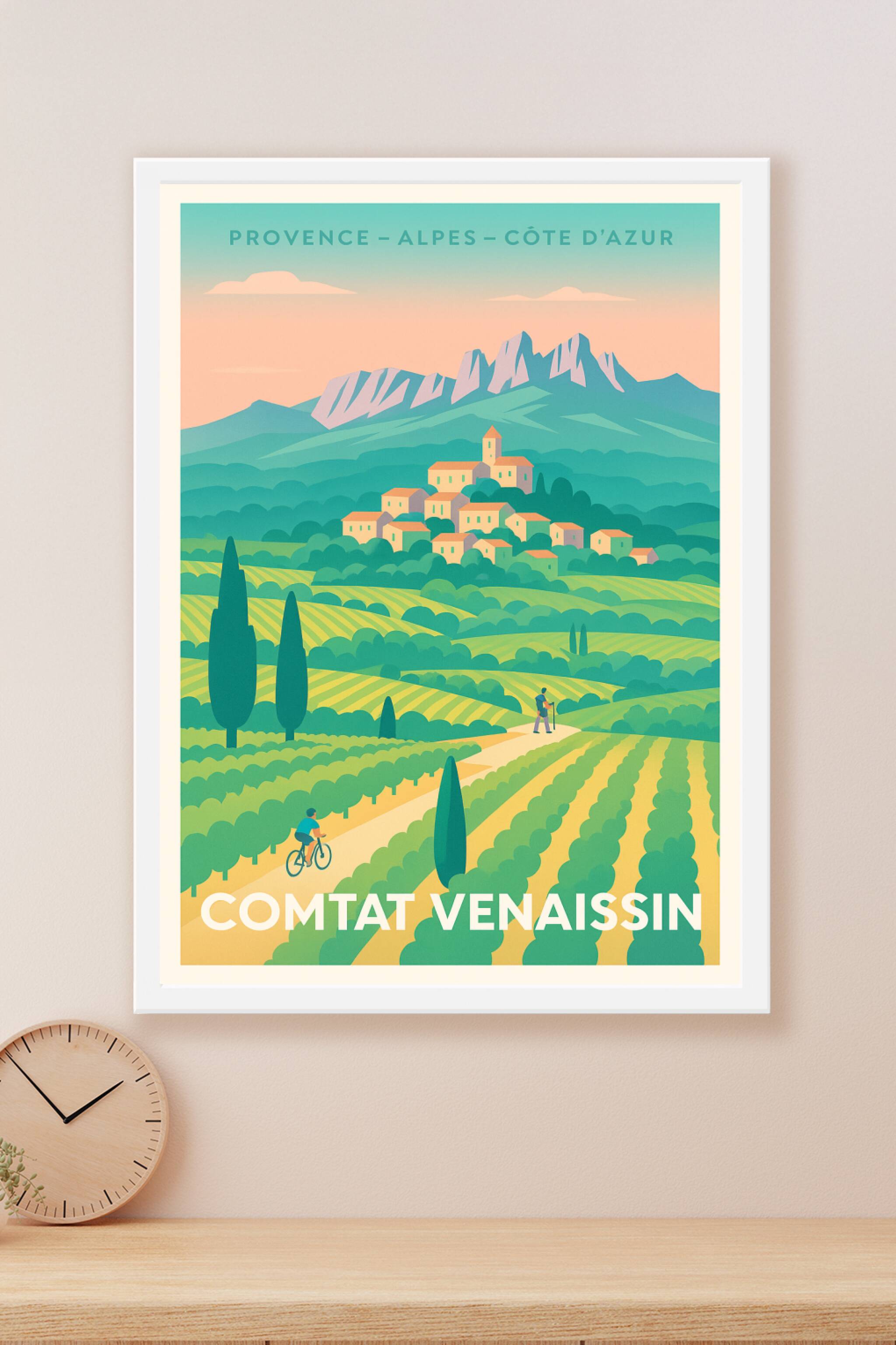 Découvrez la sérénité et le charme du Comtat Venaissin à travers cette affiche illustrée aux couleurs douces et harmonieuses. Cette scène bucolique met en lumière les paysages verdoyants et les villages pittoresques typiques de la région Provence-Alpes-Côte d'Azur. Ce poster est réalisé en tirage "Fine Art" sur papier 305g coton, garantissant une qualité d'impression premium et une longévité exceptionnelle. Disponible en plusieurs formats du A1 au A4, avec ou sans cadre, cette affiche est parfaite pour sublimer votre décoration intérieure. Offrez à votre intérieur ou à vos proches une immersion authentique dans le cœur de la Provence, avec une création 100% made in France.
