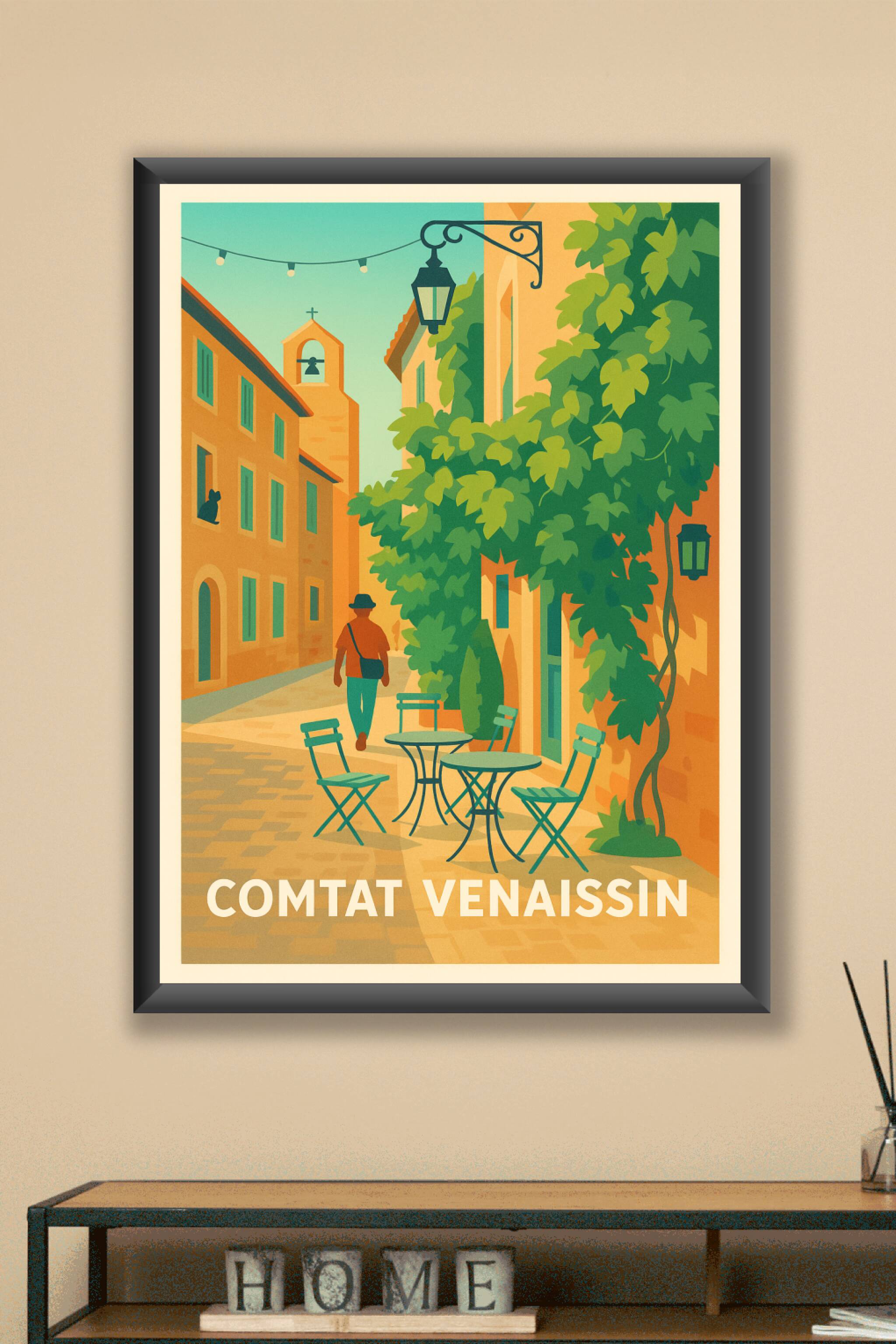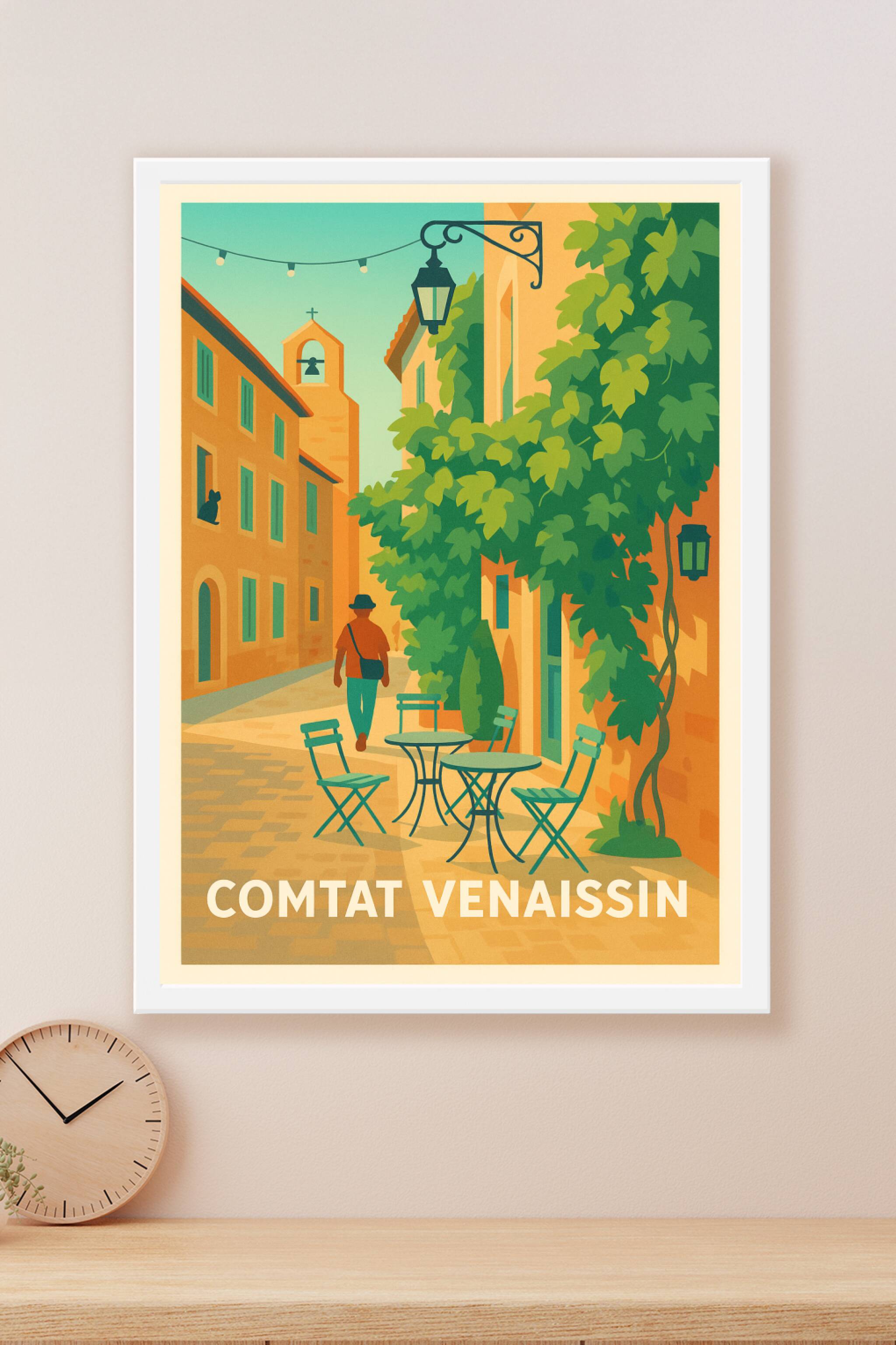 Découvrez l'atmosphère paisible et chaleureuse du Comtat Venaissin avec cette affiche au style rétro et coloré. Cette illustration capture une ruelle typique baignée de lumière, ornée de vieilles pierres, d'une végétation luxuriante et de petites tables d'extérieur, invitant à la flânerie sous un ciel azur. Ce poster est disponible en tirage "Fine Art" sur un papier 305g coton de haute qualité, garantissant une impression éclatante et durable. Accessible en formats A1 à A4, avec ou sans cadre, cette affiche sublimera votre décoration intérieure en apportant une touche authentique et provençale. Parfait pour les amoureux de la Provence et ceux qui souhaitent ajouter une ambiance méditerranéenne élégante chez eux.