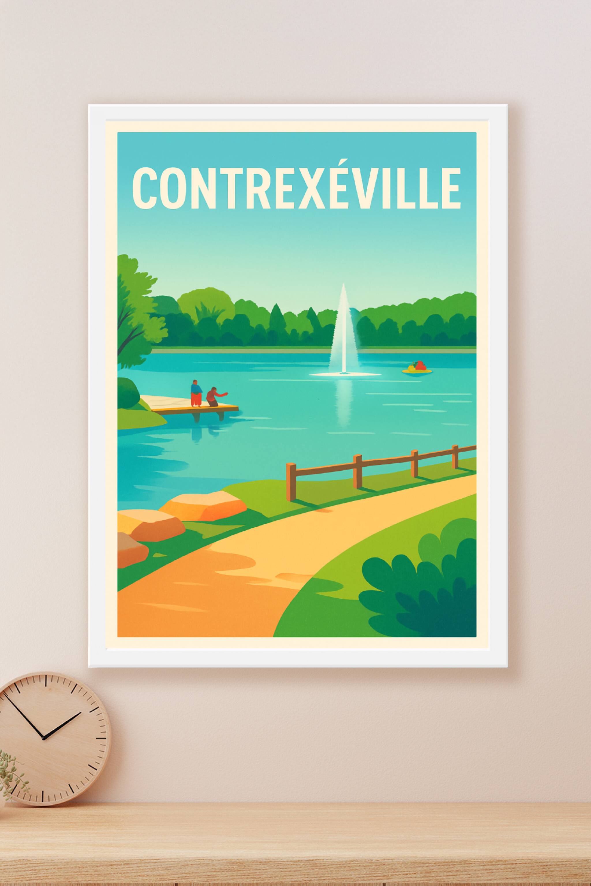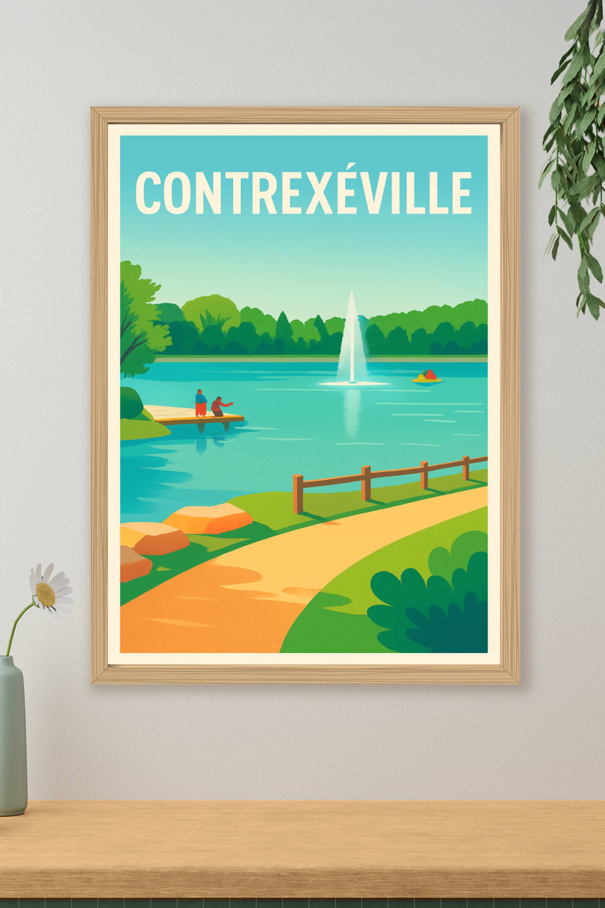 Découvrez la sérénité et le charme naturel de Contrexéville avec cette affiche illustrée mettant en scène un paisible lac orné d'une fontaine centr...