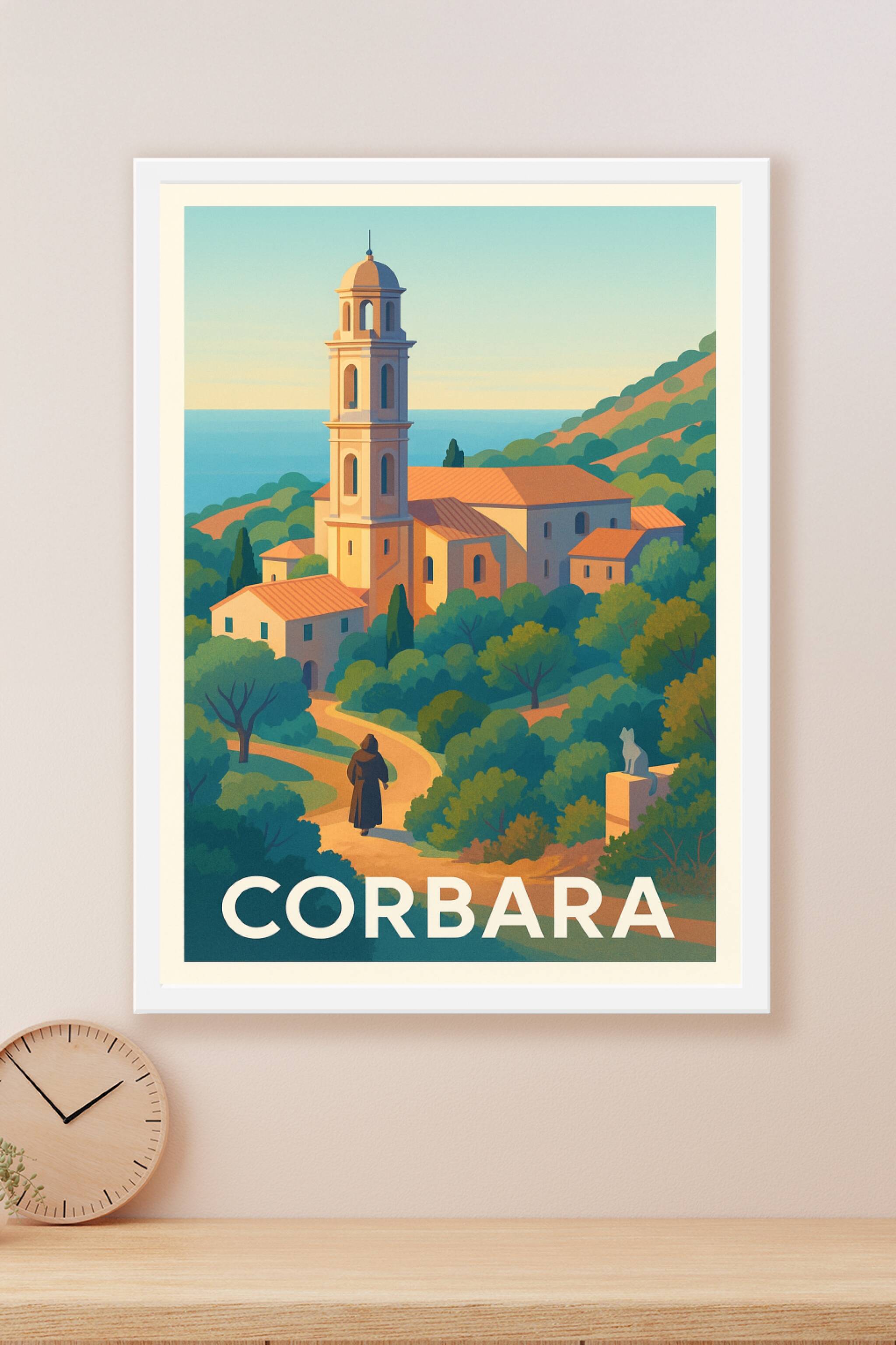 Découvrez l’élégance paisible de Corbara à travers cette superbe affiche représentant son clocher emblématique baigné par la lumière douce du solei...