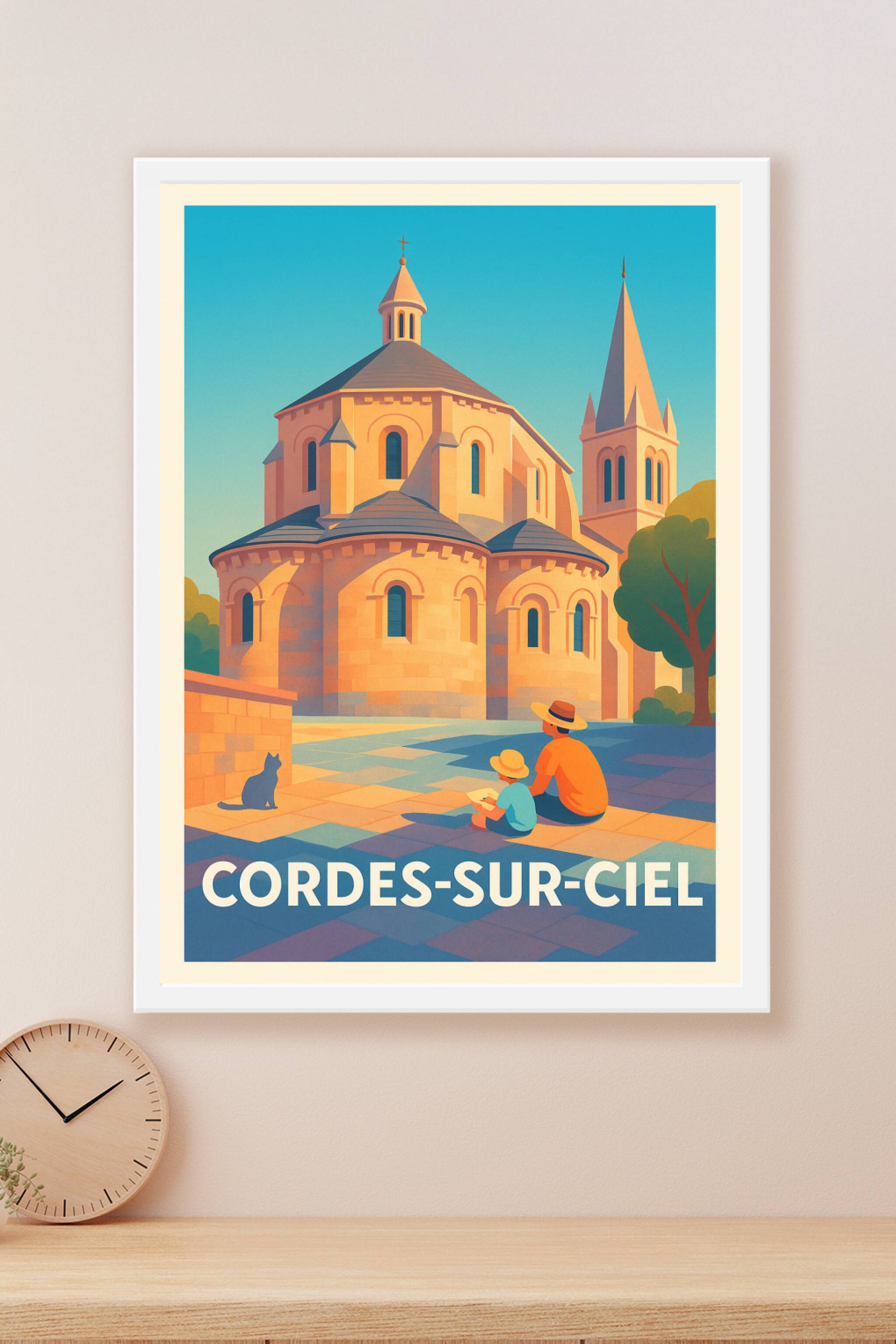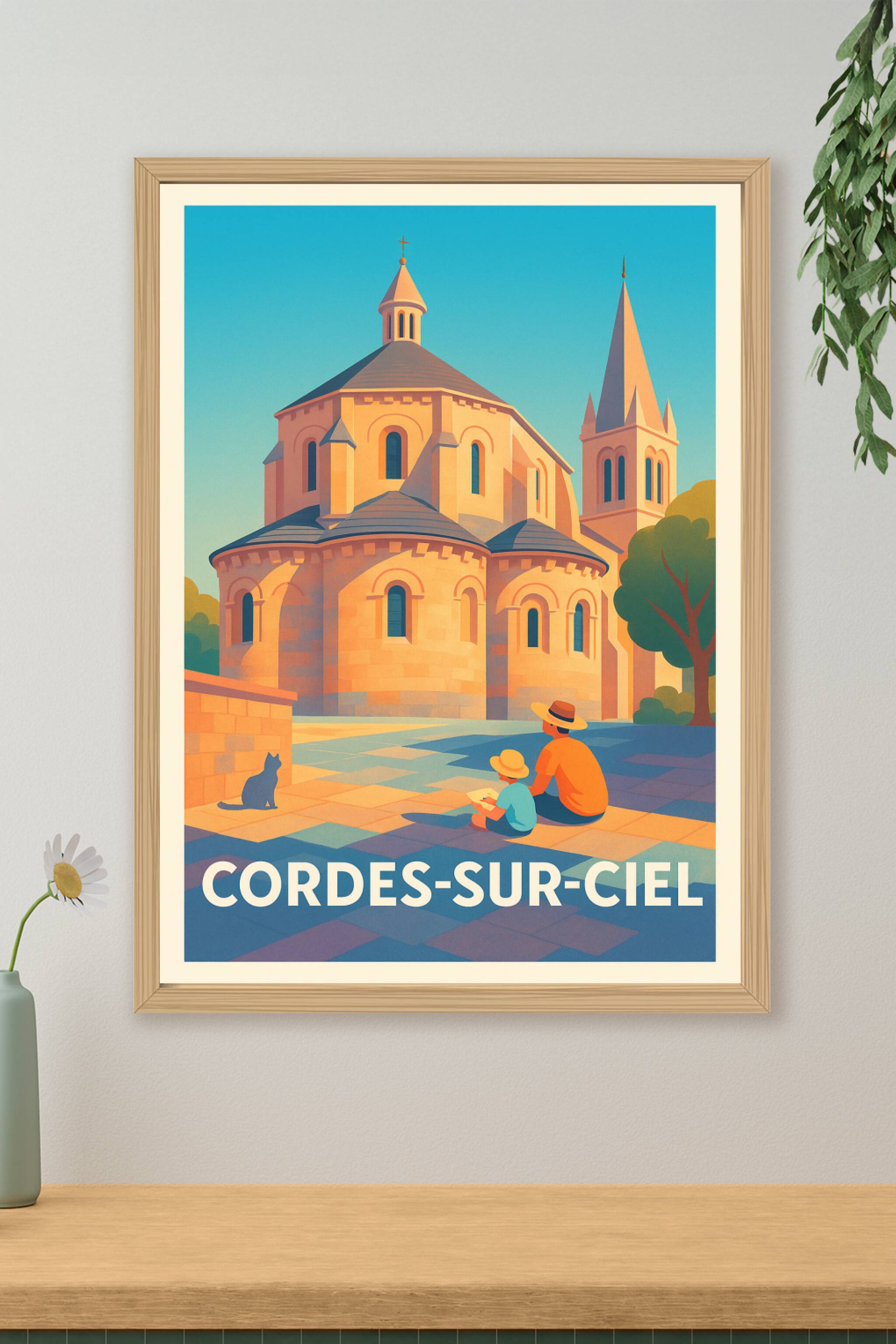 Découvrez le charme intemporel de Cordes-sur-Ciel avec cette affiche illustrée mettant en lumière l'architecture remarquable de cette cité médiévale. Cette scène paisible, où deux personnages contemplent la beauté chaleureuse d'une église, évoque l'art de vivre et la richesse culturelle de la région. Ce poster est imprimé en tirage "Fine Art" sur papier 305g coton, garantissant une qualité d'impression exceptionnelle aux couleurs vives et aux détails précis. Disponible en formats A1 à A4, avec ou sans cadre, cette affiche apportera une ambiance authentique et élégante à votre intérieur. Fabriquée 100% en France, elle constitue un cadeau idéal ou un souvenir précieux pour tous les amoureux du patrimoine et de la belle décoration.
