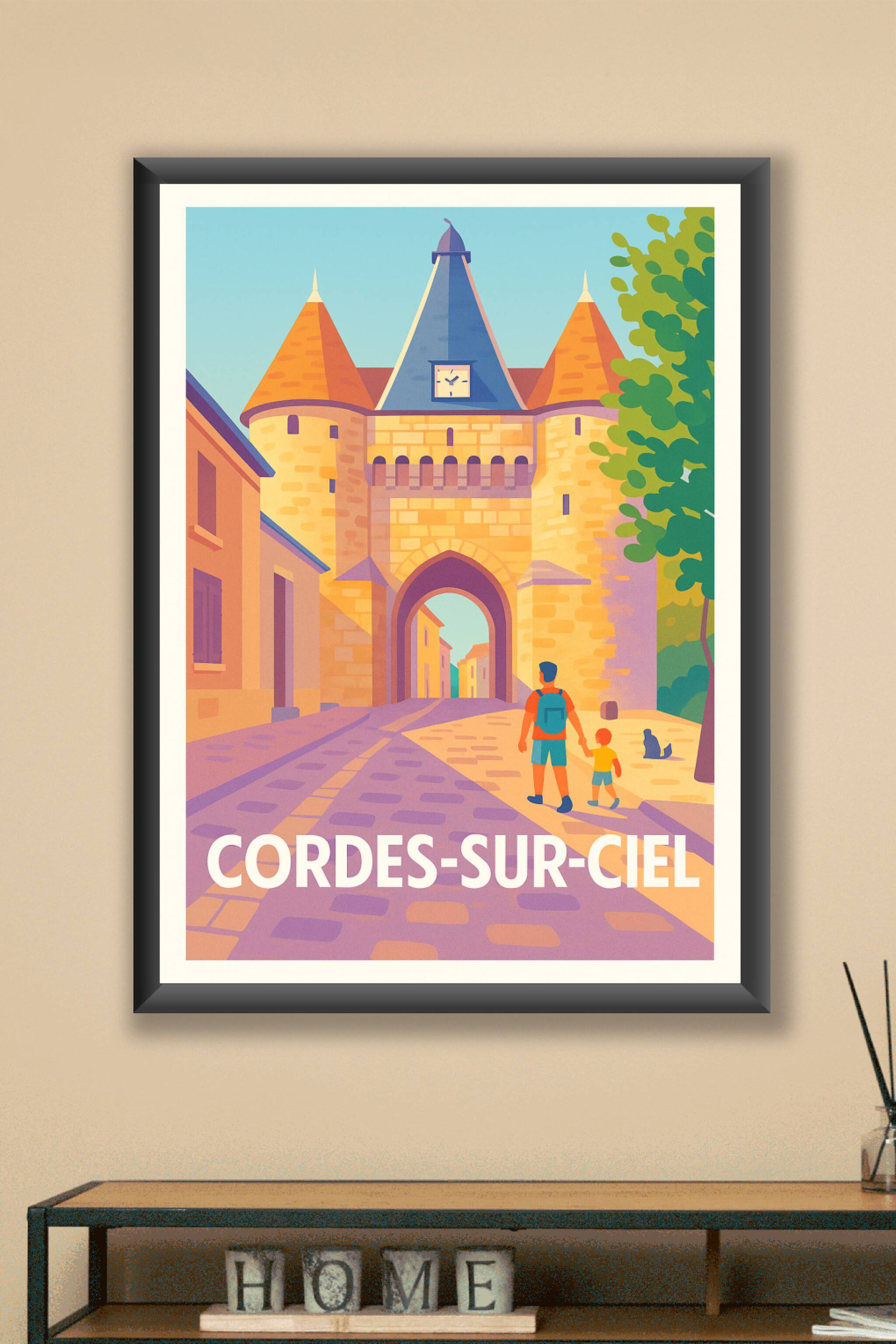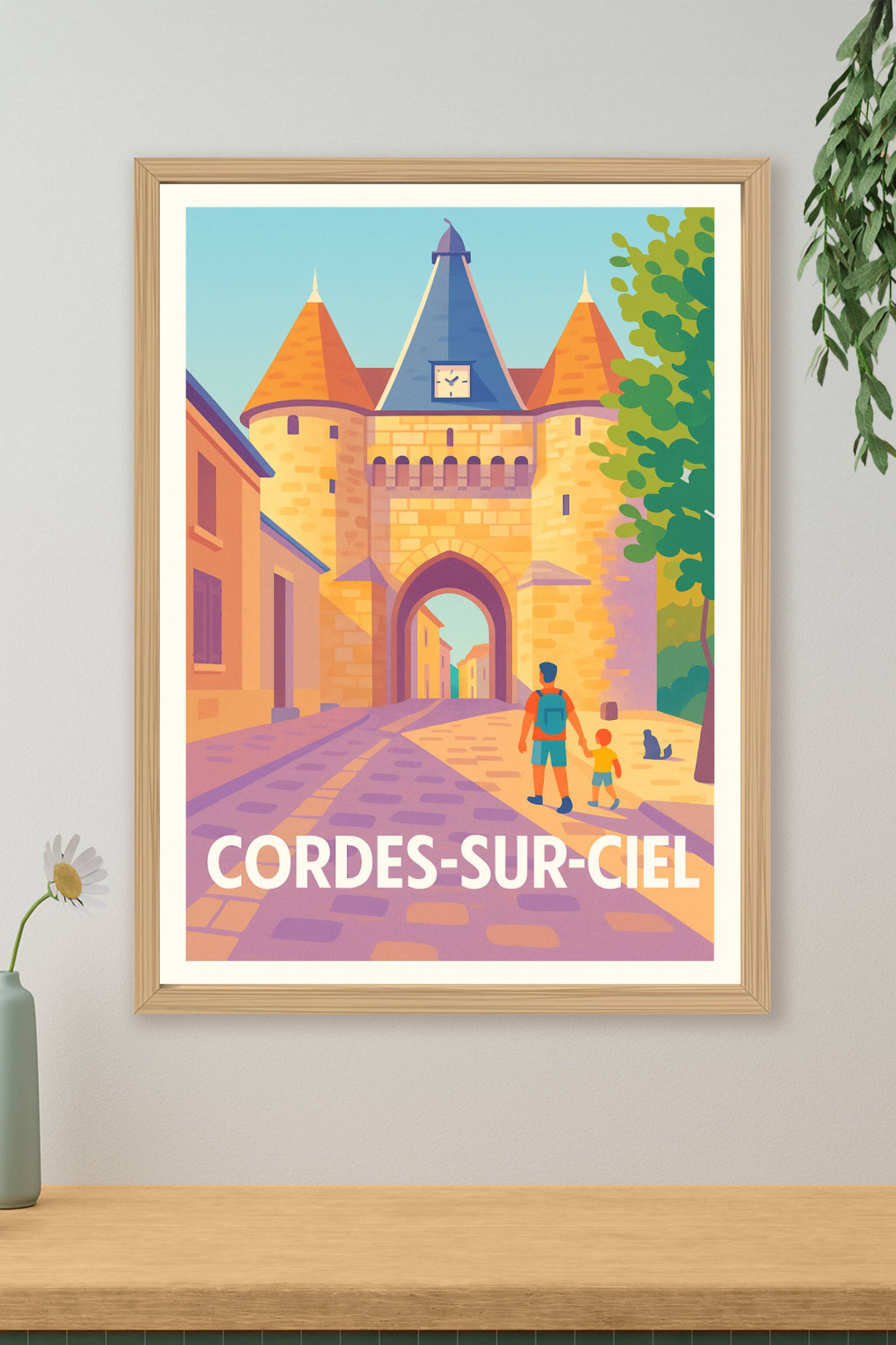 Découvrez la beauté intemporelle de Cordes-sur-Ciel avec cette affiche illustrée mettant en scène l'entrée emblématique de la ville, baignée d'une lumière chaude et douce. Le poster capture l'essence médiévale et familiale avec un style graphique vibrant et moderne, parfait pour apporter une touche d'histoire et de charme à votre intérieur. Cette affiche est disponible en tirage "Fine Art", imprimée sur papier 305g coton offrant une qualité d'impression exceptionnelle, nette et durable. Choisissez parmi les formats A1 à A4, avec ou sans cadre, pour personnaliser votre décoration murale ou offrir un souvenir unique et raffiné de Cordes-sur-Ciel. Profitez d'un produit premium 100% fabriqué en France, idéal pour les amoureux des villages pittoresques et de l'art graphique.