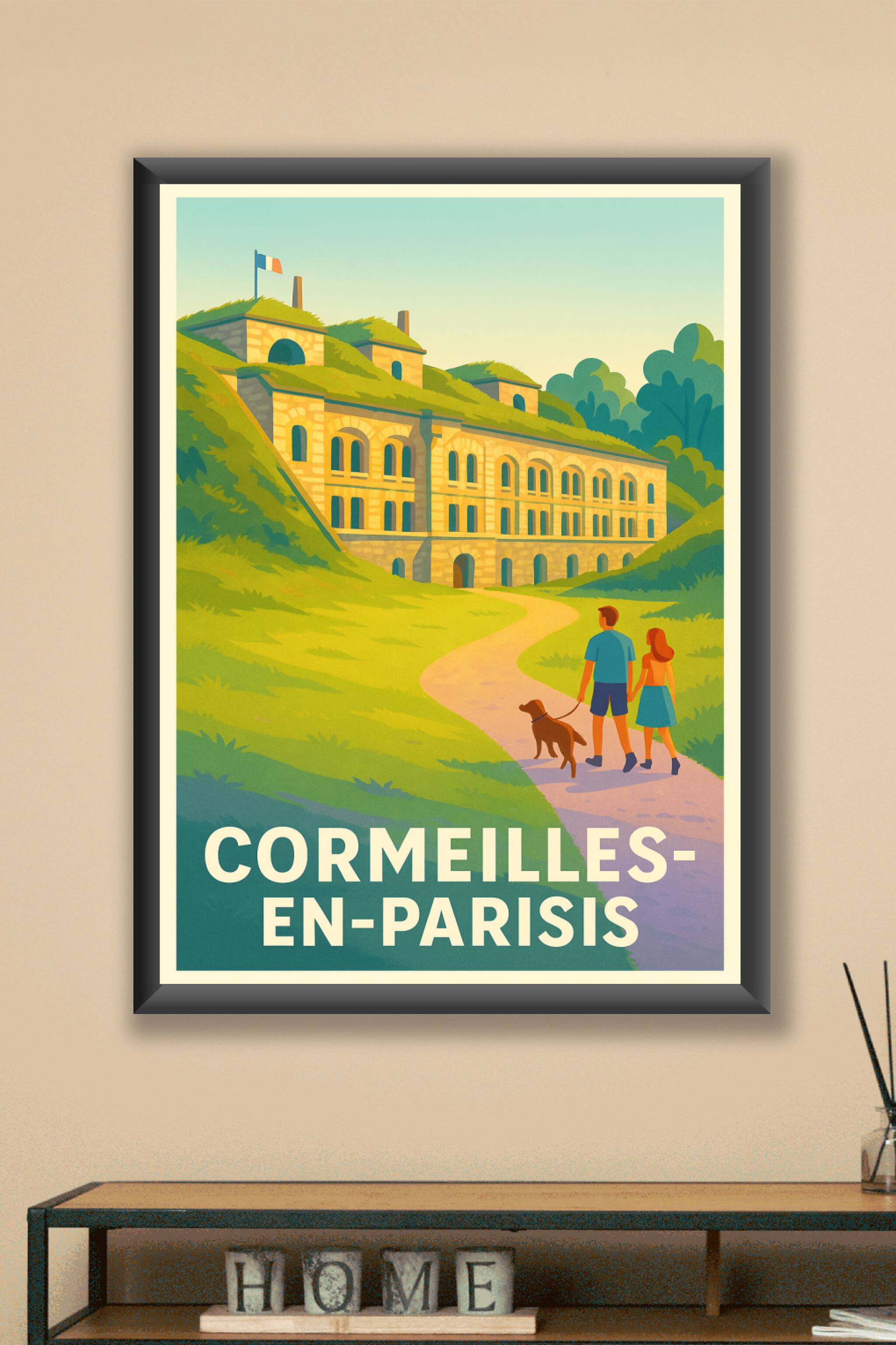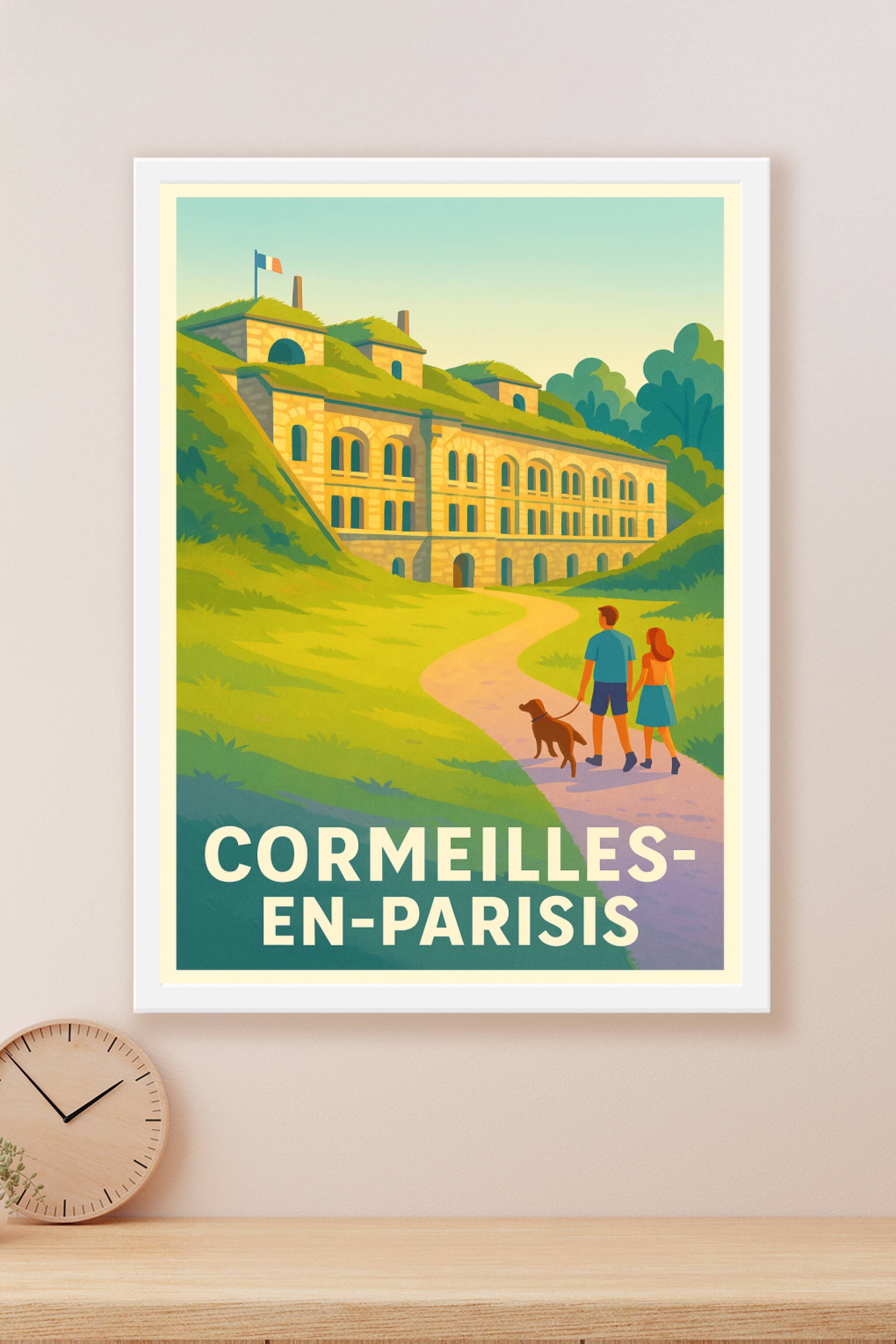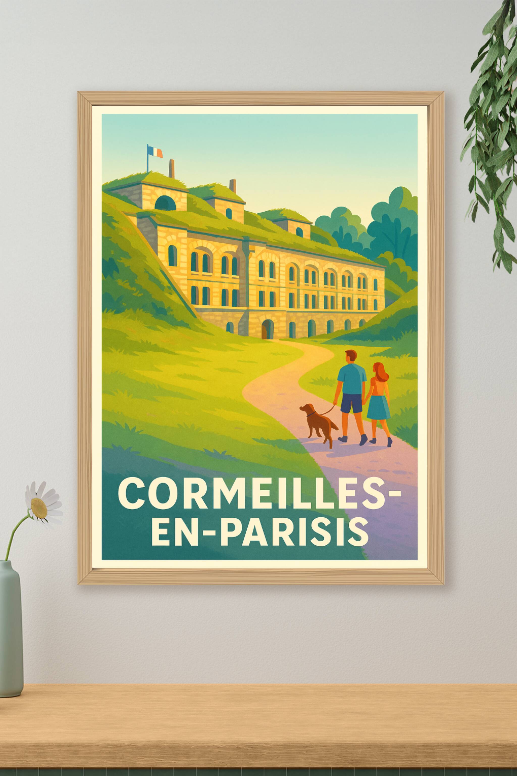Découvrez la beauté authentique de Cormeilles-en-Parisis avec cette affiche rétro illustrant la forteresse emblématique et son environnement verdoy...