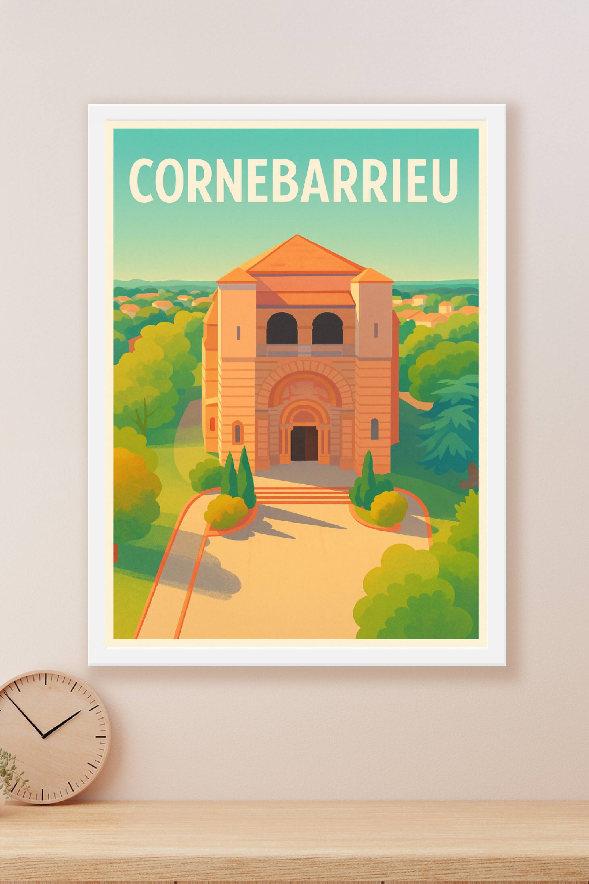 Découvrez la charmante ville de Cornebarrieu à travers cette affiche illustrée mettant en valeur un édifice historique emblématique, entouré de ver...