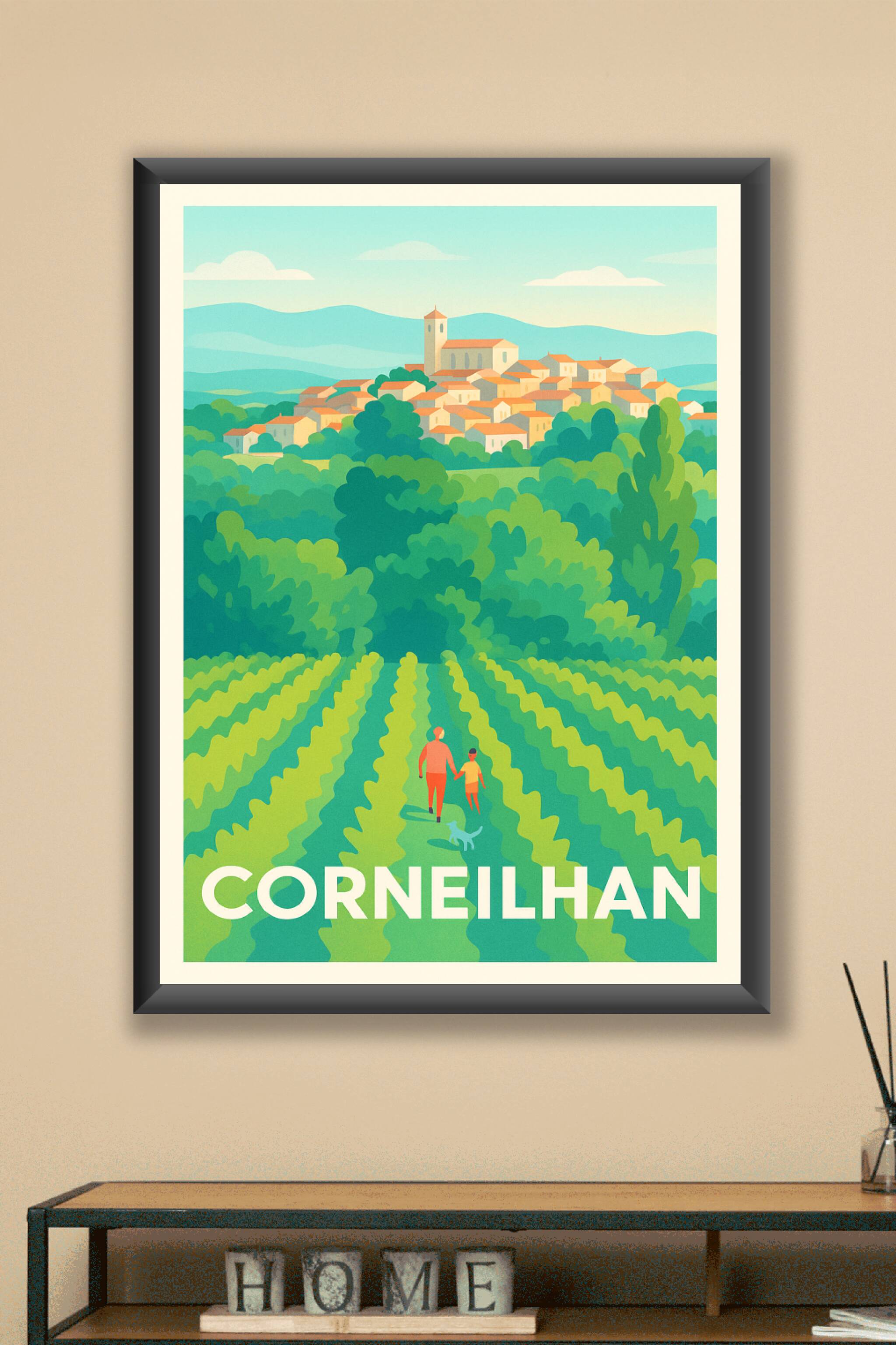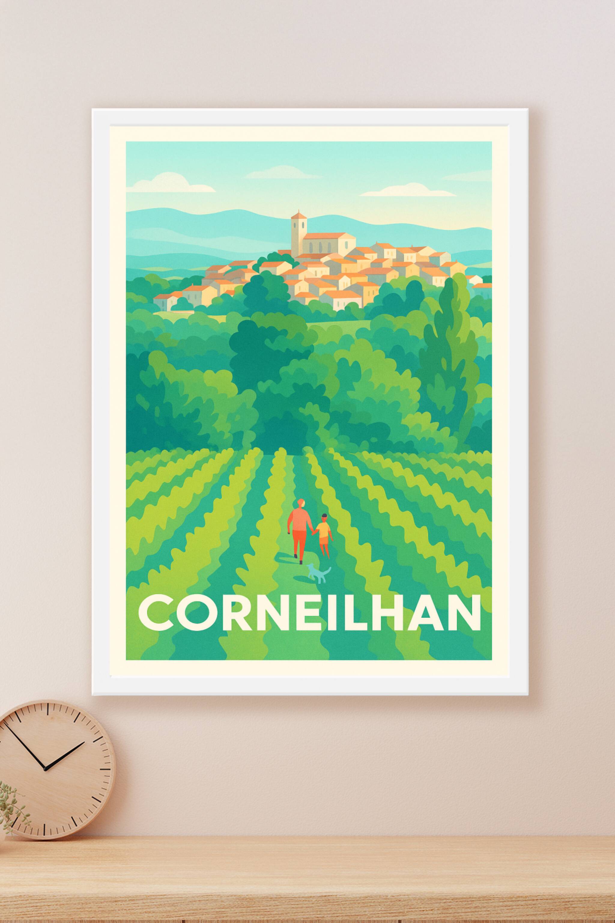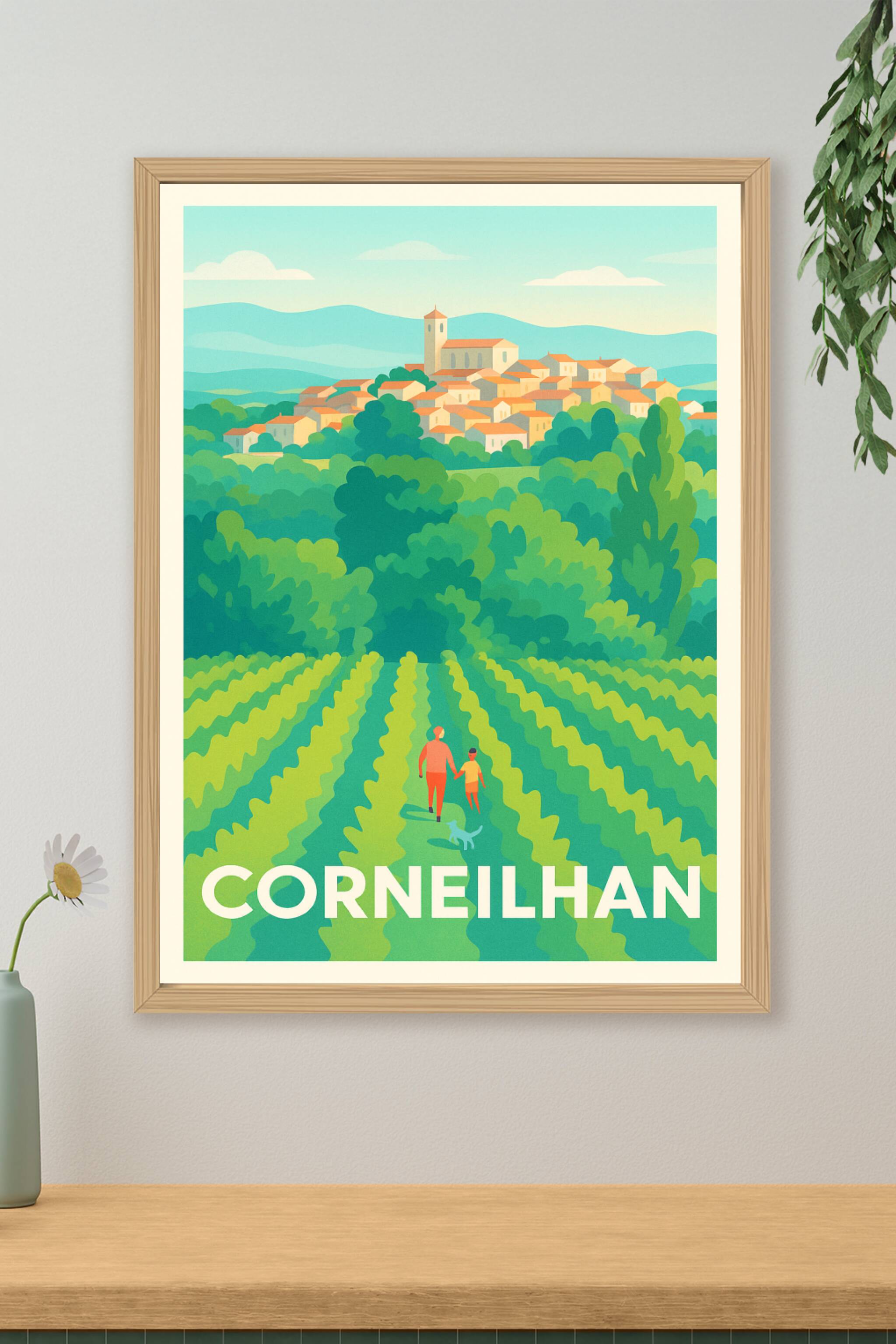 Découvrez la douceur de vivre à Corneilhan avec cette affiche illustrée aux teintes apaisantes et modernes. Le village se dévoile au loin, niché en...