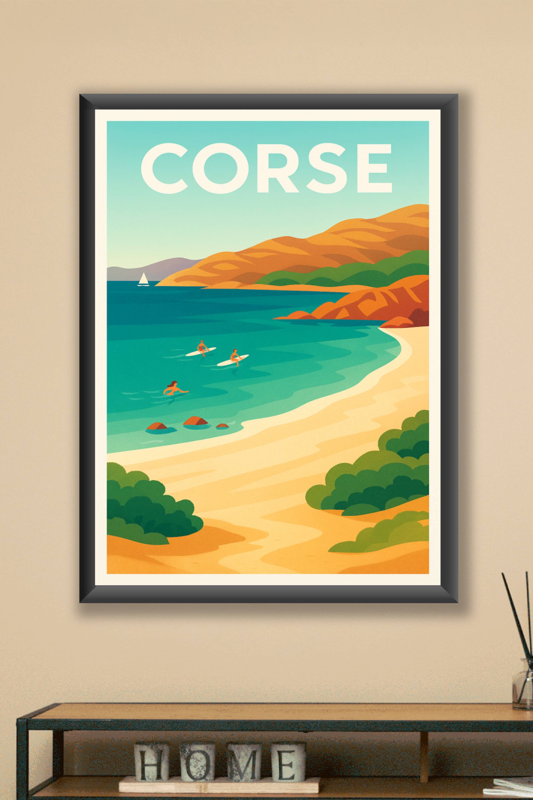 Découvrez la sérénité et la beauté sauvage de la Corse à travers cette affiche illustrée aux couleurs douces et chaleureuses, représentant une plag...