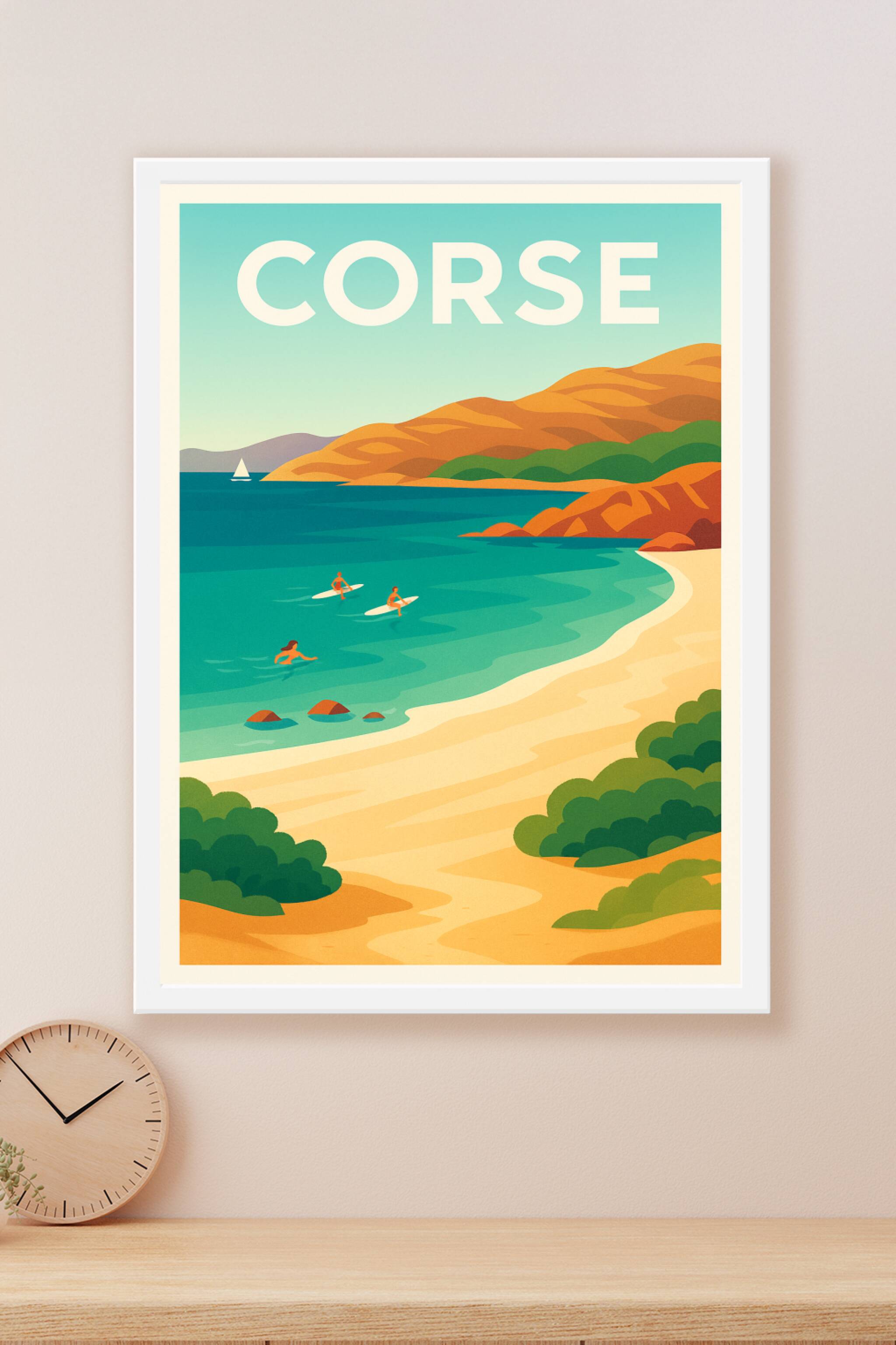 Découvrez la sérénité et la beauté sauvage de la Corse à travers cette affiche illustrée aux couleurs douces et chaleureuses, représentant une plage paradisiaque où se mêlent montagnes dorées, mer turquoise et baigneurs en harmonie avec la nature. Ce poster est imprimé en tirage "Fine Art" sur papier 305g coton pour une qualité d'impression supérieure, offrant une grande finesse dans les détails et une durabilité optimale. Disponible en plusieurs formats, de A1 à A4, avec ou sans cadre, cette affiche apportera une touche d'évasion et d'élégance à votre intérieur. Fabriquée 100% en France, elle constitue un cadeau idéal pour tous les amoureux de la Corse et les passionnés de voyages.