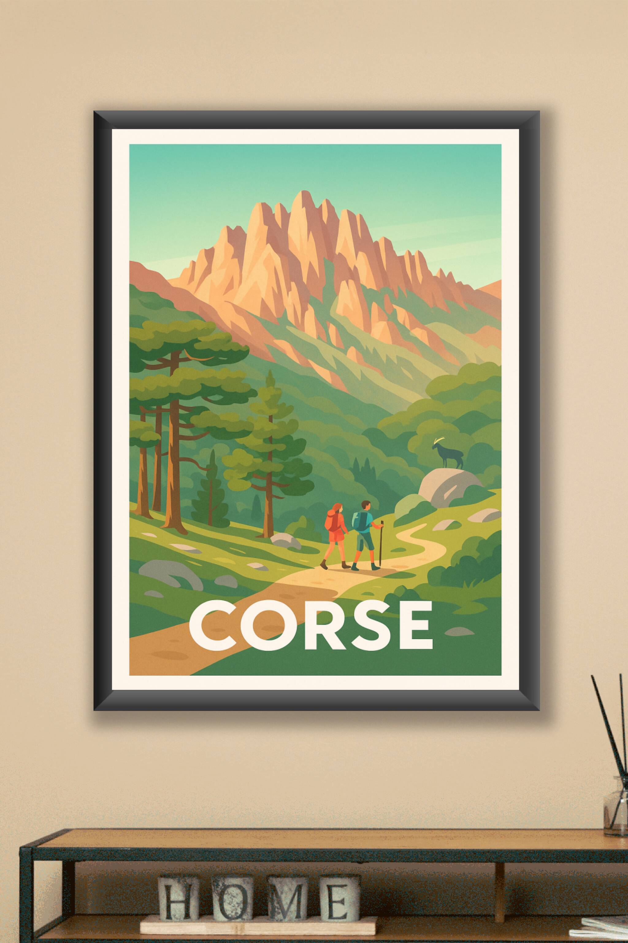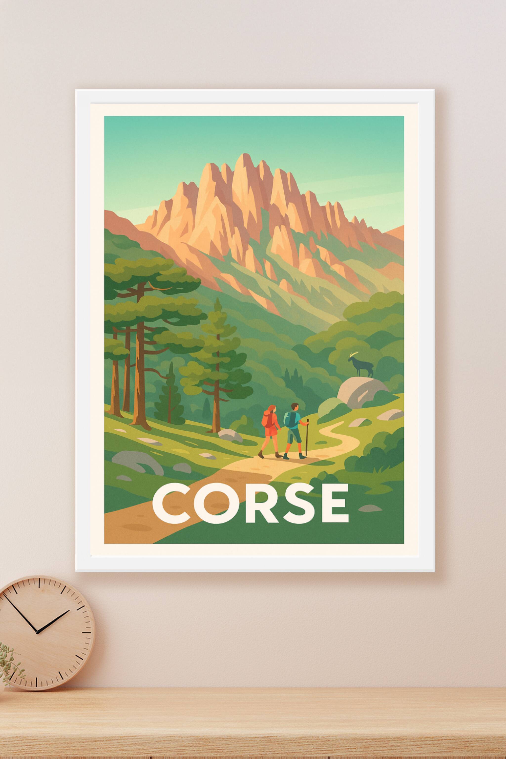 Cette affiche vintage vous transporte au cœur des magnifiques paysages montagneux de Corse, entre forêts verdoyantes et sommets impressionnants bai...