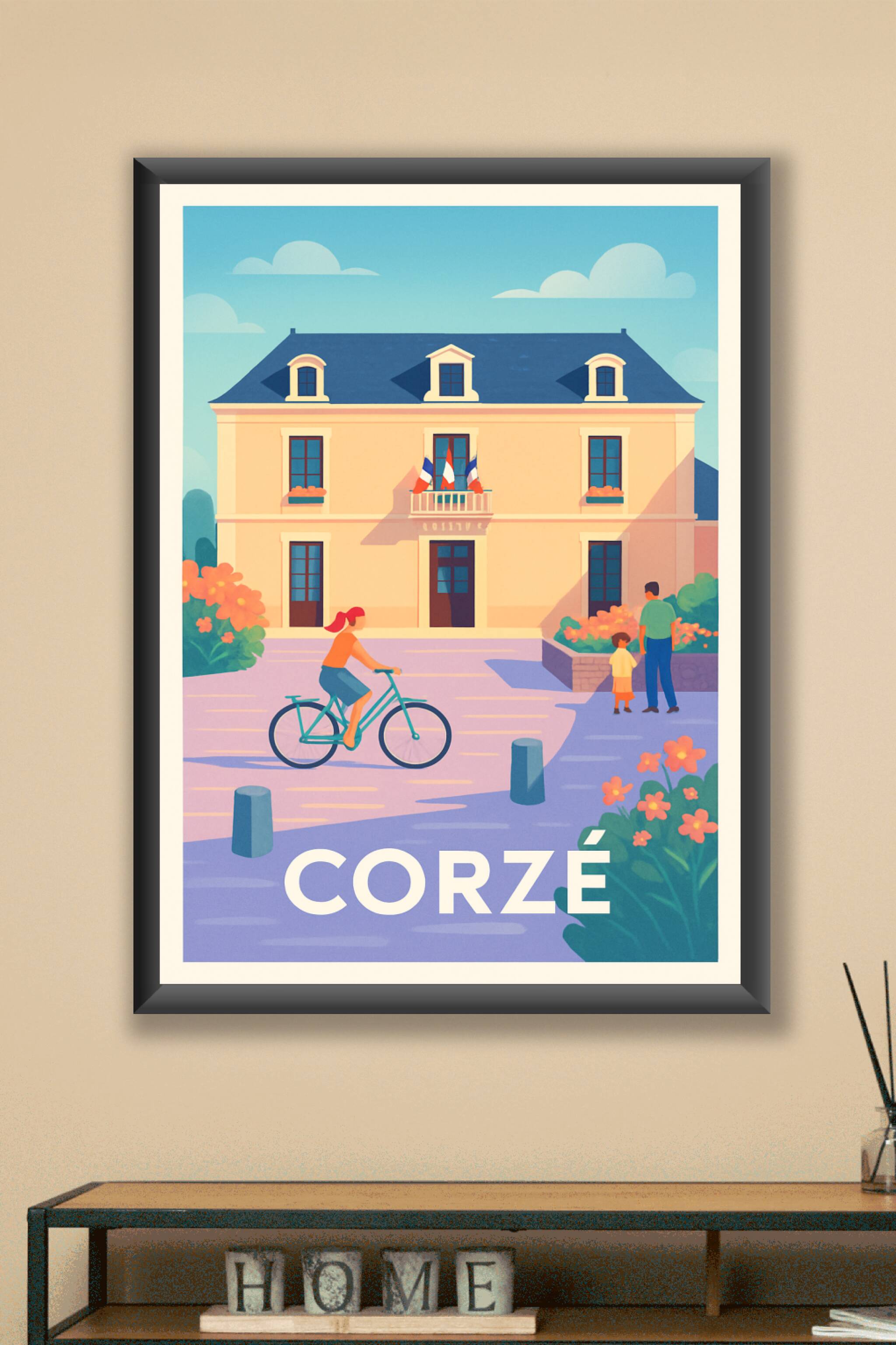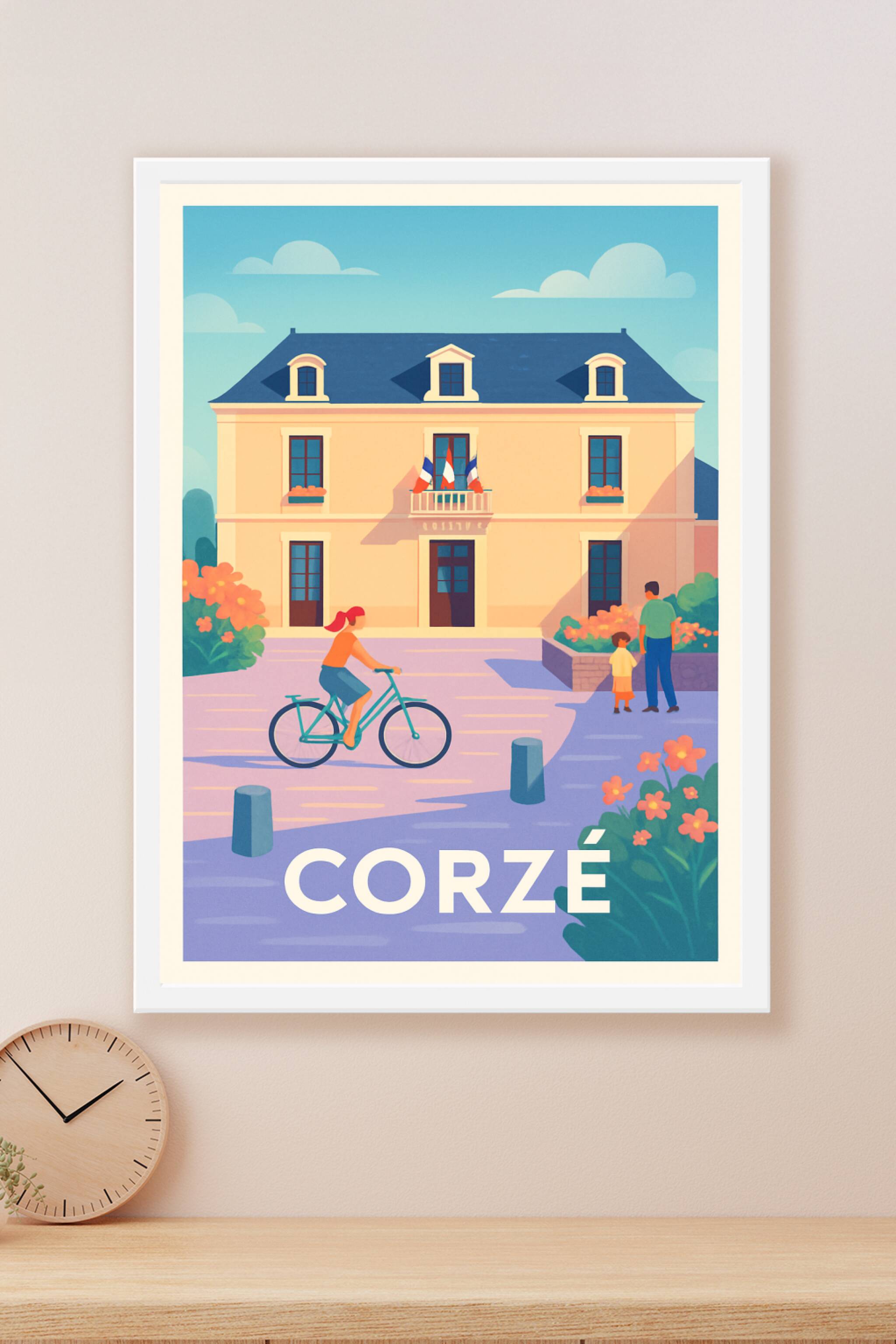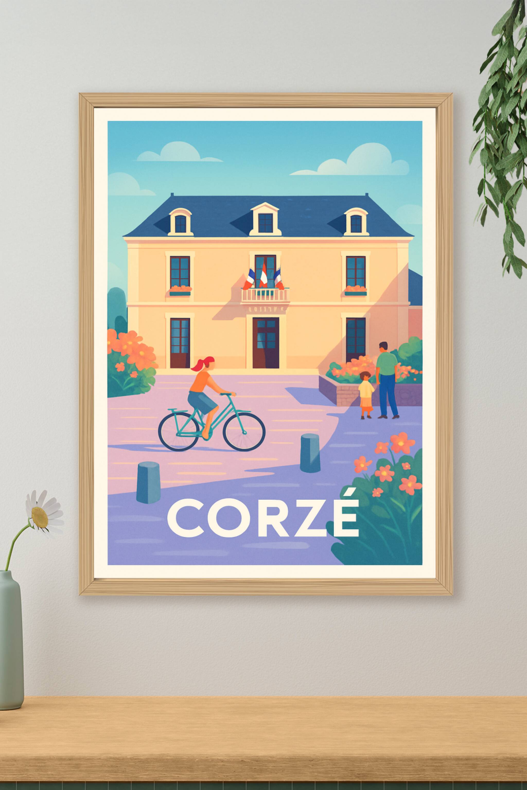 Découvrez l'atmosphère chaleureuse et paisible de Corzé avec cette affiche au style illustratif et coloré, mettant en scène la mairie emblématique ...