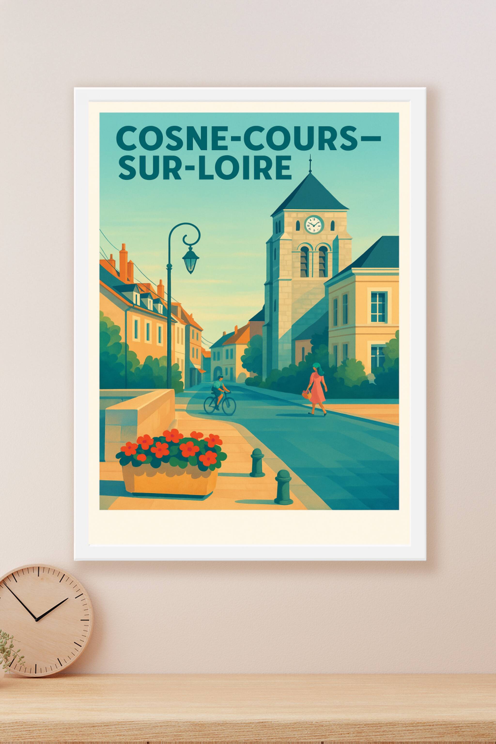 Découvrez l'atmosphère paisible et emblématique de Cosne-Cours-sur-Loire à travers cette affiche illustrée représentant ses rues calmes et son arch...