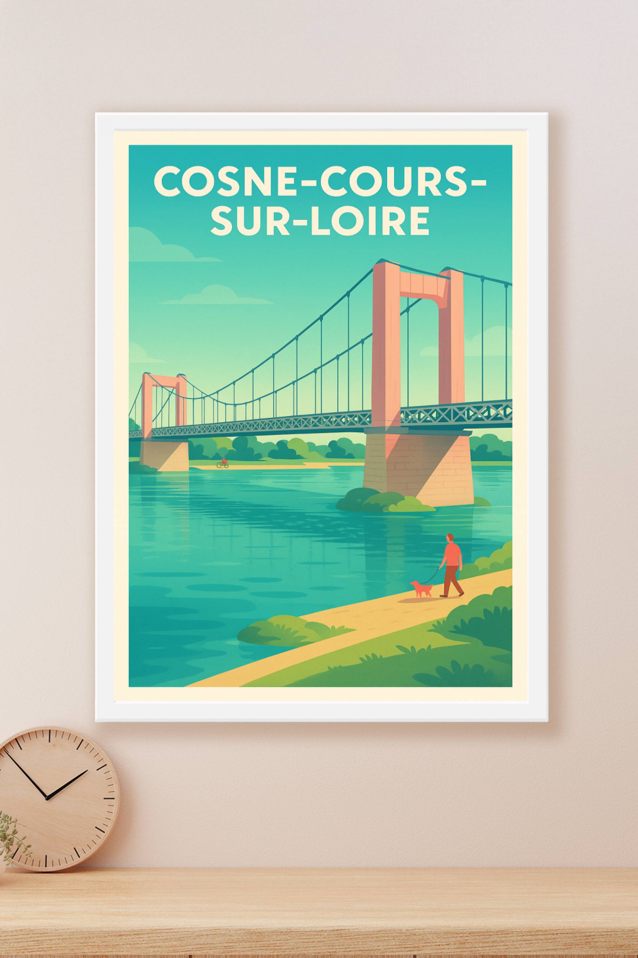 Découvrez la quiétude de Cosne-Cours-sur-Loire avec cette magnifique affiche illustrée mettant en scène le pont suspendu emblématique sur la Loire....