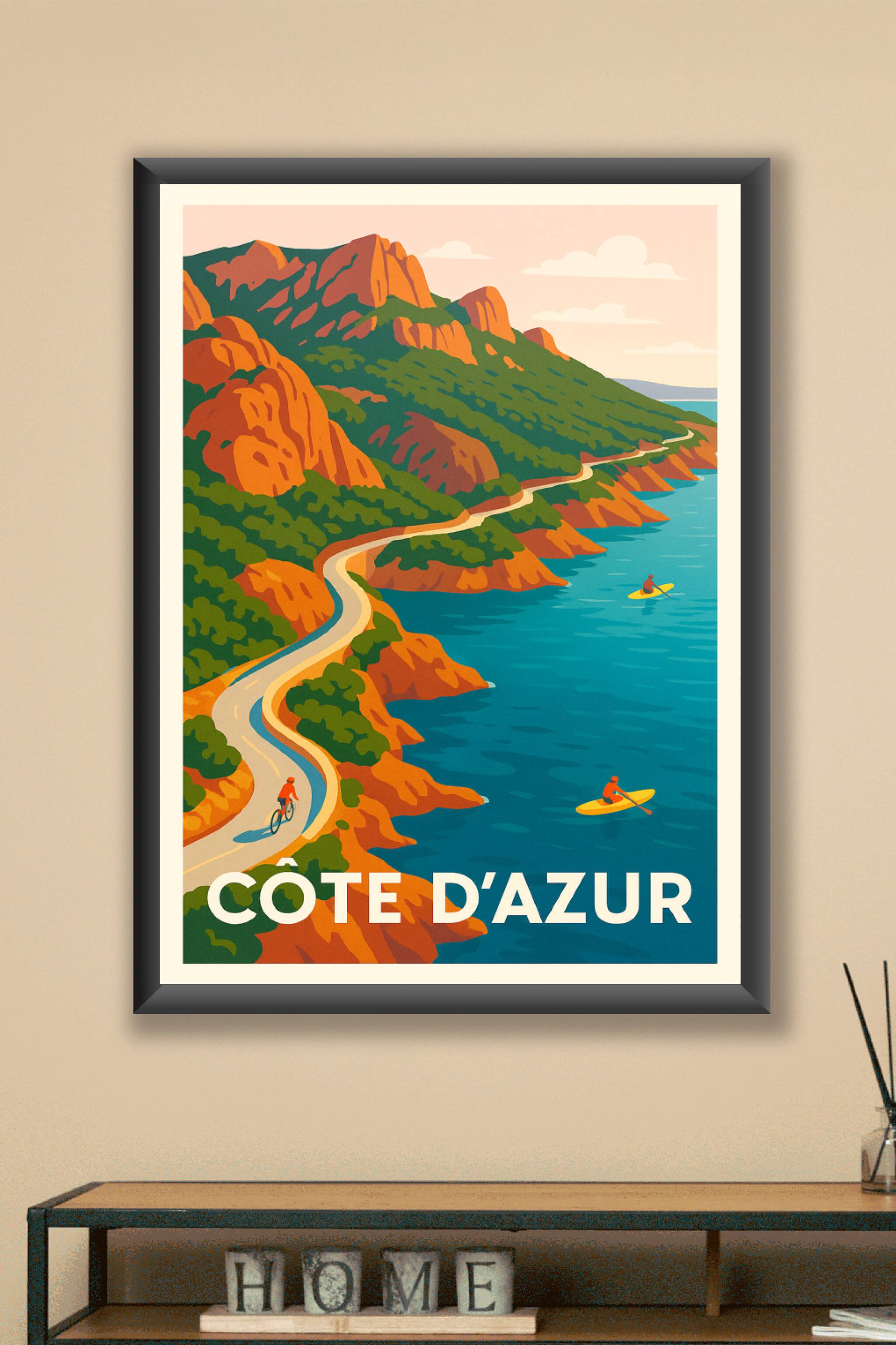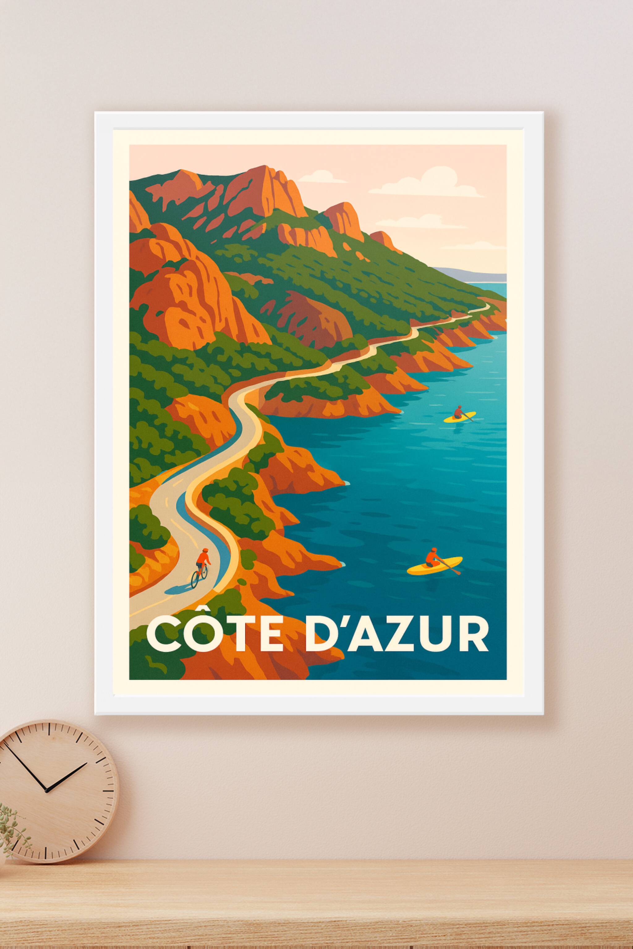 Découvrez cette superbe affiche illustrée qui capture la beauté sauvage et colorée de la Côte d'Azur, avec ses falaises ocres, ses eaux turquoise e...