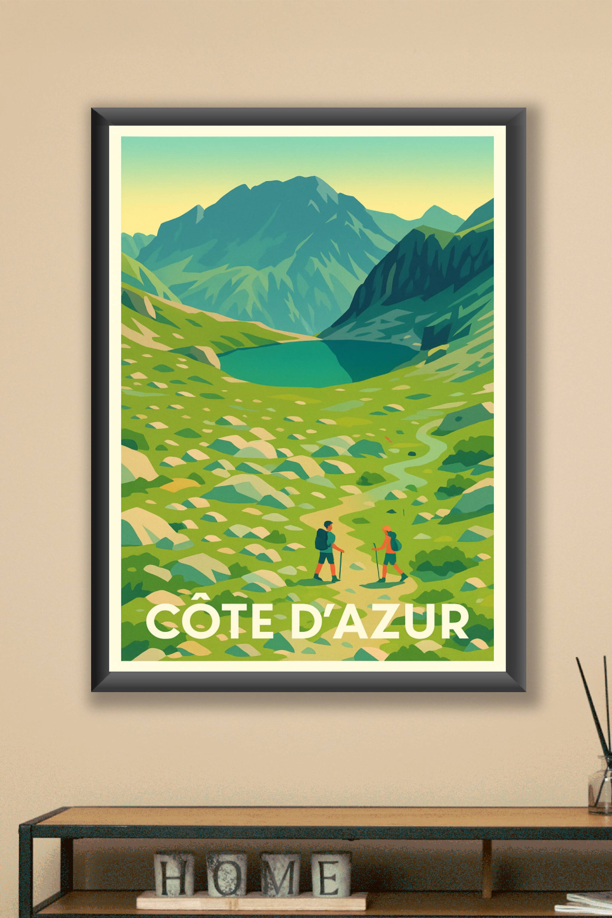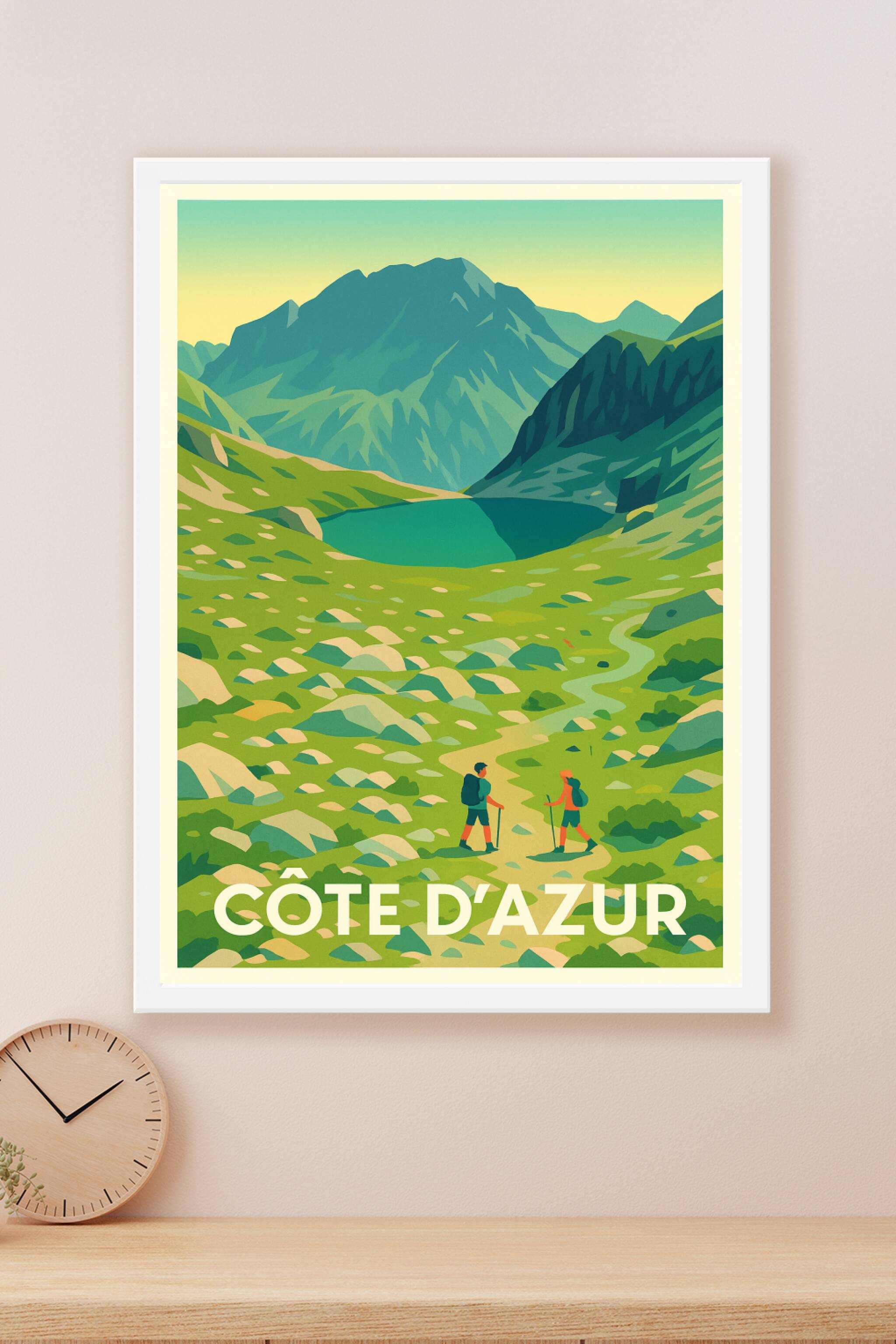 Découvrez la beauté sauvage et apaisante de la Côte d'Azur avec cette affiche illustrant une randonnée au cœur des montagnes verdoyantes et d'un la...