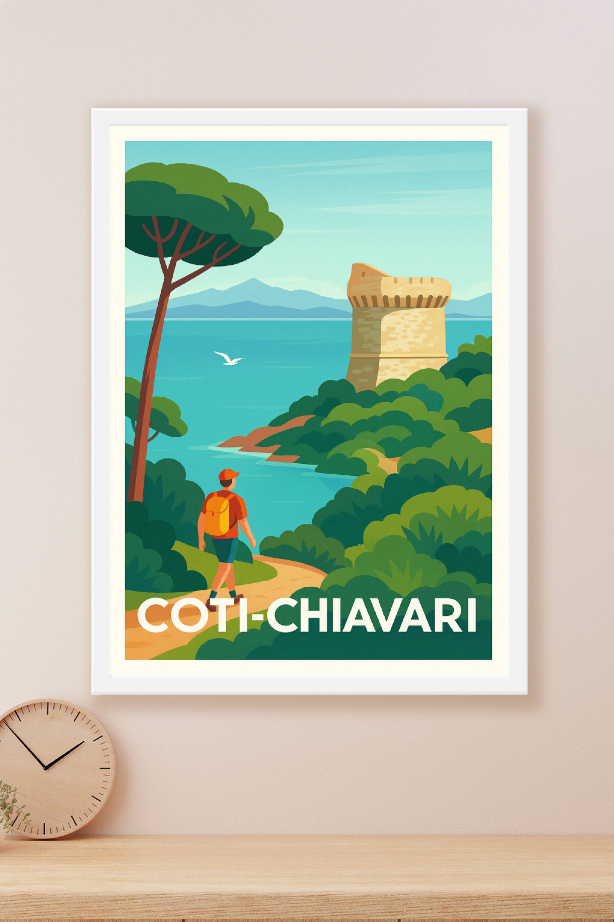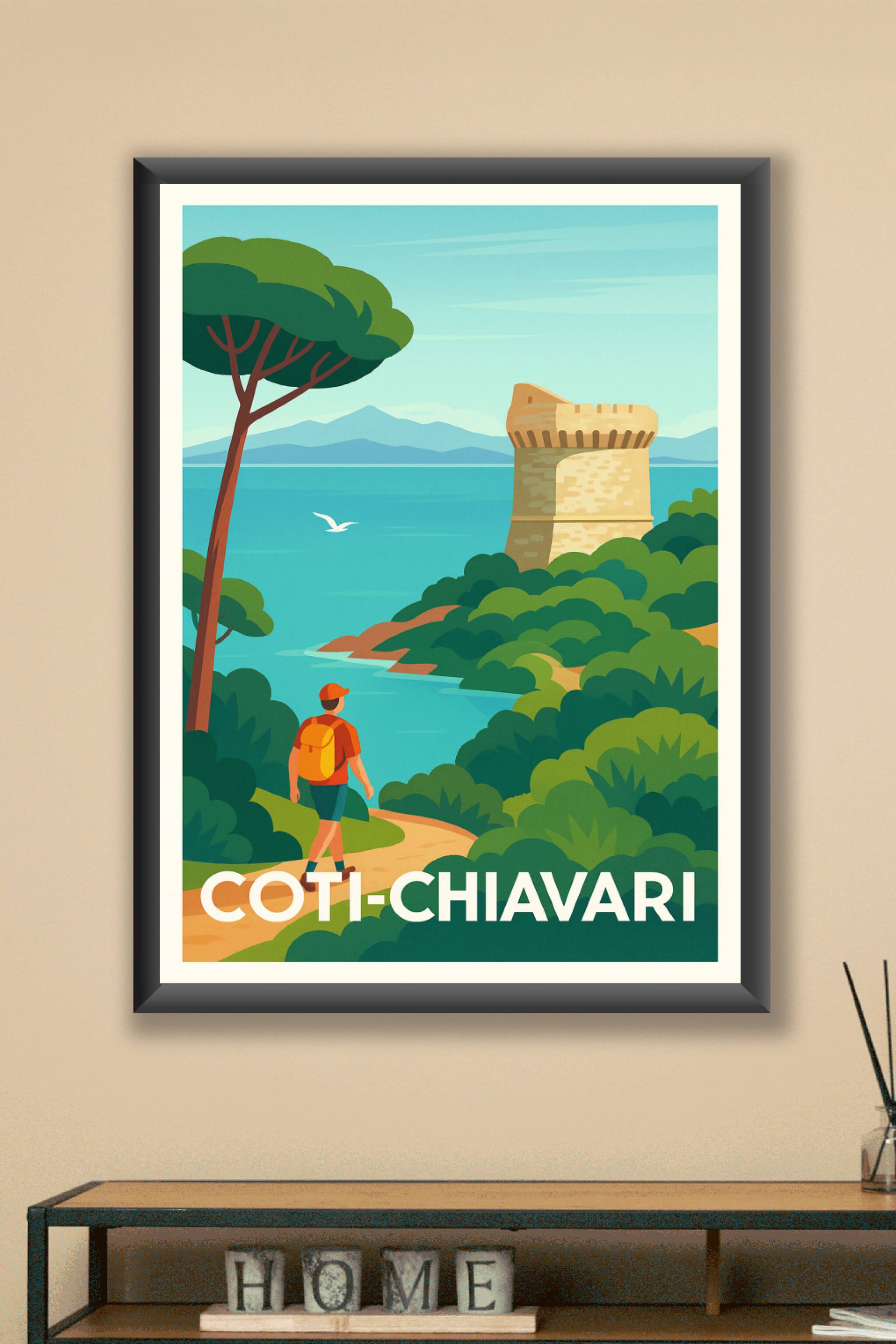 Découvrez la beauté naturelle et historique de Coti-Chiavari avec cette affiche illustrée au style vintage et coloré. Admirez la tour génoise emblé...