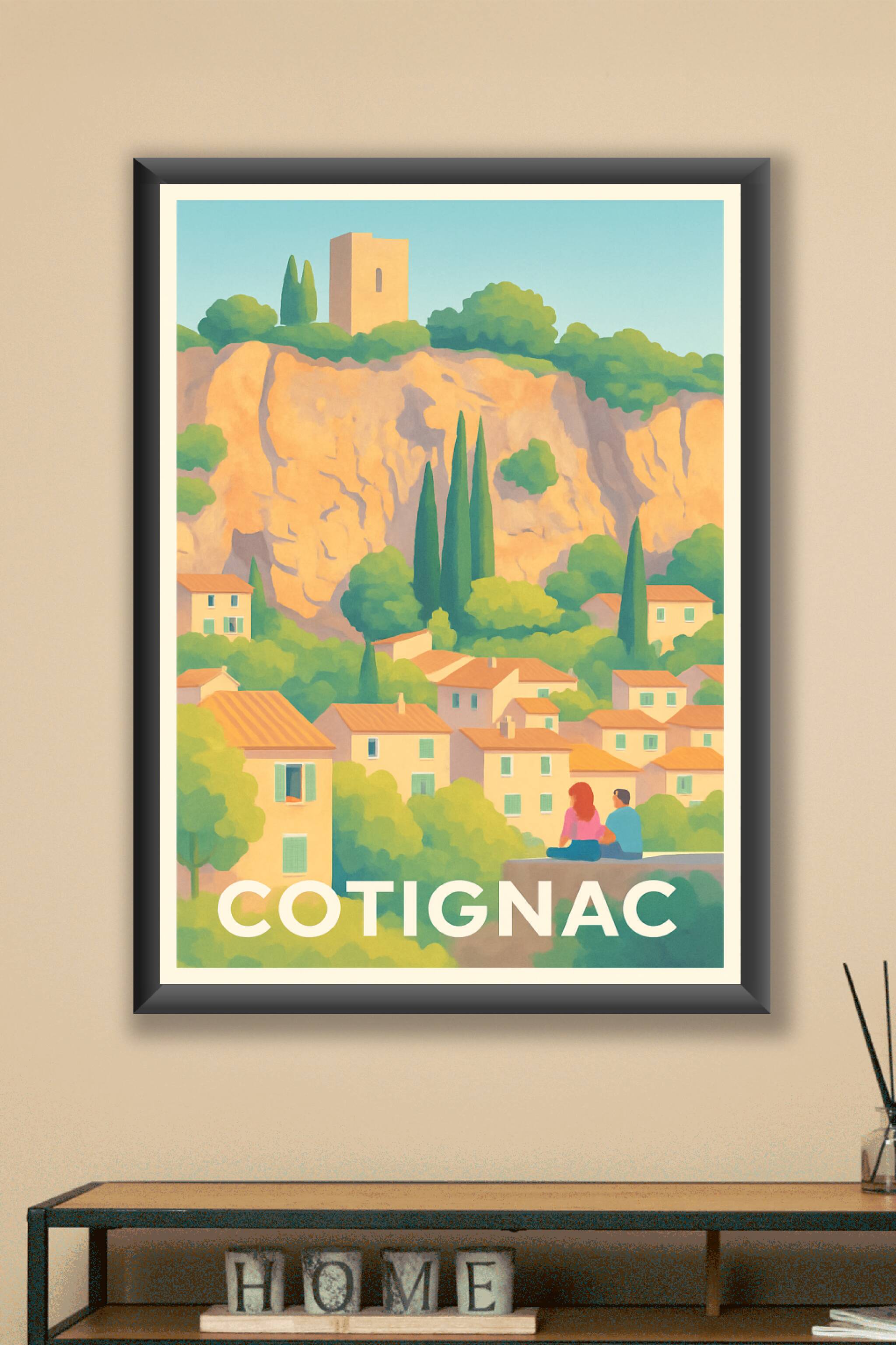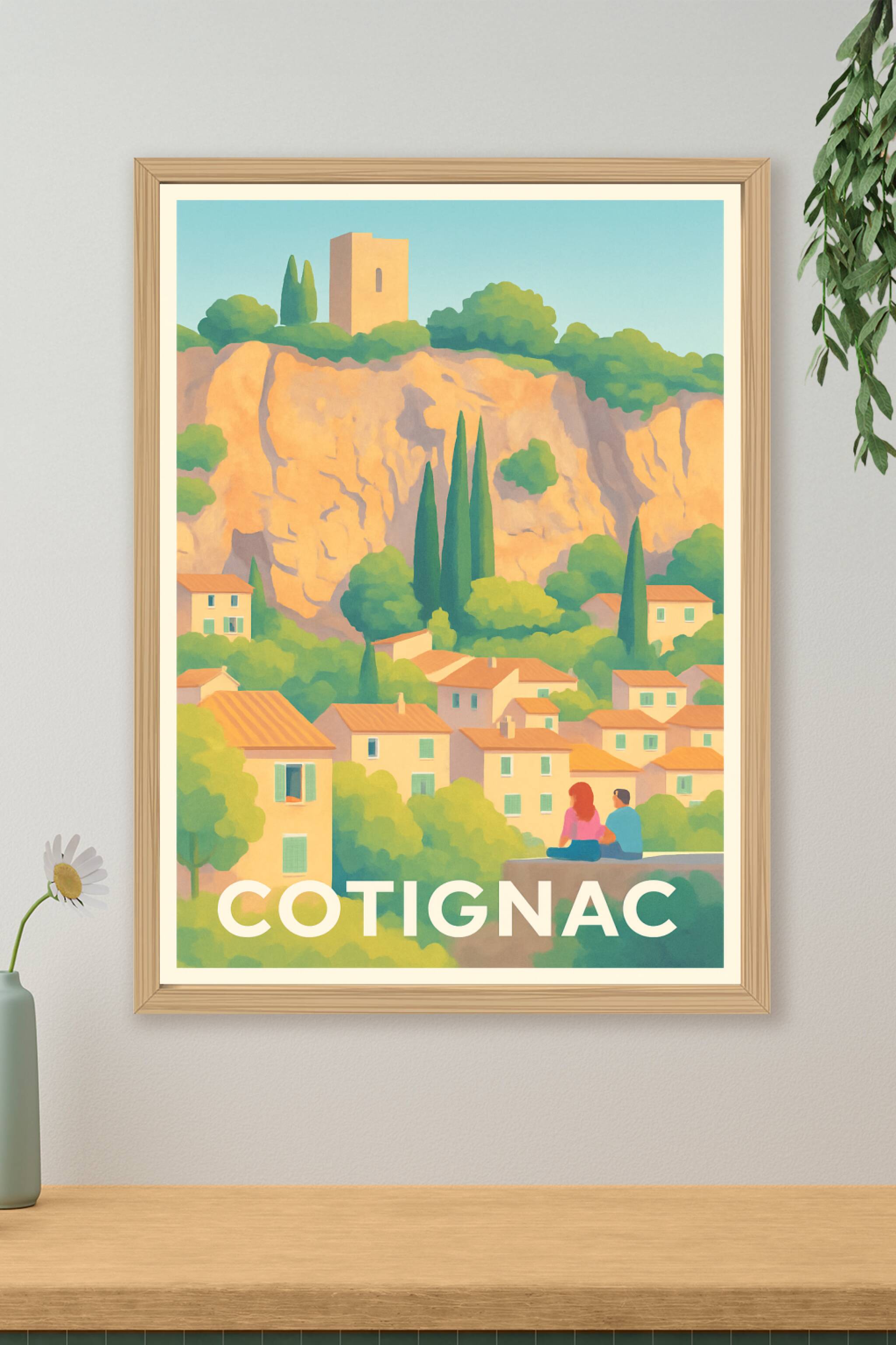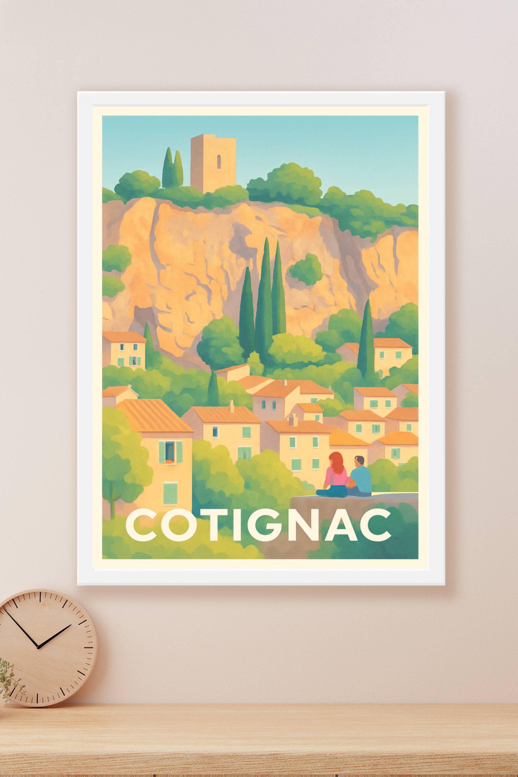 Découvrez la douceur de vivre en Provence avec cette affiche illustrant le village pittoresque de Cotignac, niché au pied de falaises impressionnan...