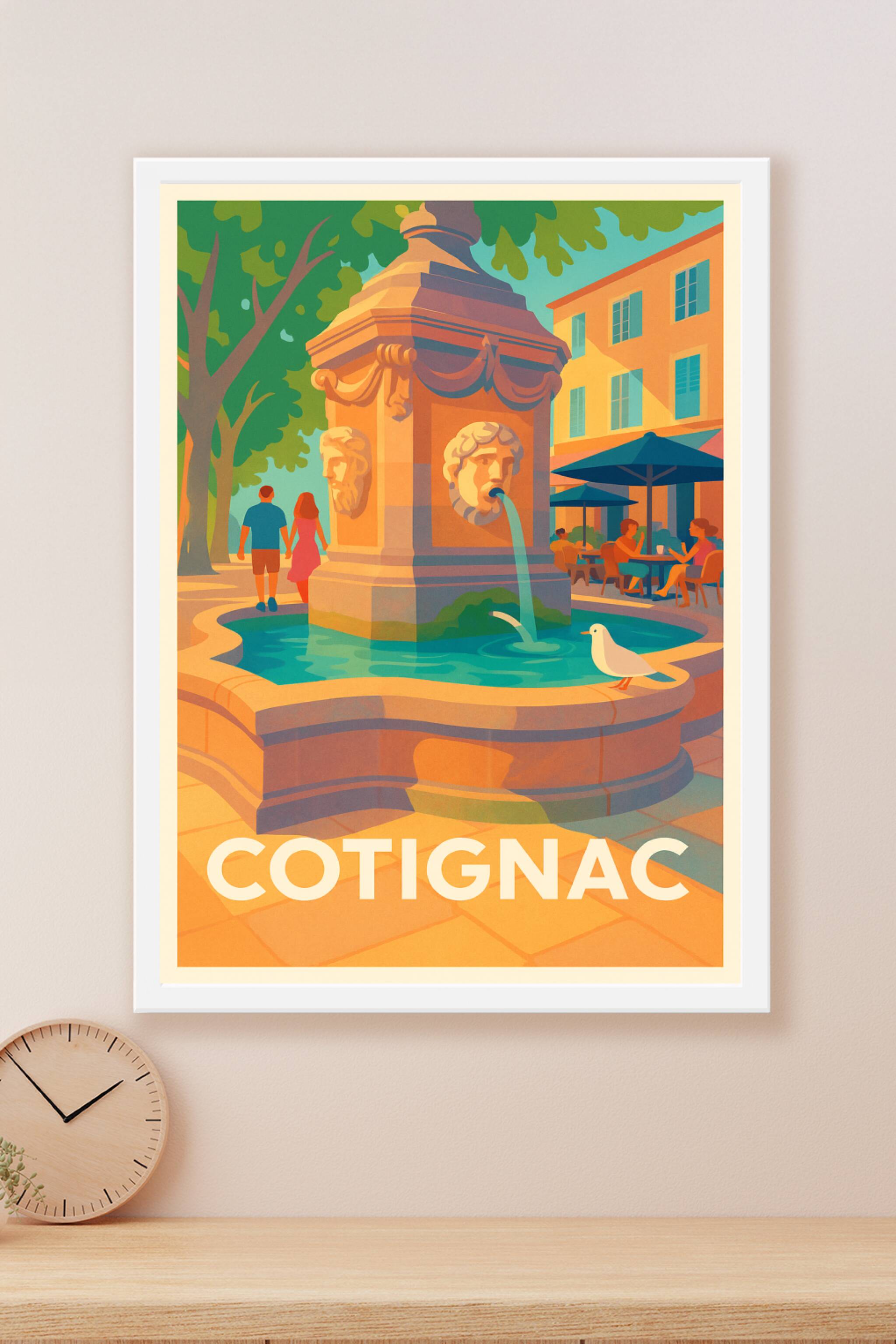 Découvrez l'élégance bucolique de Cotignac avec cette affiche représentant une fontaine emblématique baignée par la lumière dorée du soleil provençal. Ce poster capture l'ambiance paisible d'une place ombragée, où les habitants profitent d'un moment convivial en terrasse. Imprimée en tirage Fine Art sur papier 305g coton, cette affiche offre une qualité d'impression haut de gamme, idéale pour sublimer votre décoration intérieure. Disponible en formats A1, A2, A3 et A4, avec ou sans cadre, cette œuvre est un parfait cadeau ou souvenir pour les amoureux de la Provence et ses villages authentiques.