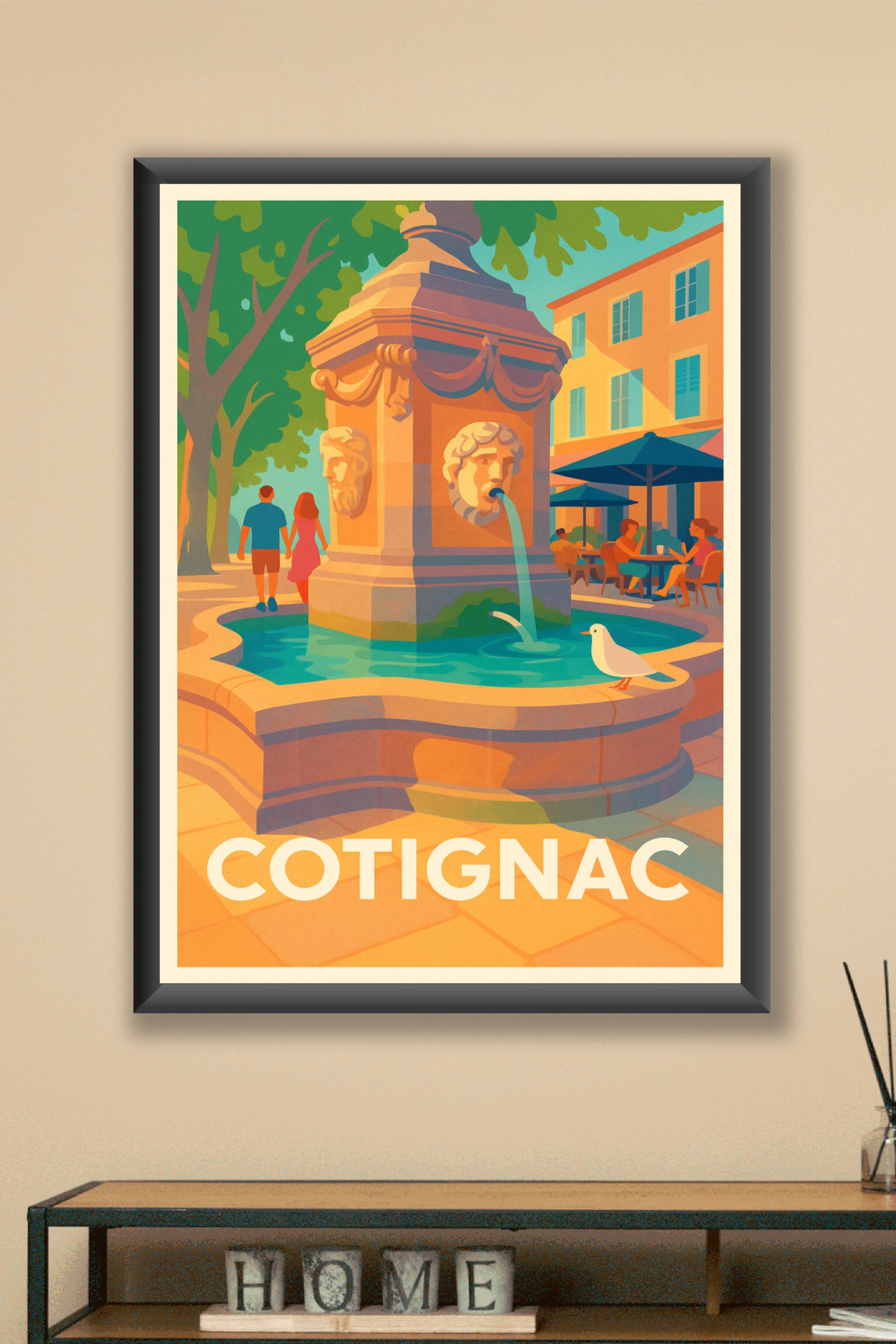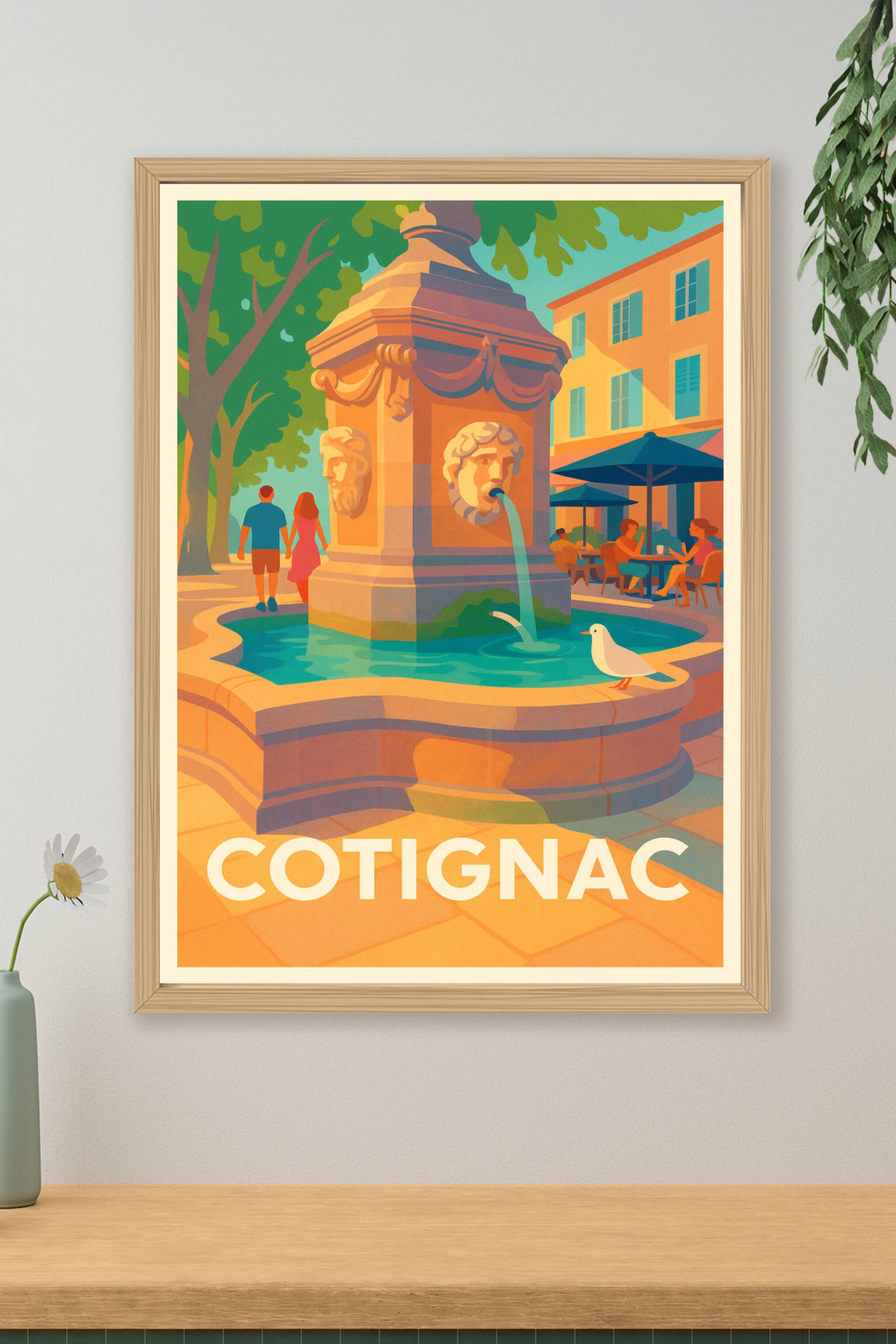 Découvrez l'élégance bucolique de Cotignac avec cette affiche représentant une fontaine emblématique baignée par la lumière dorée du soleil provenç...