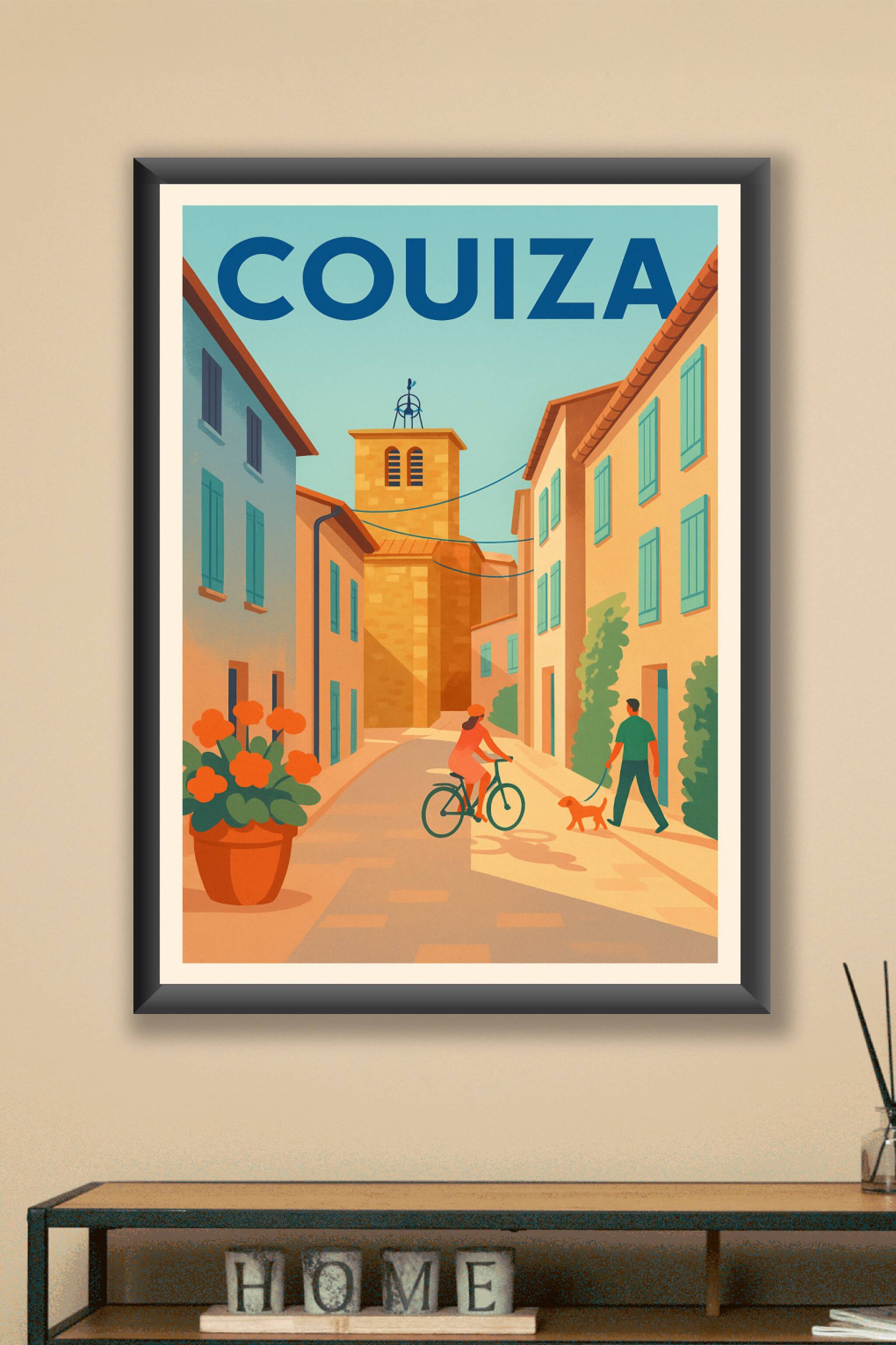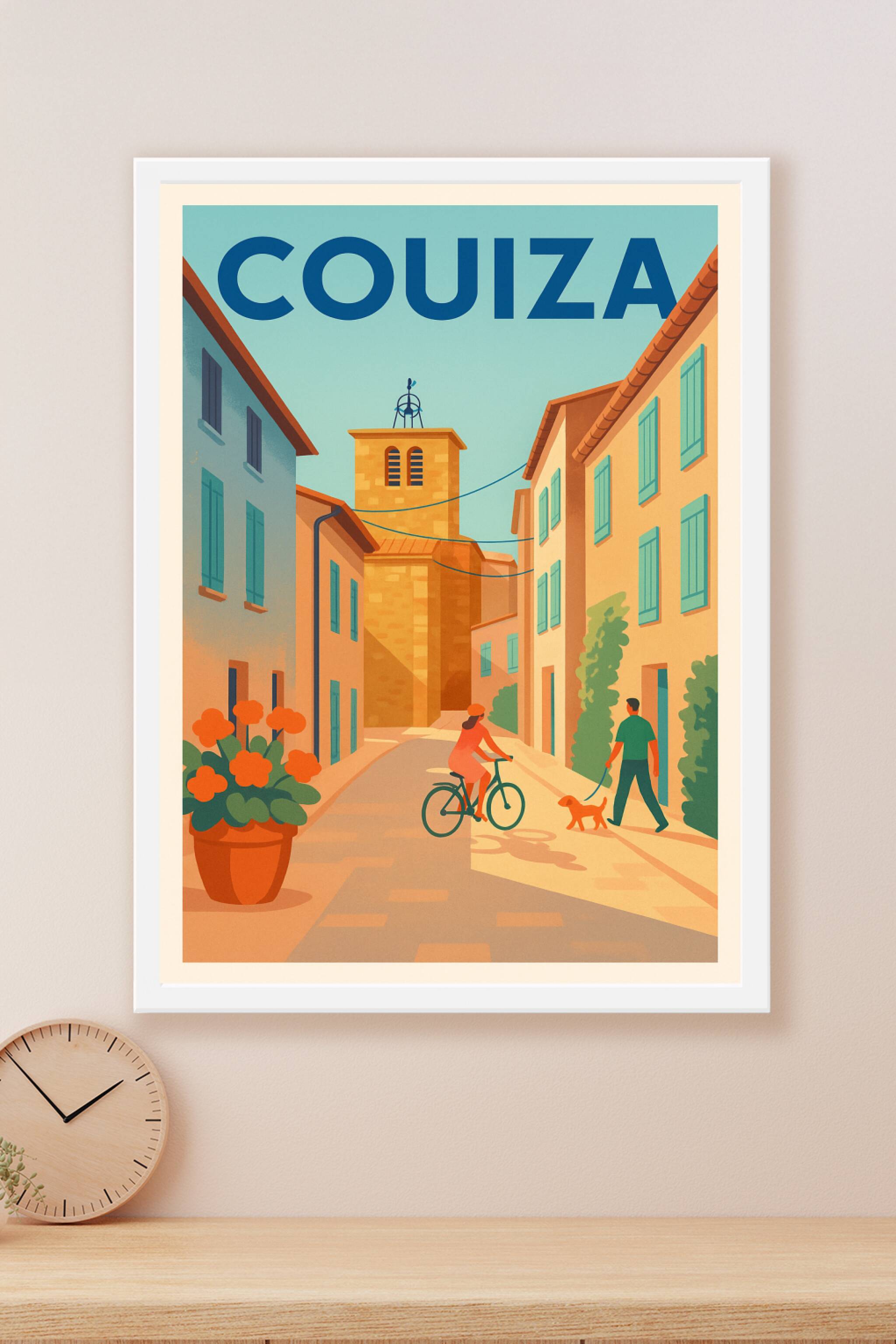 Découvrez l'atmosphère paisible et chaleureuse de Couiza avec cette affiche vintage illustrée, représentant une ruelle typique baignée par le solei...