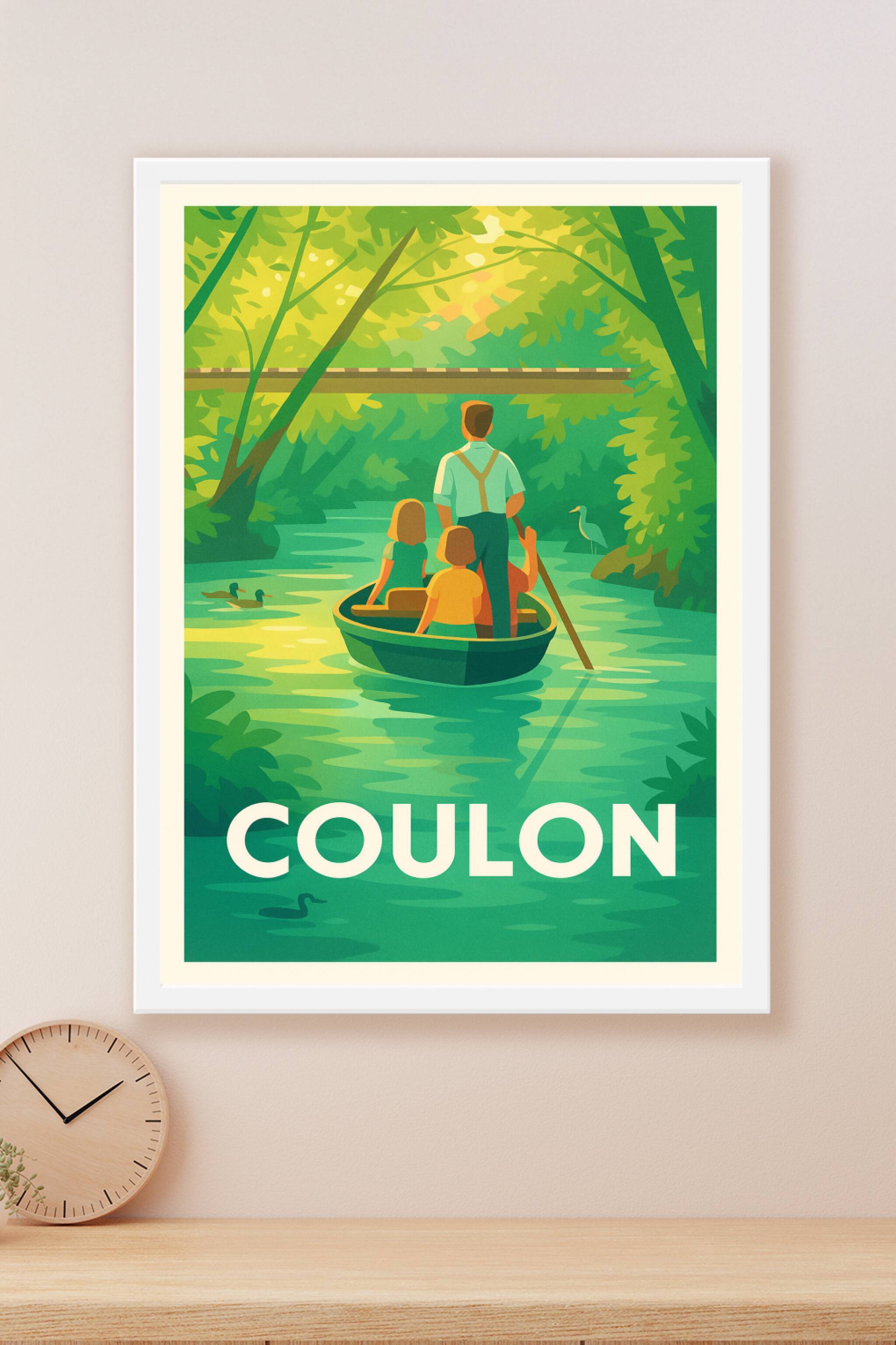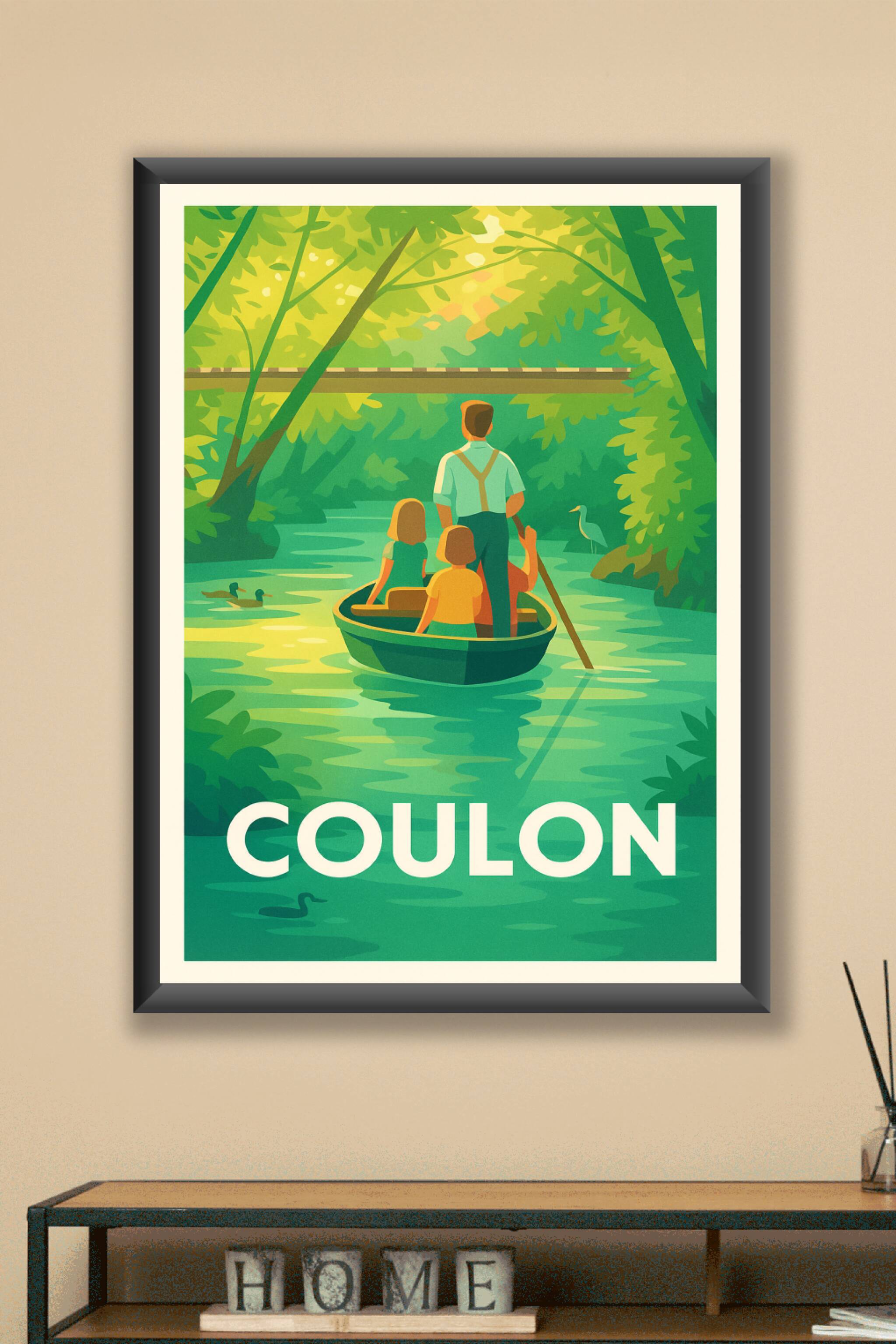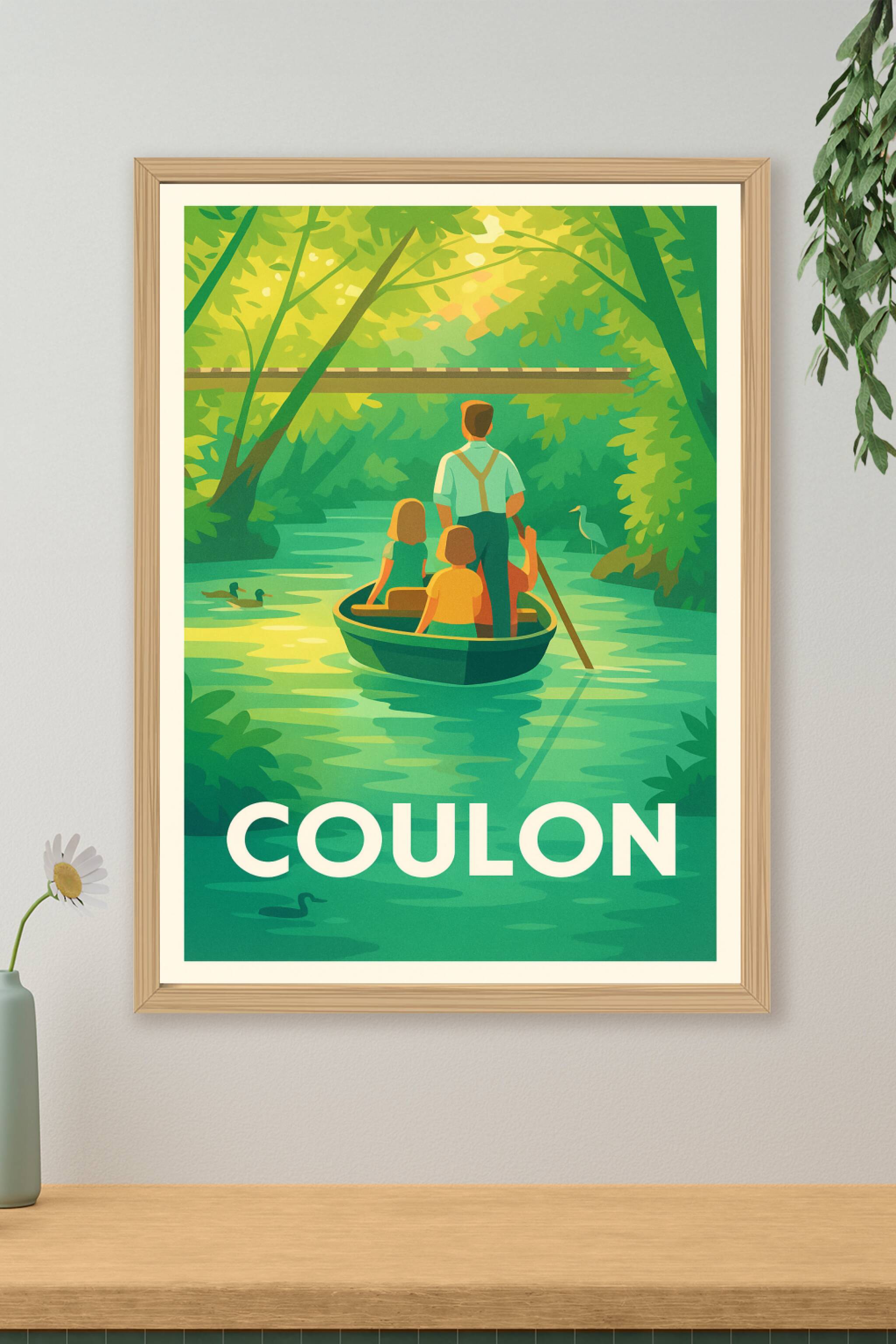 Découvrez la sérénité et la beauté naturelle de Coulon avec cette affiche illustrée représentant une paisible promenade en barque au fil de l'eau e...