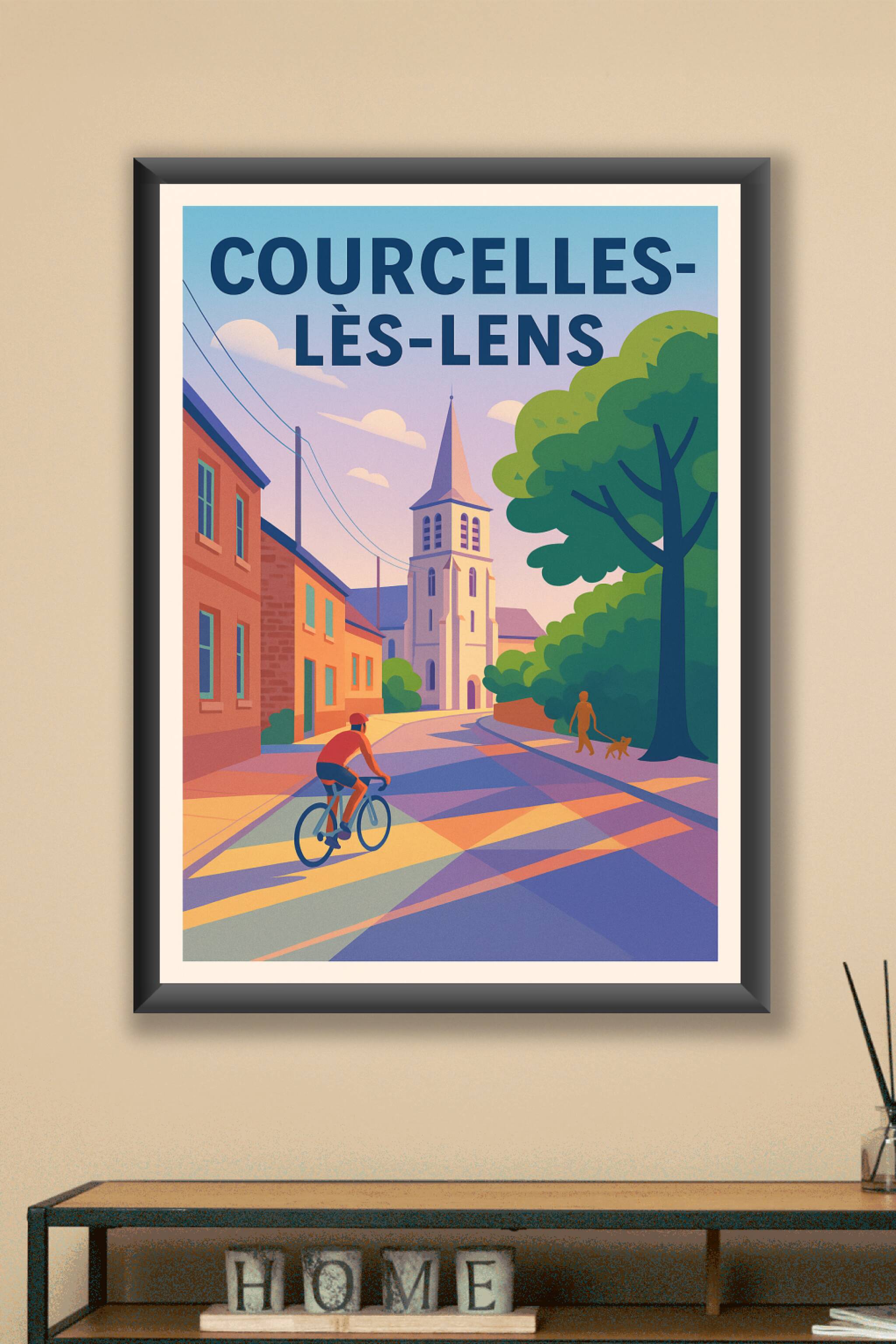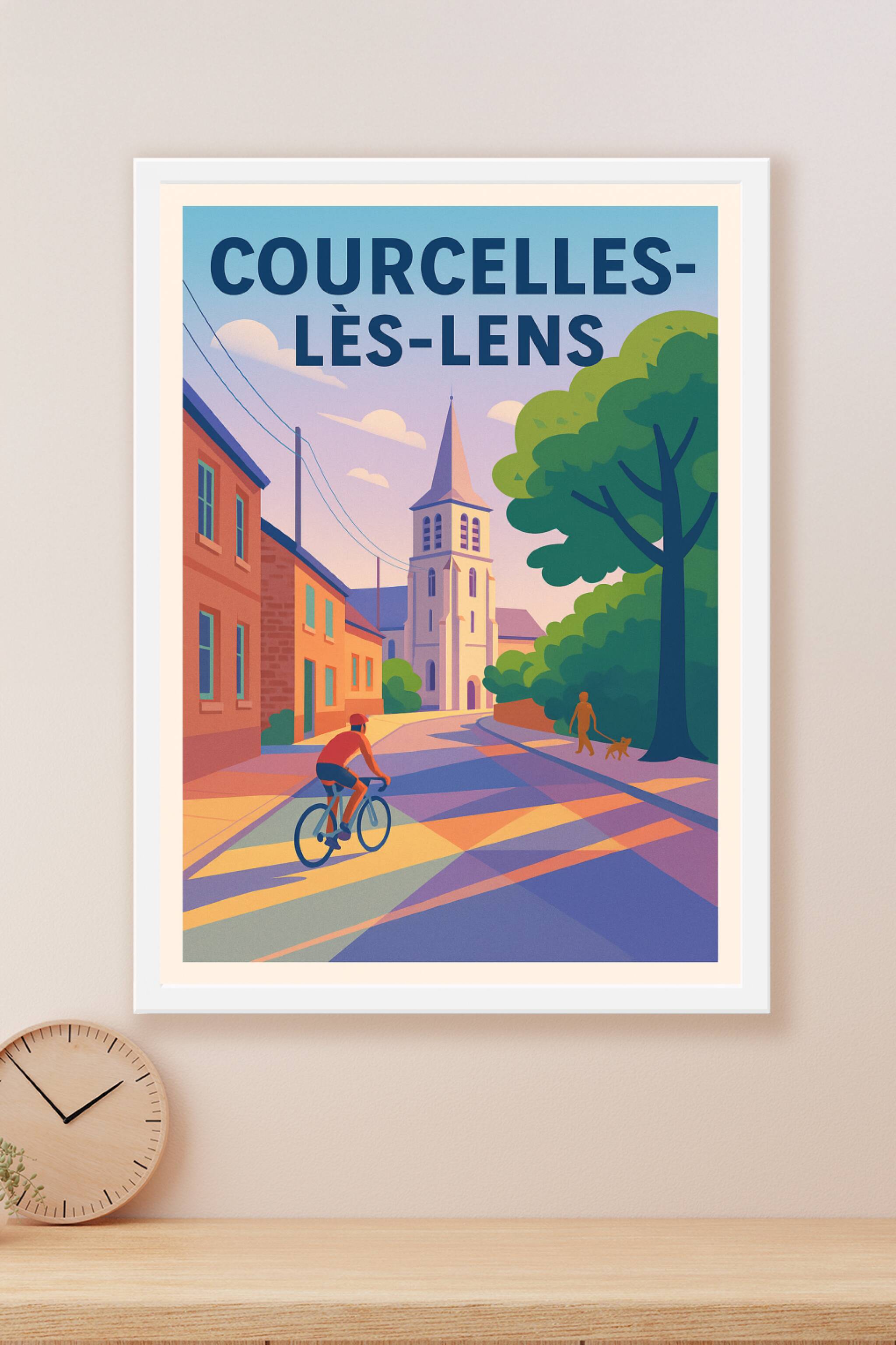 Découvrez la douceur de vivre de Courcelles-lès-Lens à travers cette affiche illustrée au style moderne et coloré. Le poster met en scène une balad...