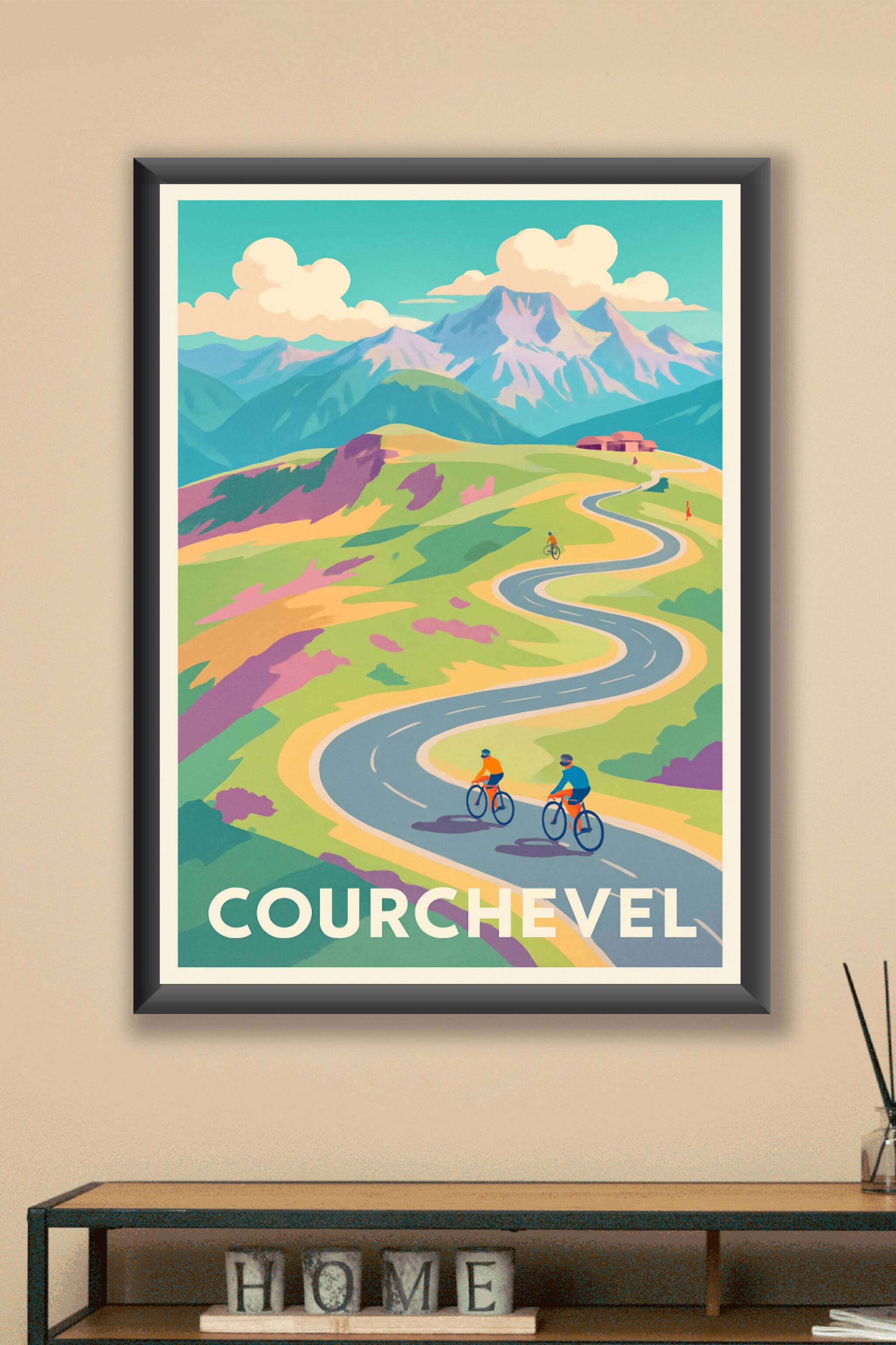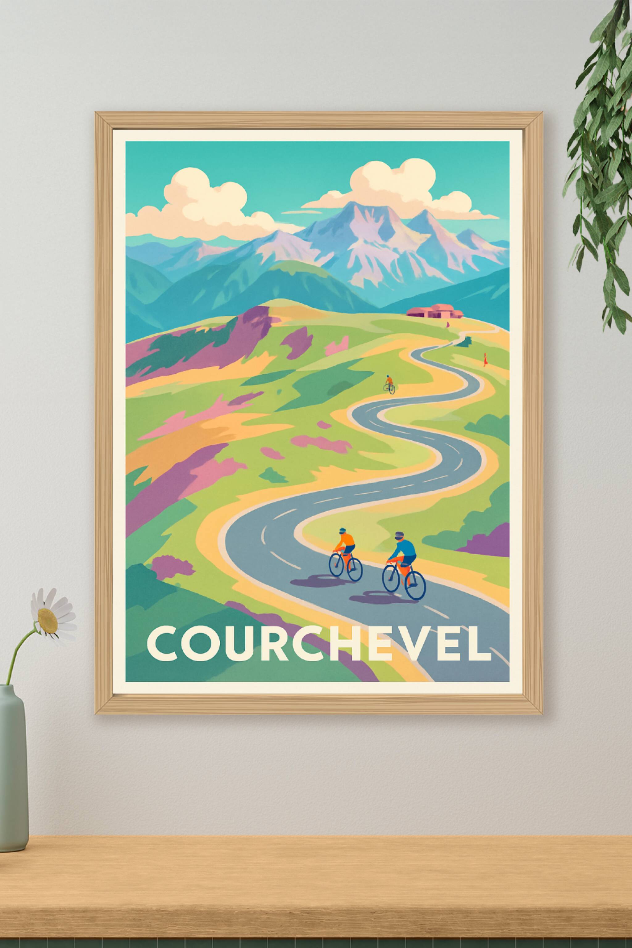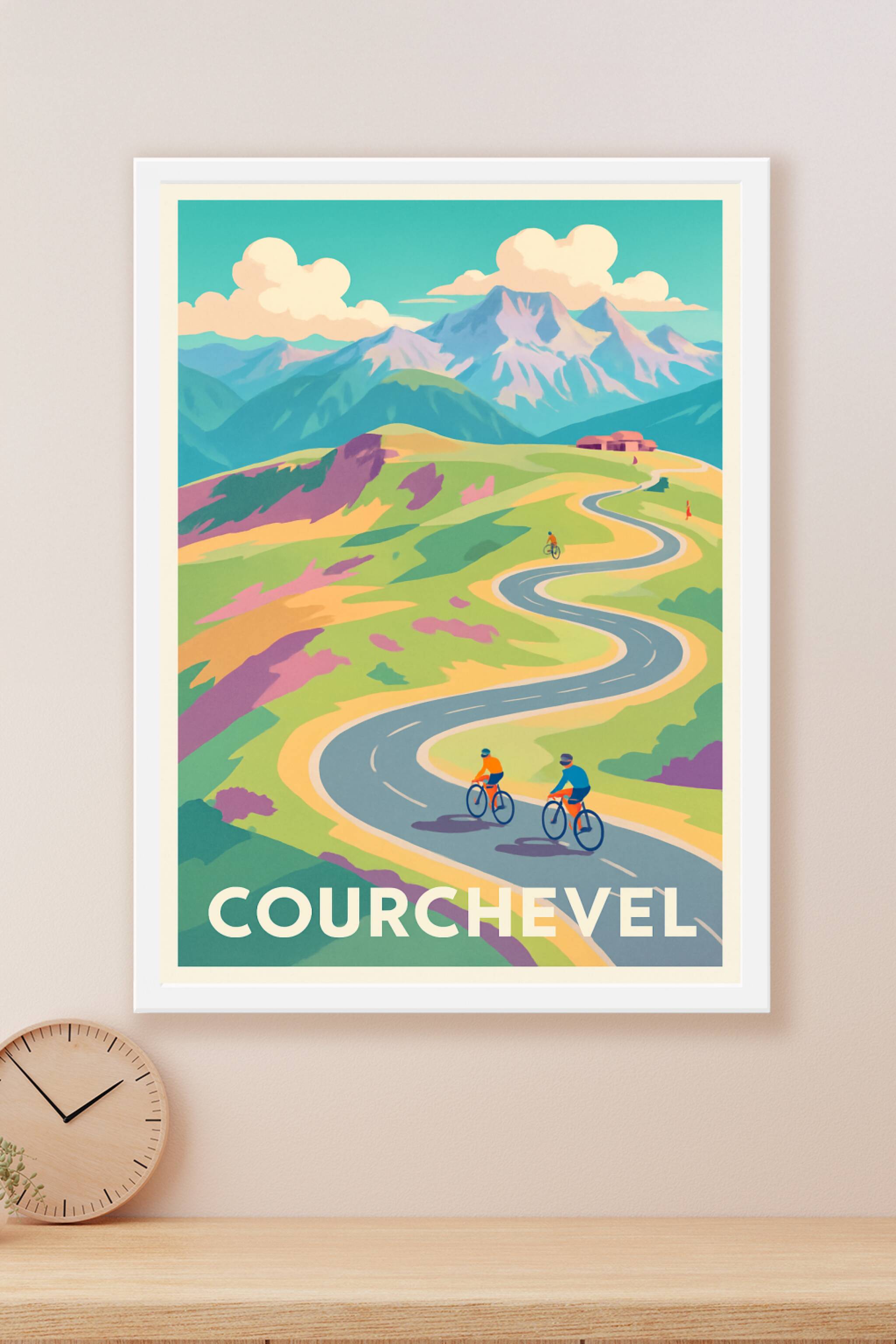 Découvrez l'énergie et la liberté des montagnes de Courchevel à travers cette affiche au style vintage et coloré. Trois cyclistes s'élancent sur un...