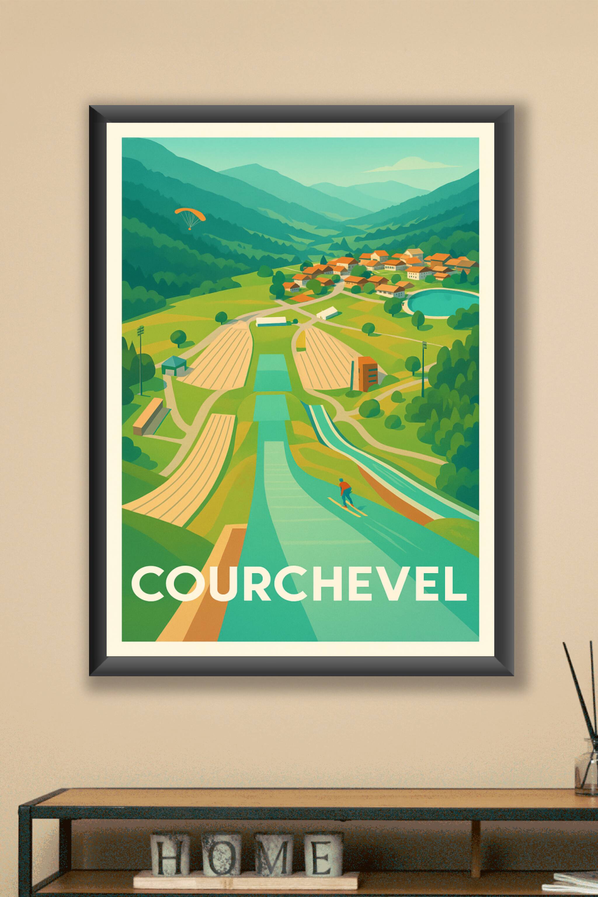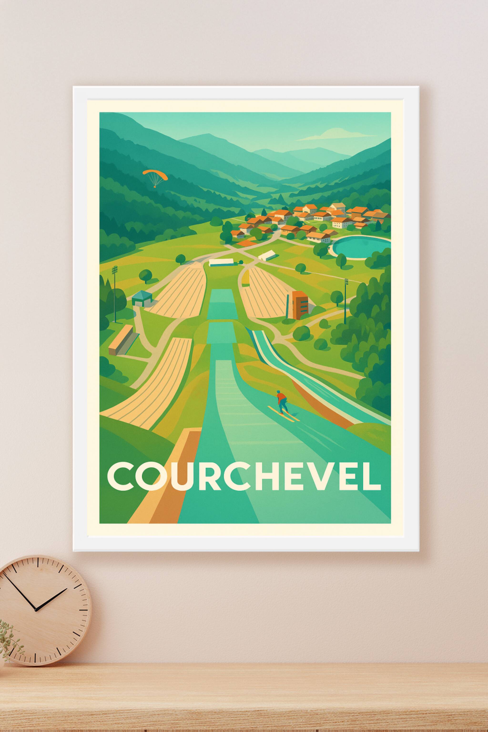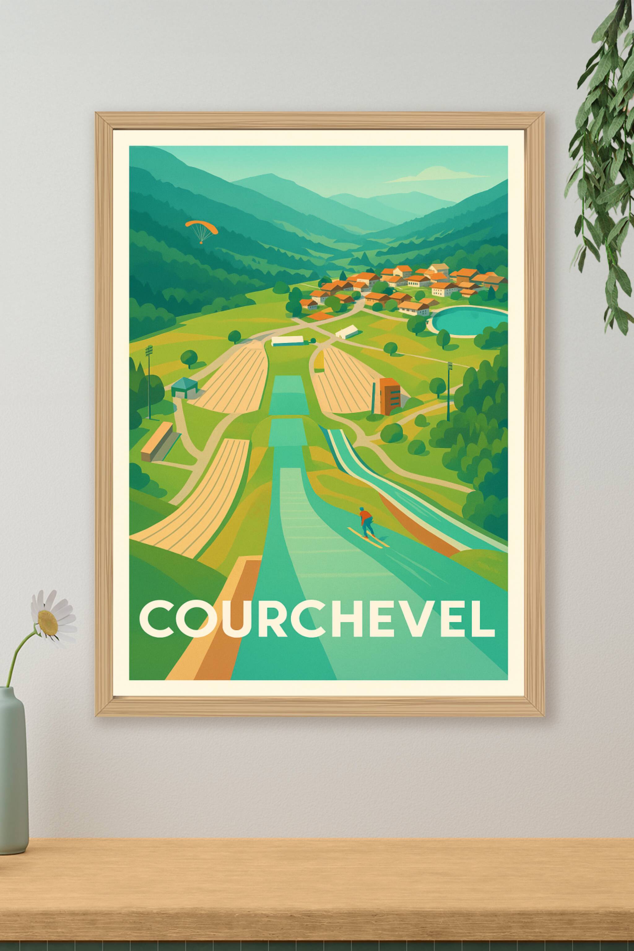 Découvrez Courchevel sous un angle original avec cette affiche illustrée au style vintage, mettant en scène les fameuses pistes de ski et le charmant village niché au cœur des montagnes. Ce poster évoque l'atmosphère paisible et sportive de la station, même hors saison, avec ses vastes espaces verts et ses paysages grandioses.Cette affiche est imprimée en tirage "Fine Art" sur un papier 305g coton de haute qualité pour garantir des couleurs lumineuses et une grande durabilité. Disponible en formats A1 à A4, avec ou sans cadre, elle s'adapte parfaitement à tous types d'intérieurs.Profitez d'une impression premium 100% fabriquée en France pour apporter une touche alpine élégante et authentique à votre décoration ou pour offrir un cadeau raffiné aux passionnés de montagne.