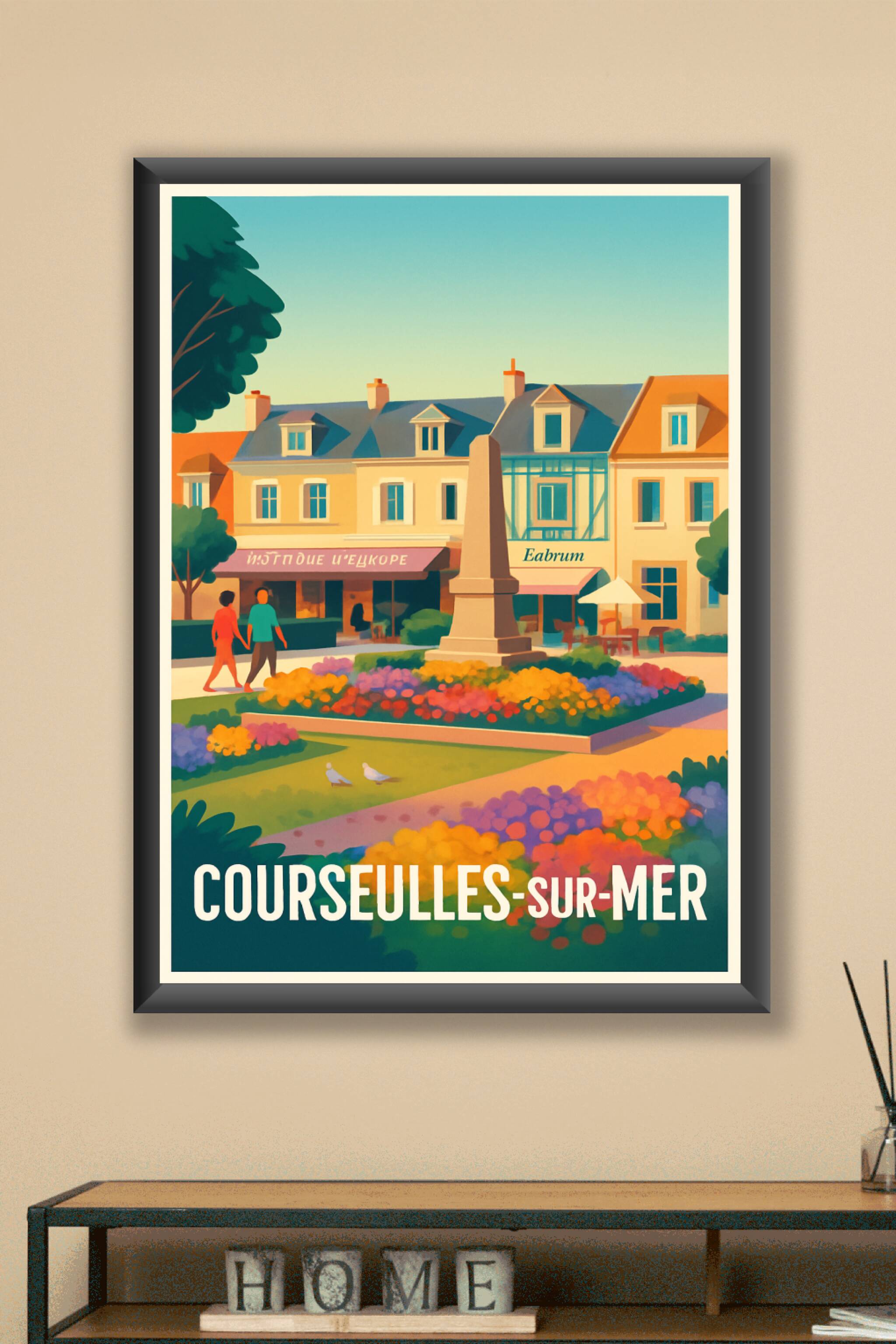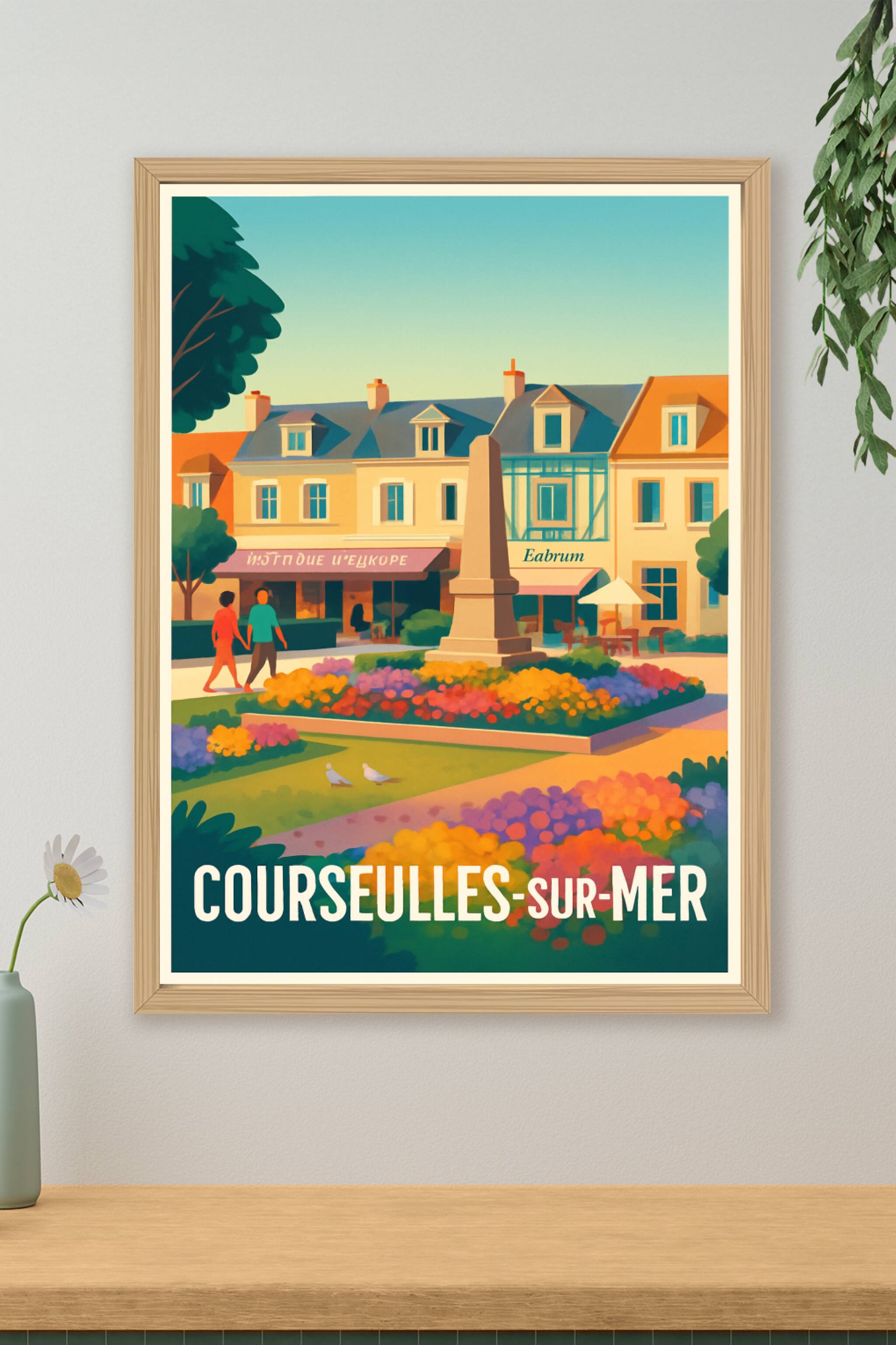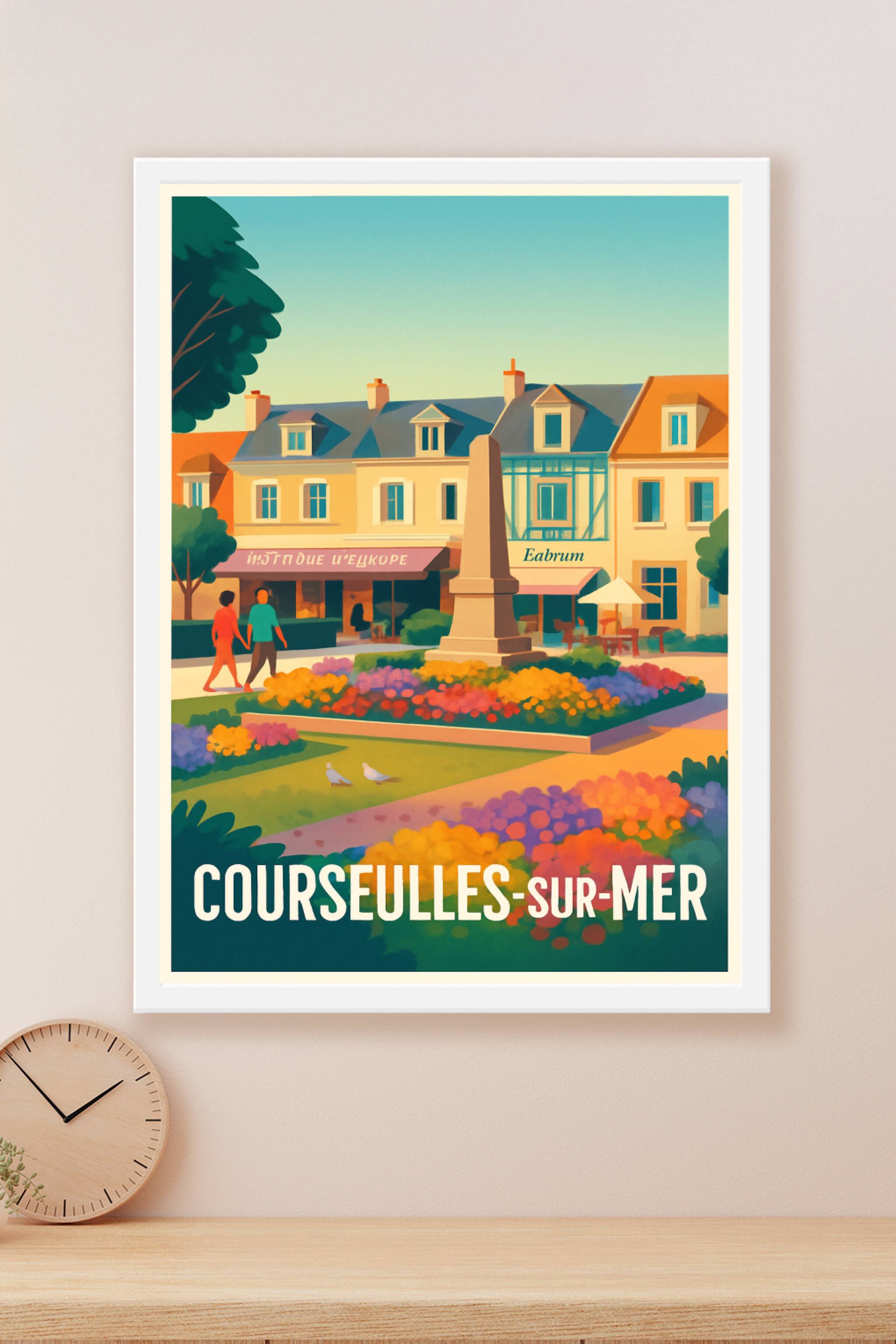 Découvrez l'élégance tranquille de Courseulles-sur-Mer avec cette affiche qui capture une place colorée et son ambiance paisible au cœur de la Norm...