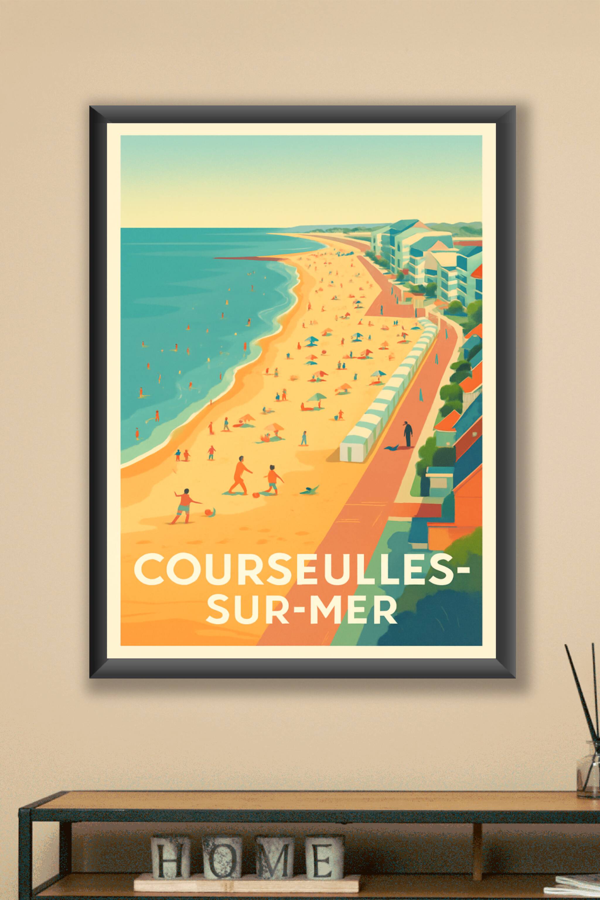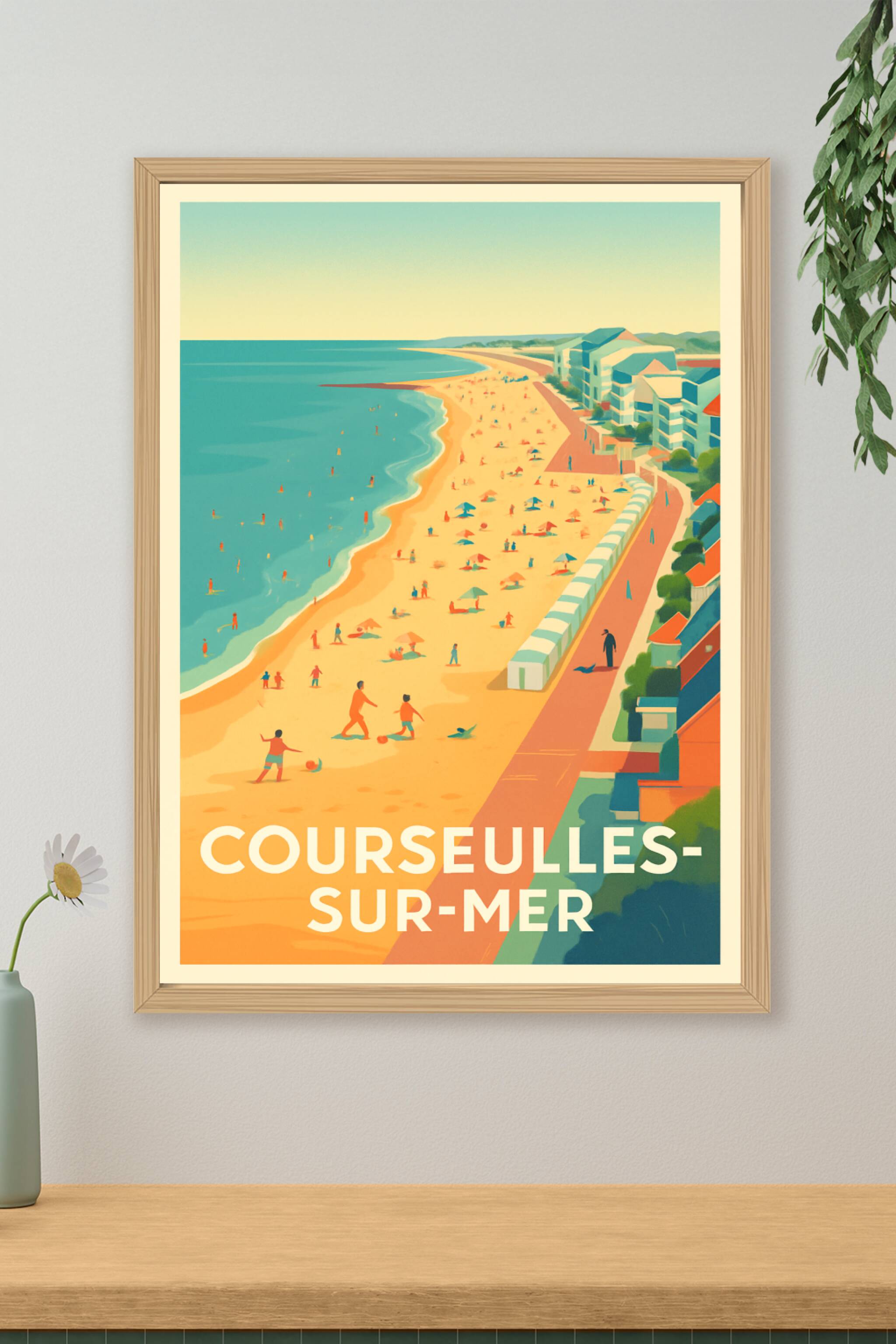 Apportez une touche d'été et de douceur normande à votre intérieur avec cette affiche illustrée de Courseulles-sur-Mer, où la plage et la promenade...