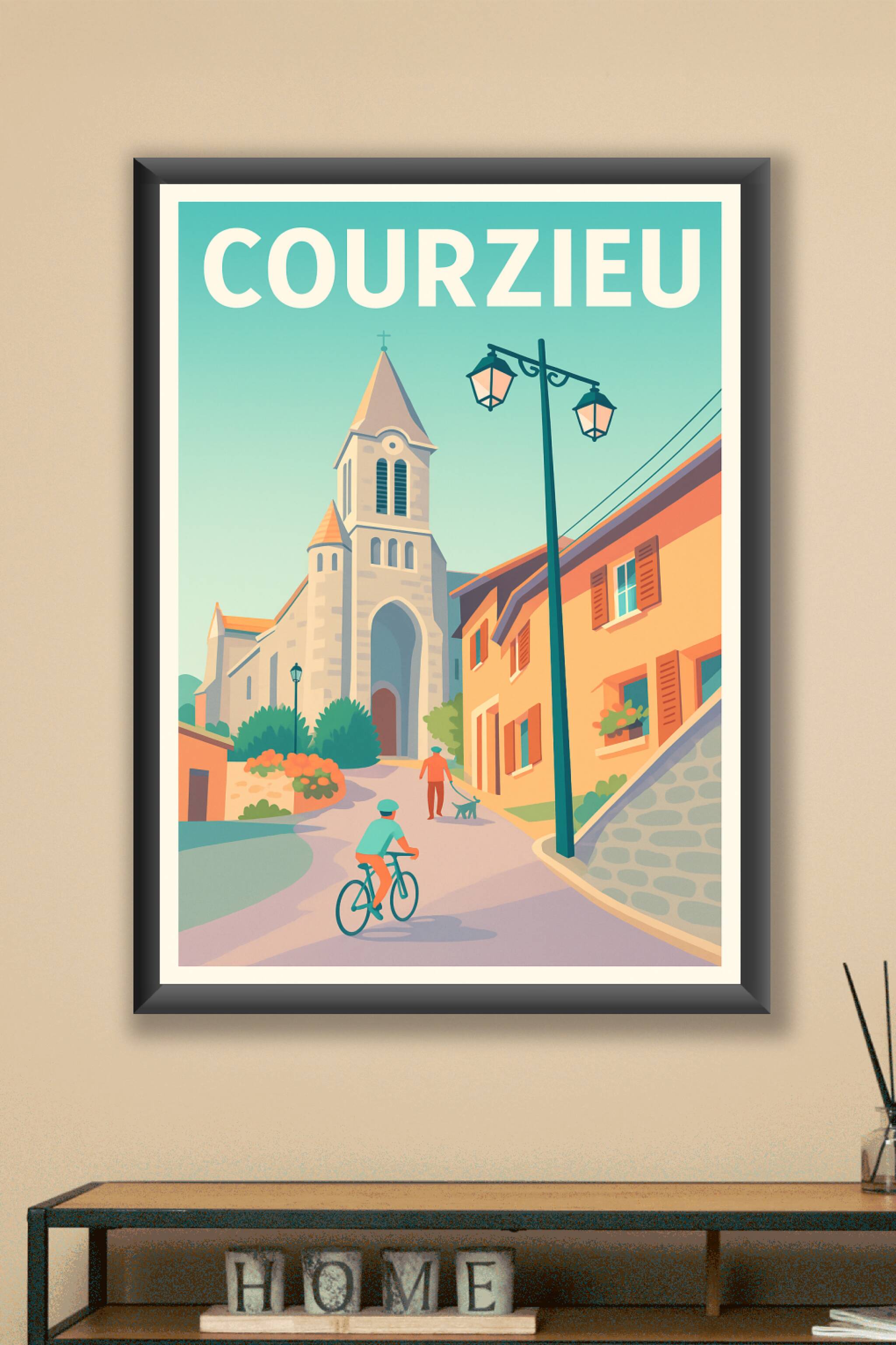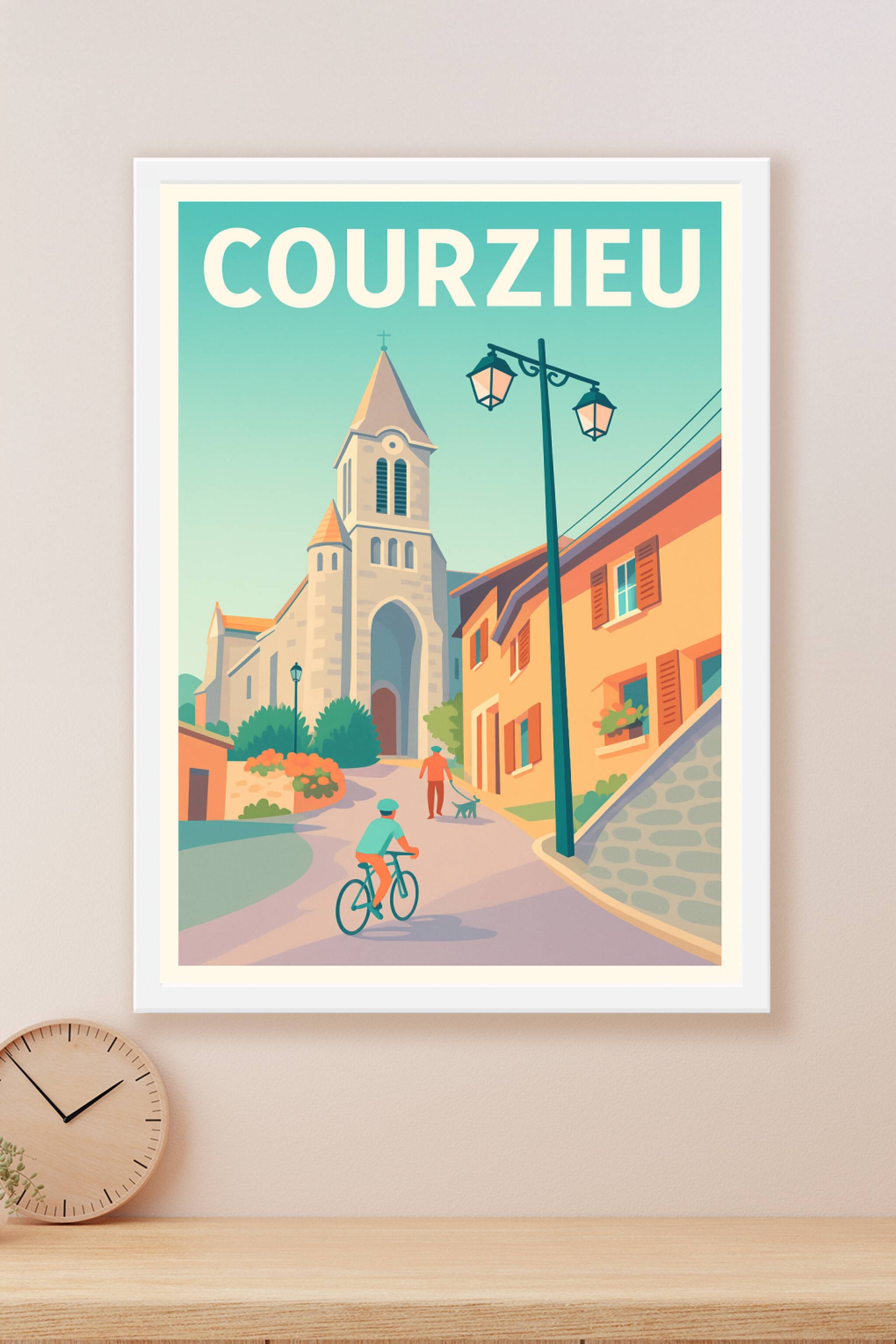 Découvrez le calme et la douceur de vivre à Courzieu avec cette affiche illustrée représentant une rue pittoresque bordée de maisons chaleureuses et l'imposante église du village. Le poster capture l'ambiance paisible d'une promenade en vélo et une balade avec un chien sous un ciel dégagé.Cette affiche est imprimée en tirage Fine Art sur papier coton 305g, garantissant une qualité d'impression exceptionnelle et des couleurs éclatantes. Disponible en formats A1 à A4, avec ou sans cadre, ce poster est idéal pour apporter une touche de sérénité et d'authenticité à votre décoration intérieure. Profitez d'une fabrication 100% française pour embellir votre espace ou offrir un souvenir unique de Courzieu.